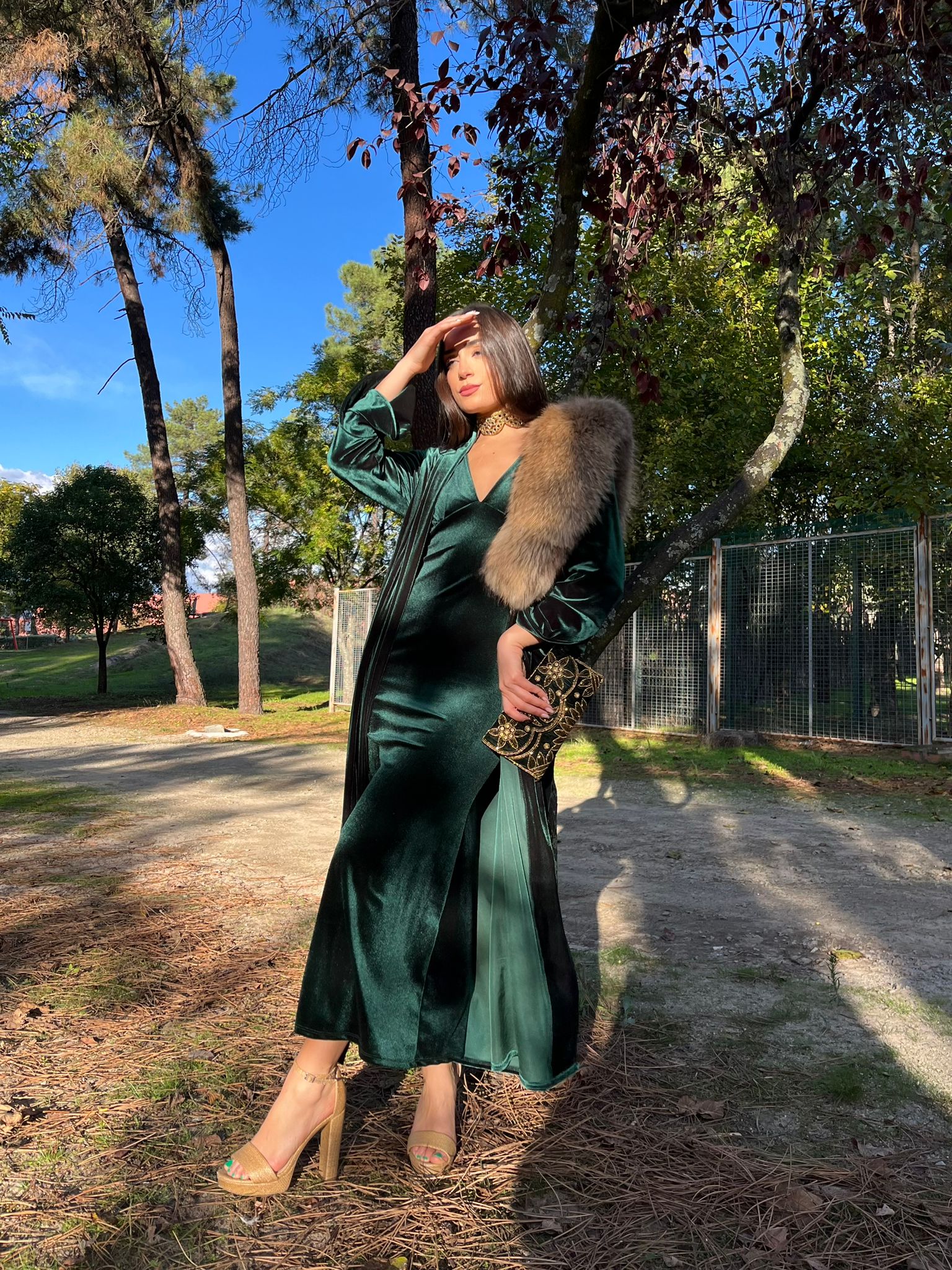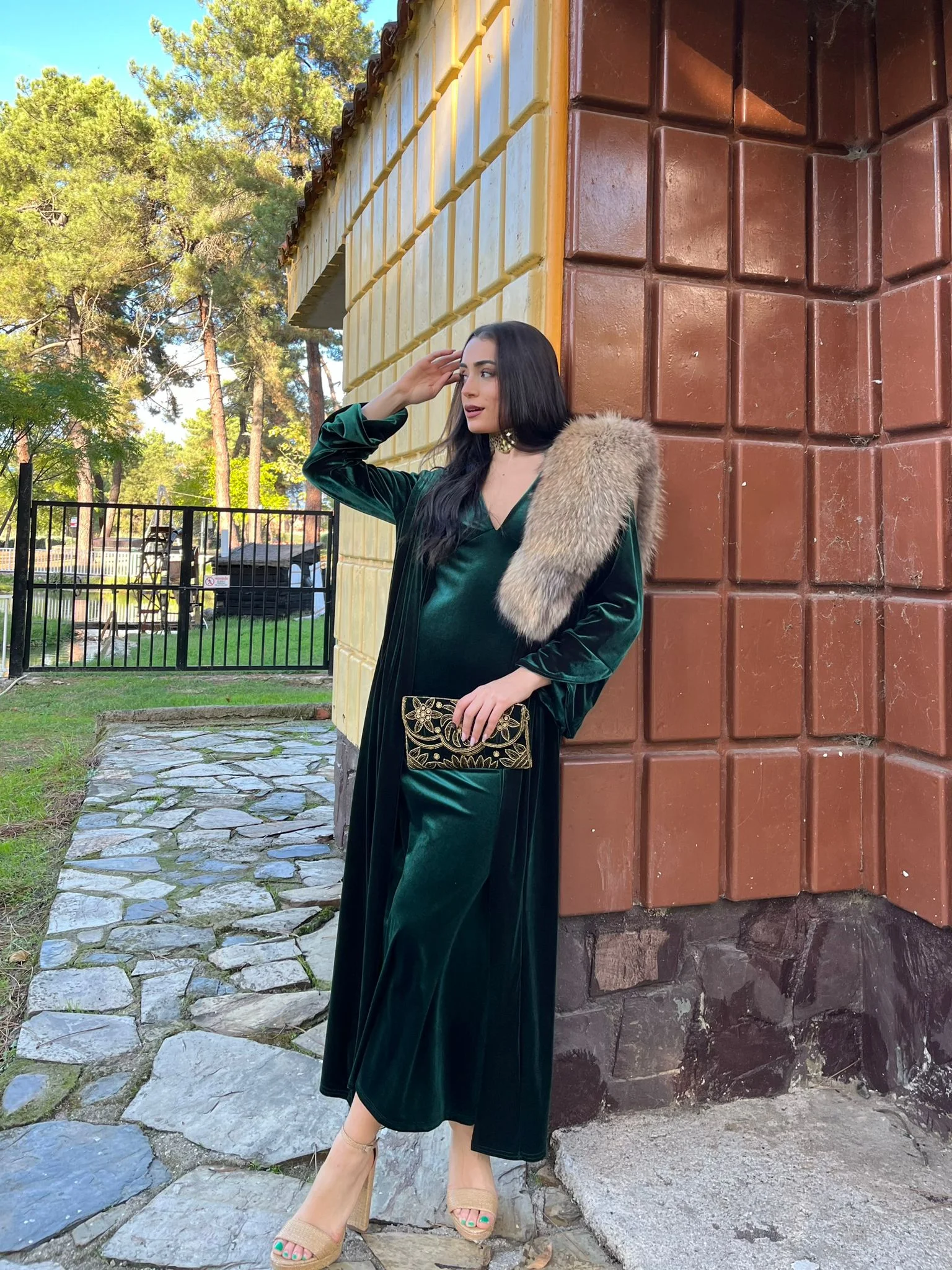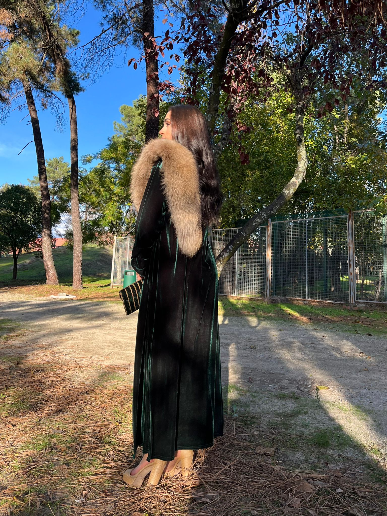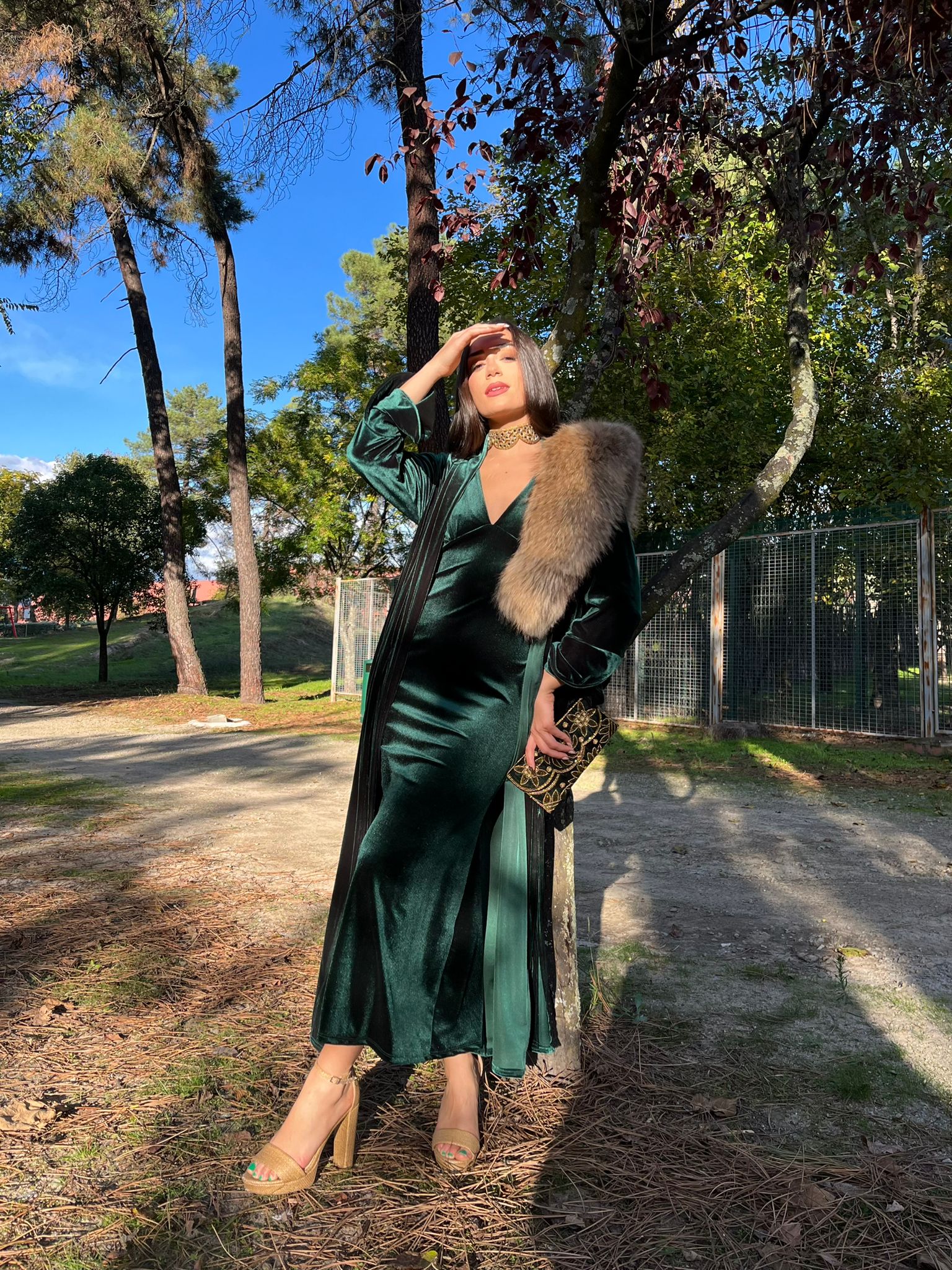Abrigo largo fluído en terciopelo, manga acampanada y aberturas laterales.