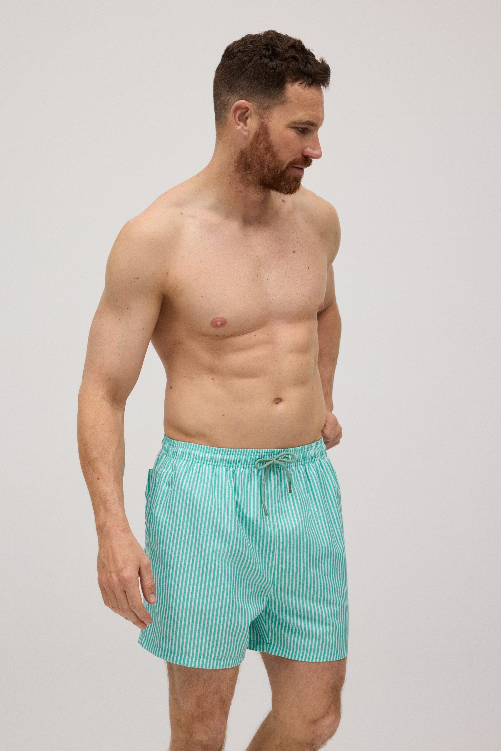 Su diseño de rayas verticales aporta un toque fresco y moderno, disponible en tres colores vibrantes: azul atlántico, coral y verde turquesa. La cintura elástica con cordón ajustable asegura un ajuste cómodo, mientras que los bolsillos laterales y traseros lo convierten en una opción práctica para el día a día.