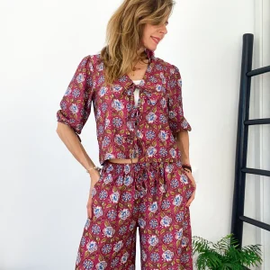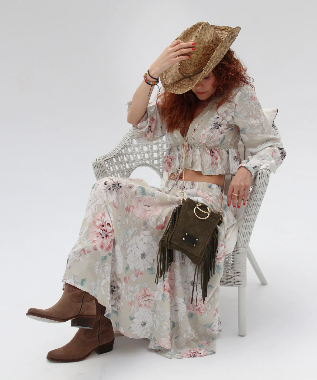 Blusa de manga larga a conjunto con falda larga de estampado floral. Estilo Boho. Camisa corta cuello V y ajustable en el pecho. Falda larga suelta de vuelo y cintura ajustable con goma.