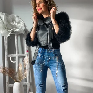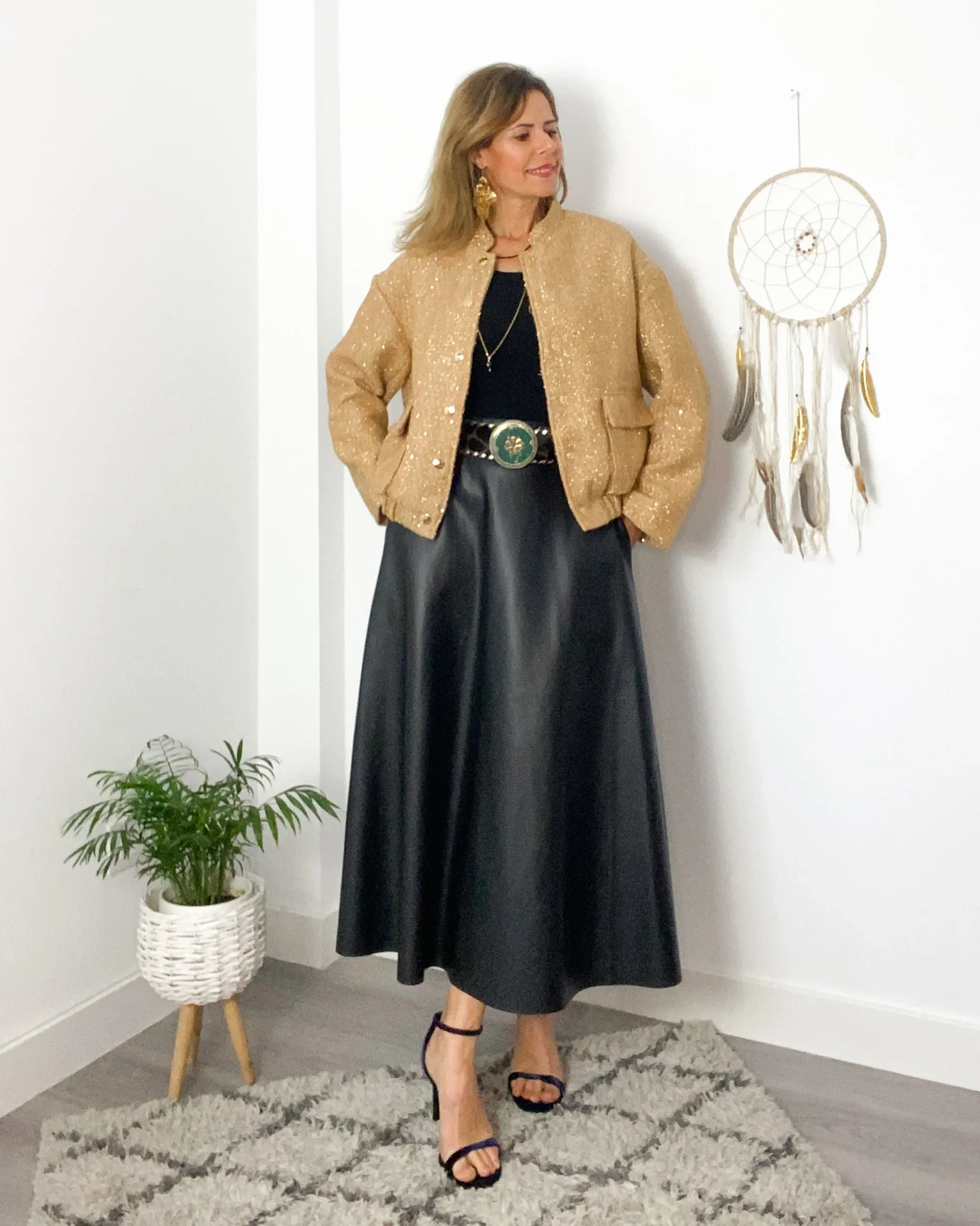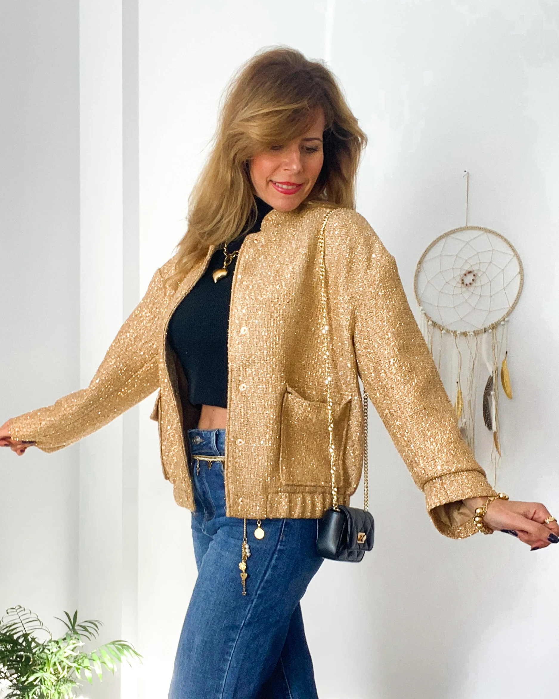 Cazadora bomber camel con lentejuela pequeña dorada y hilo dorado. Bolsillos delanteros con solapa. Cuello y cintura de goma.