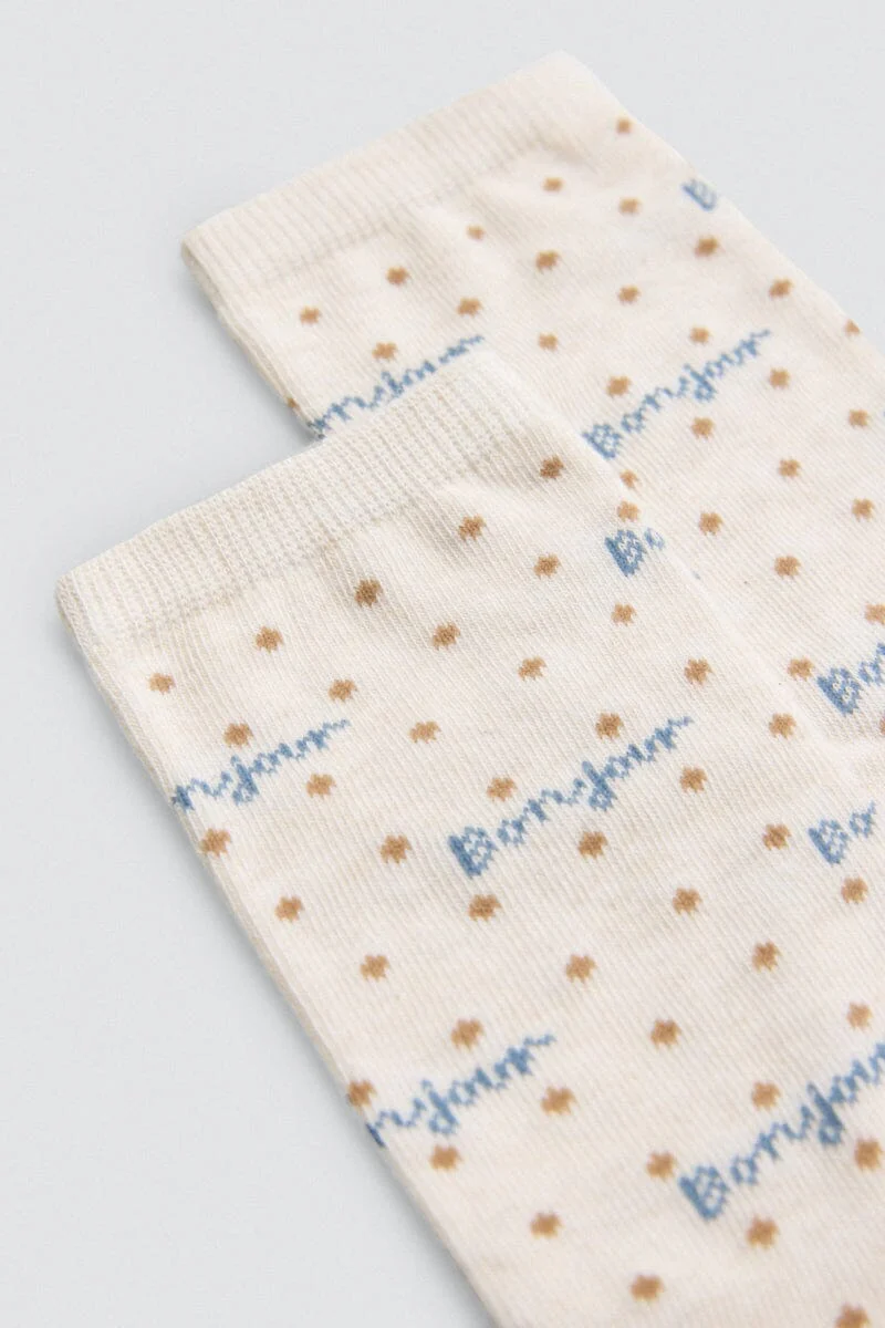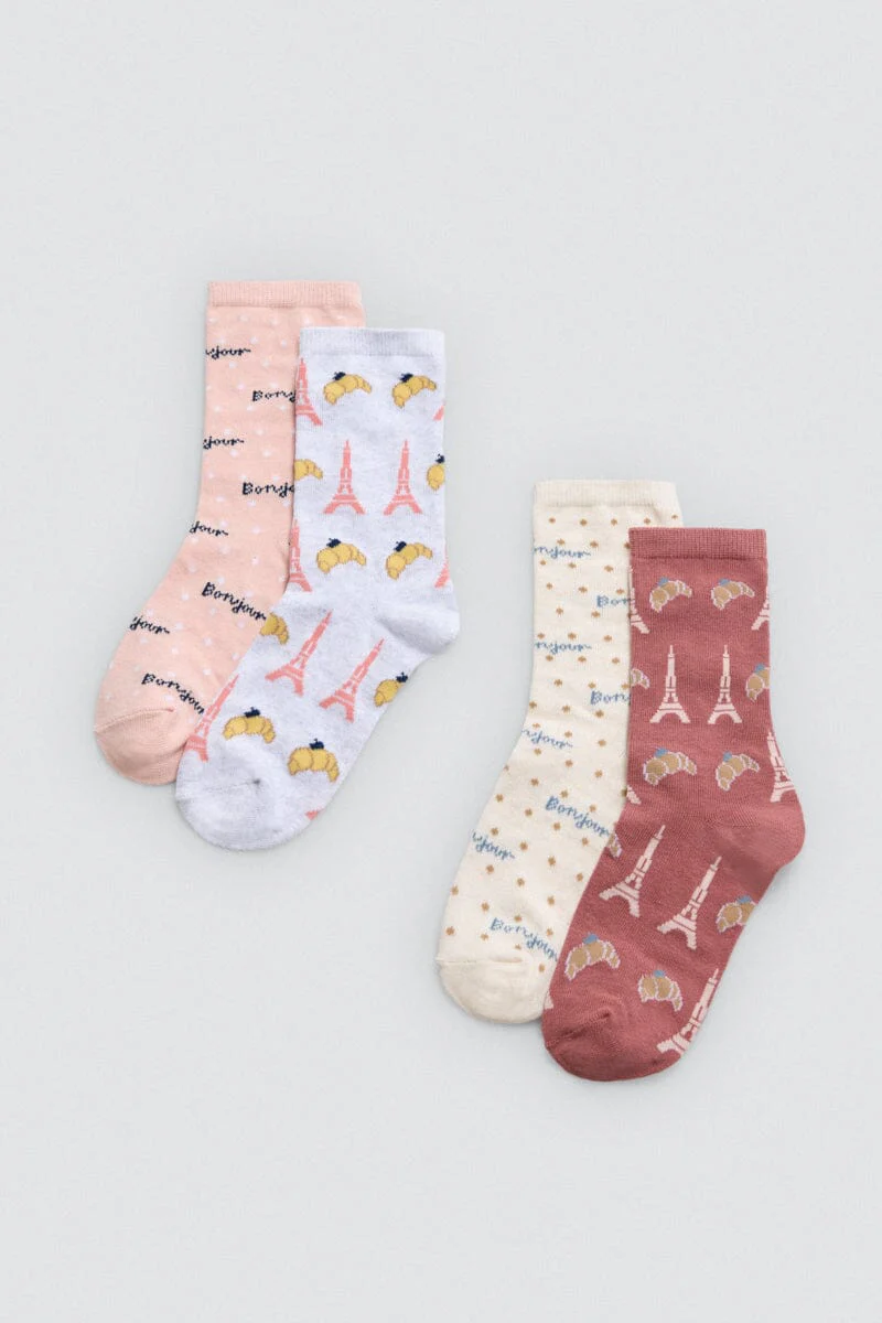 Un toque divertido y parisino para cada día. El pack de 2 calcetines para niña Ref. 32574 está diseñado con estampados de inspiración francesa, con la Torre Eiffel, croissants y la palabra «Bonjour».