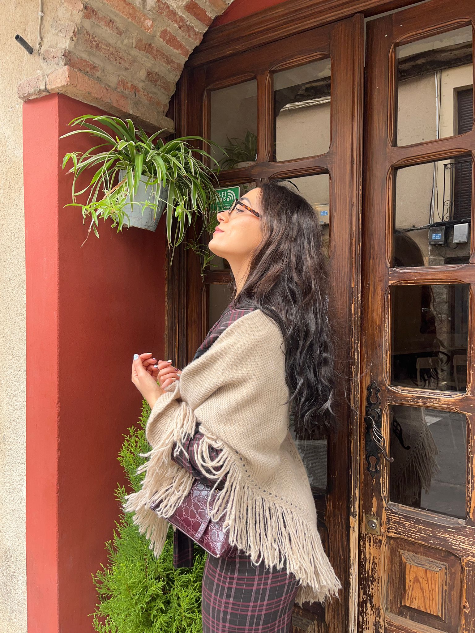 Capa poncho en punto en triángulo y terminado en flecos. Un modelo de capa ideal para los eventos de este otoño/invierno, abrígate con un plus de estilo y tendencia.