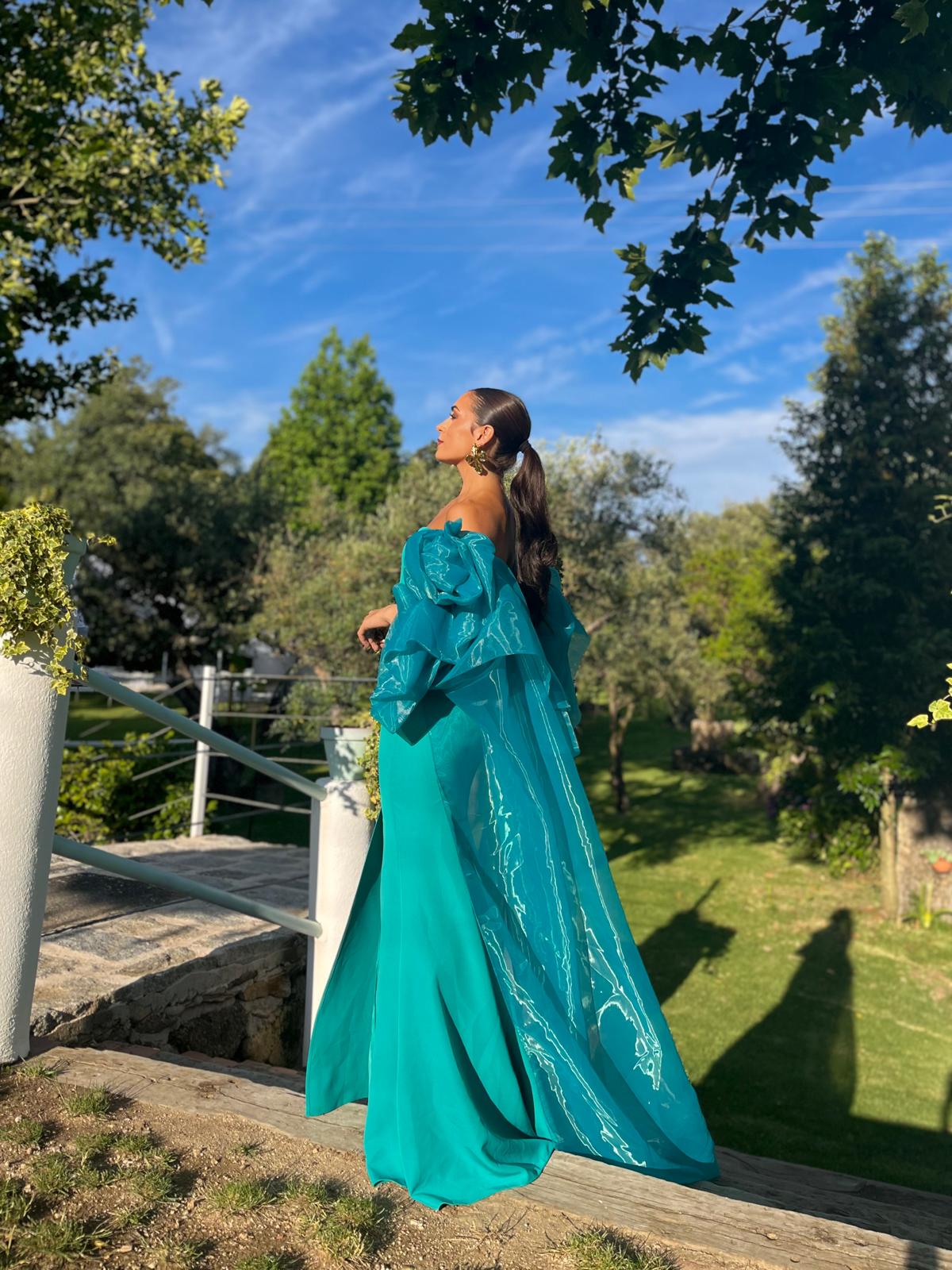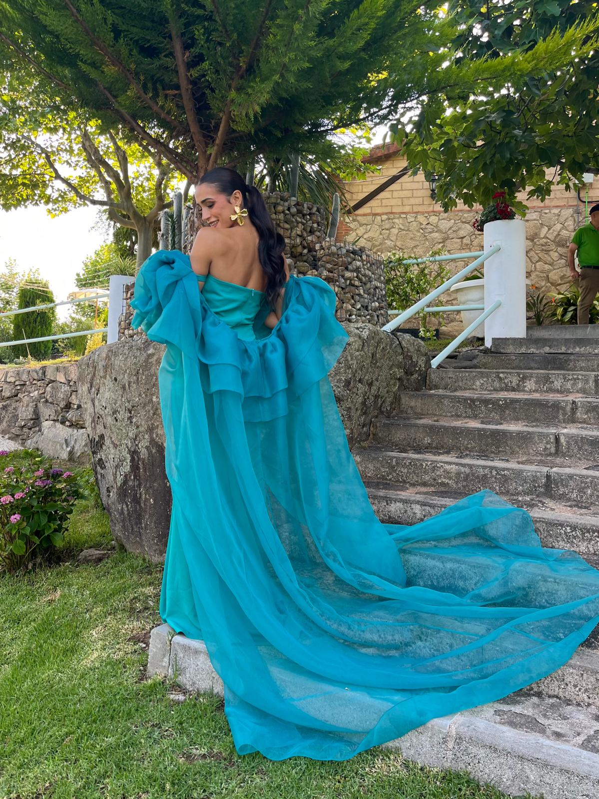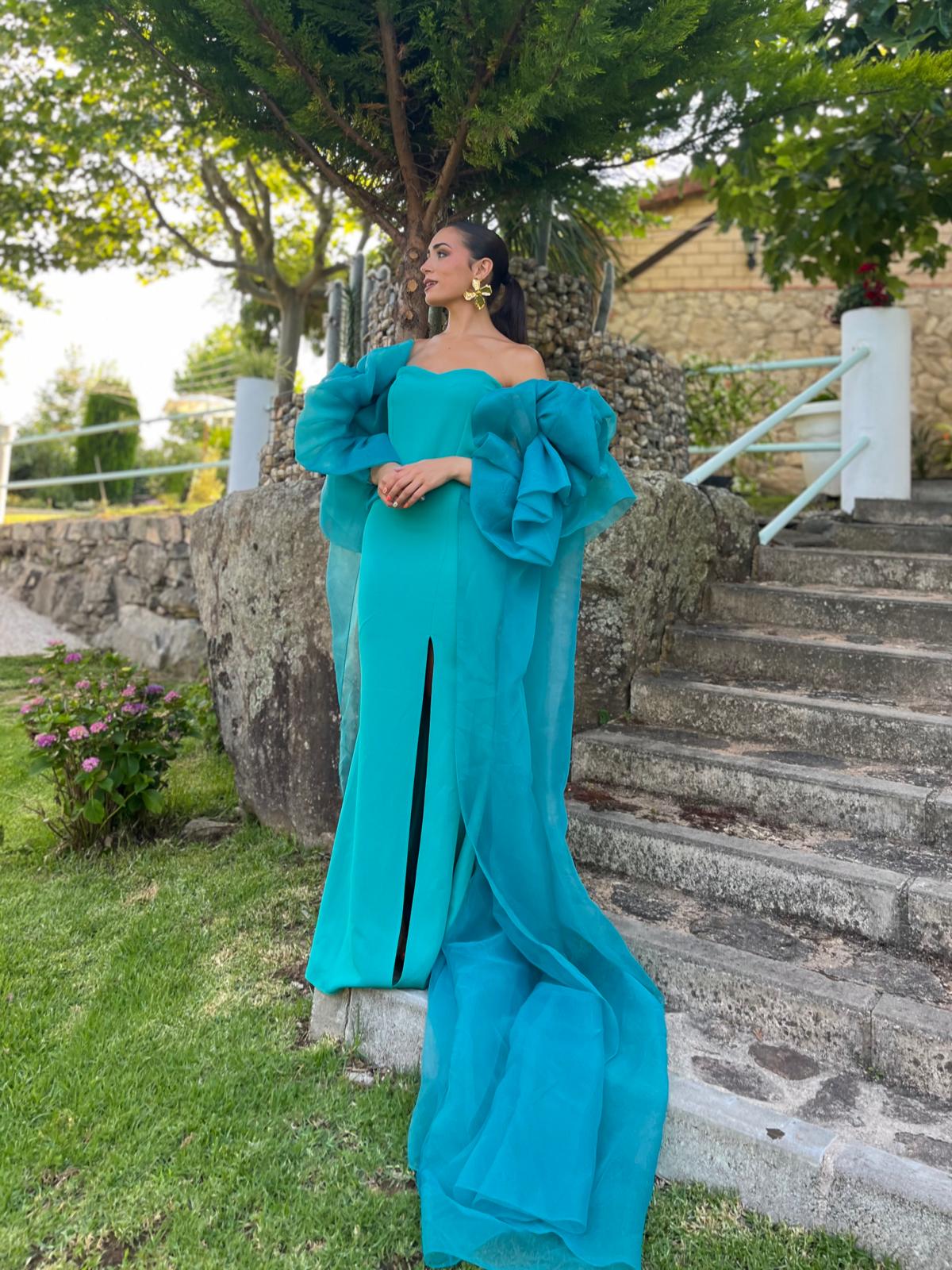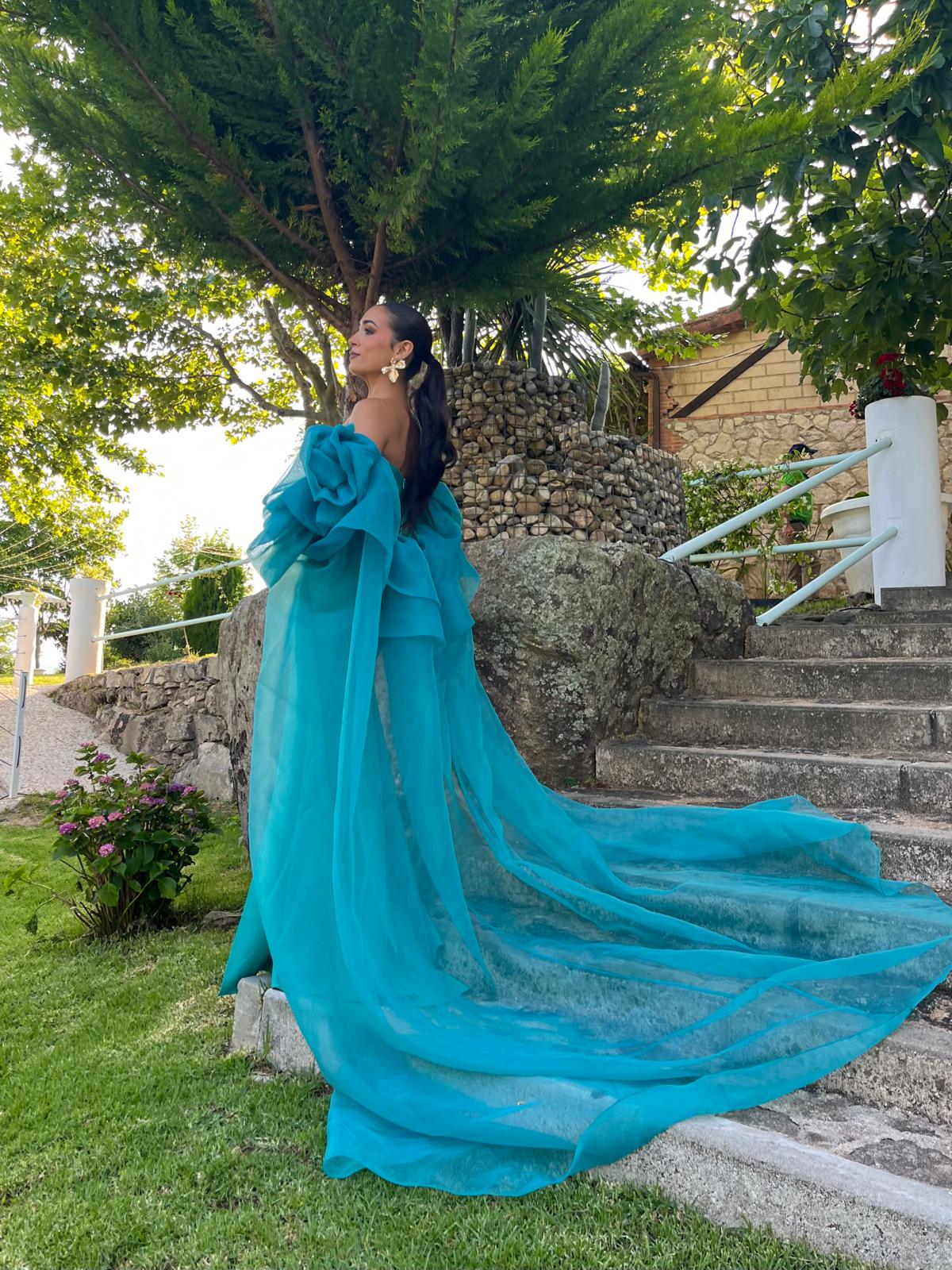 Confeccionada en organza, con mangas abullonadas y larga cola, sujeta a los brazos y cayendo sobre la espalda en volante trasero y efecto flor en los brazos.