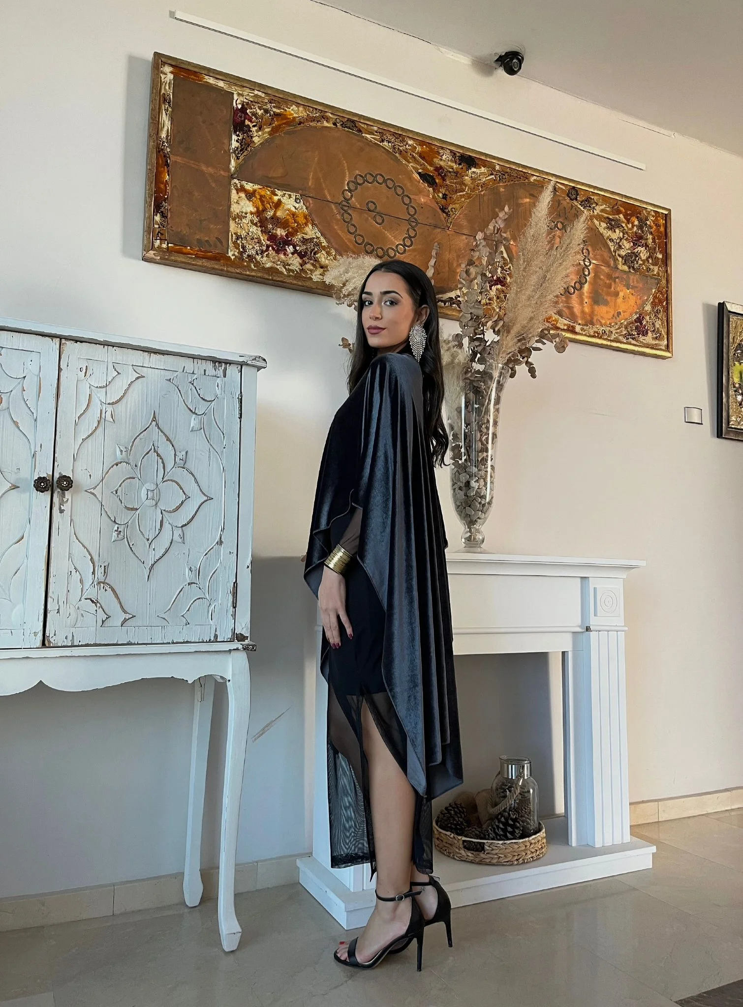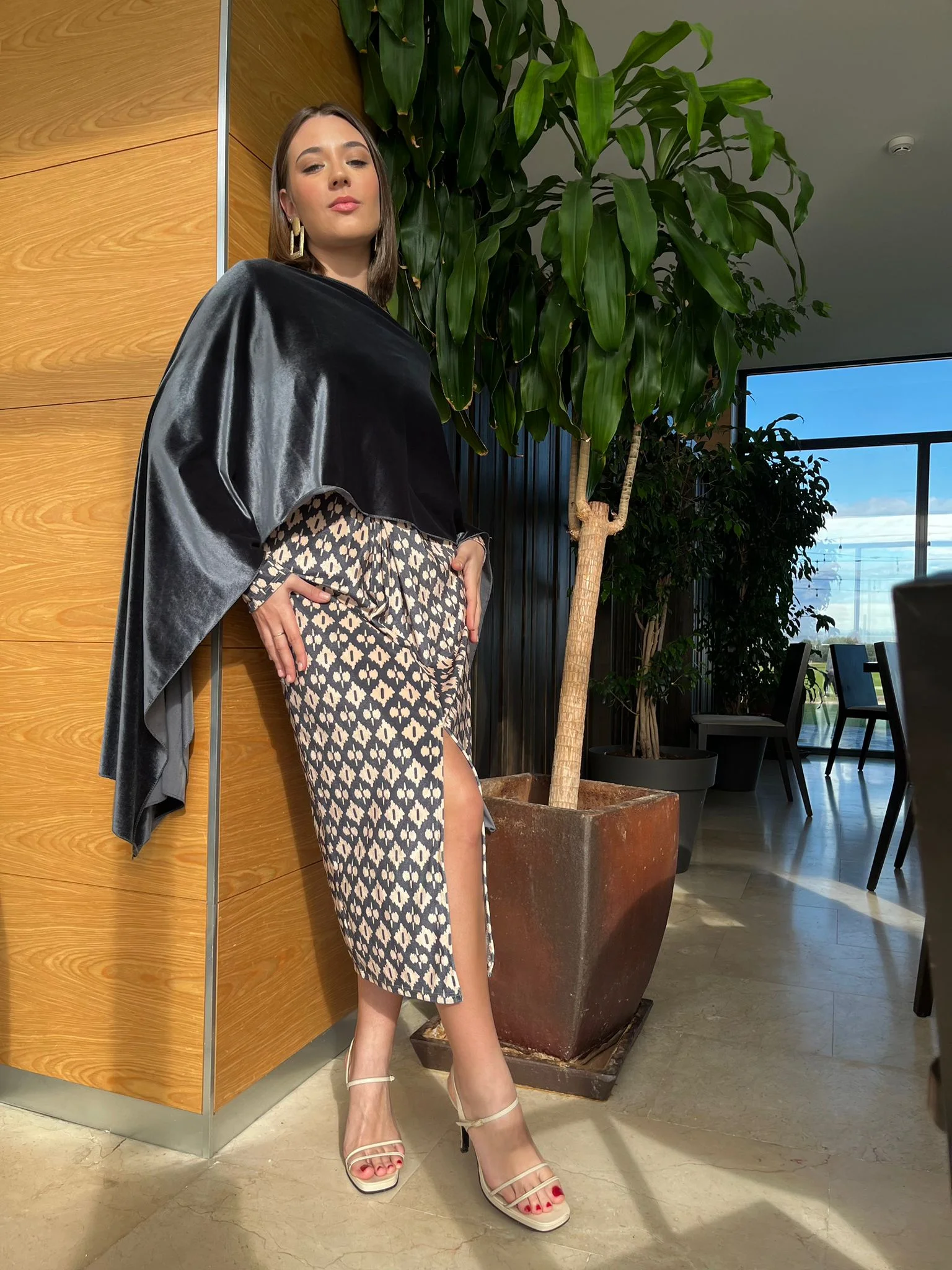 Capa en suave terciopelo, ideal para combinar con vestidos al tono para un look de invitada perfecta de invierno.