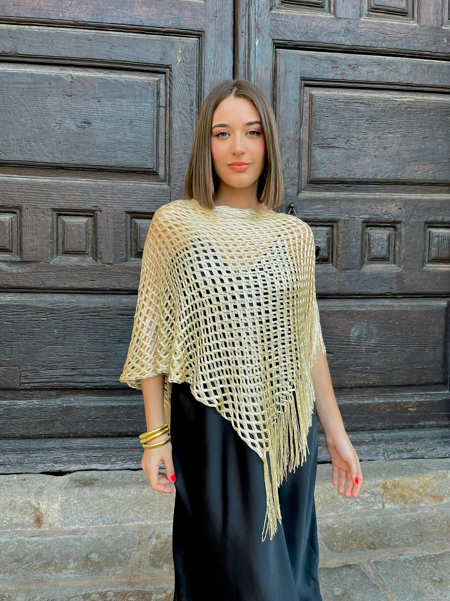 Chal, echarpe en rejilla metalizado, que podrás colocar de infinitas maneras, como kimono, como capa, como chal, como foulard….
