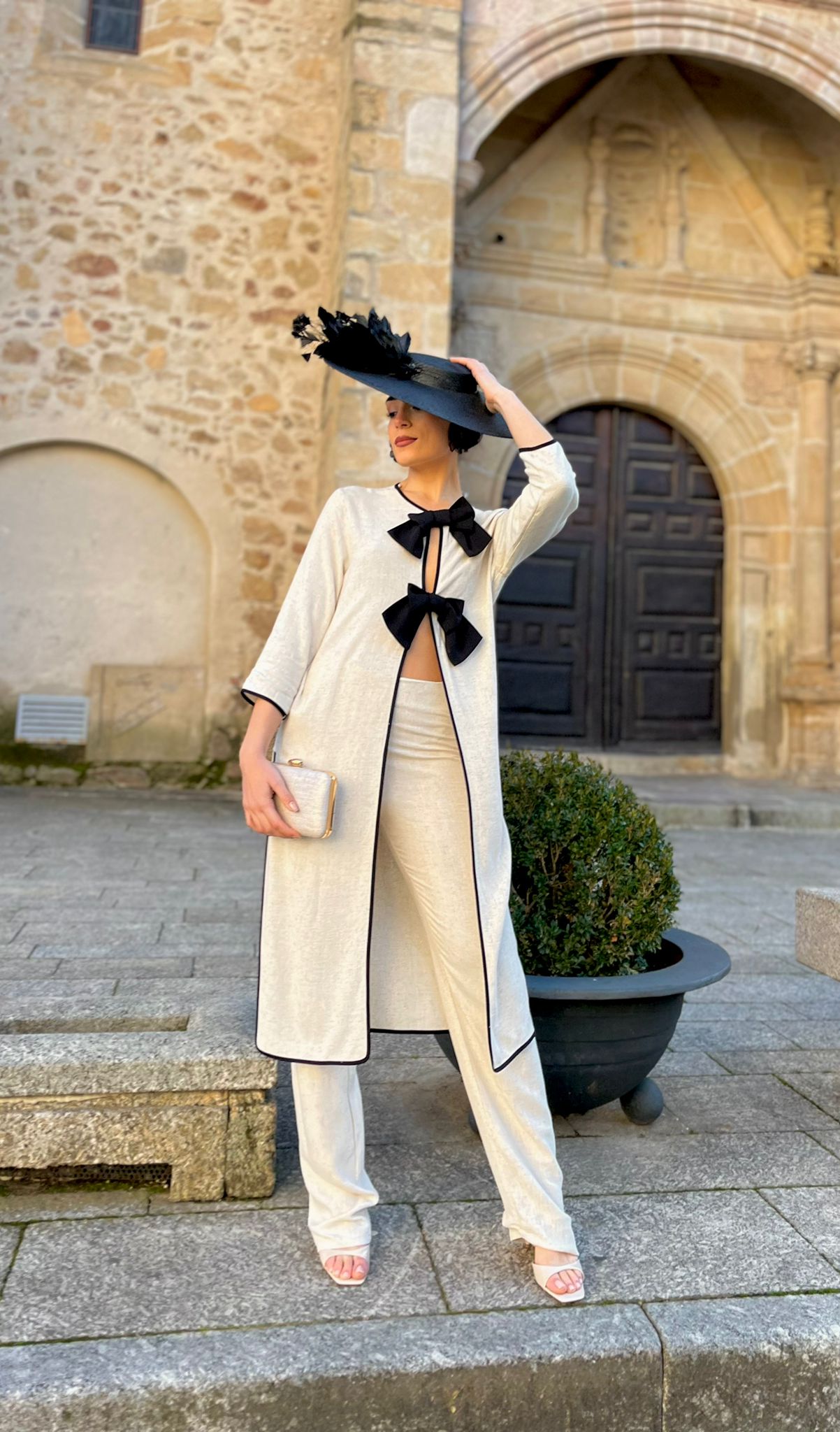 Elegante casaca larga con manga francesa en lino color hueso y ribeteada en negro y lazadas delanteras en negro,