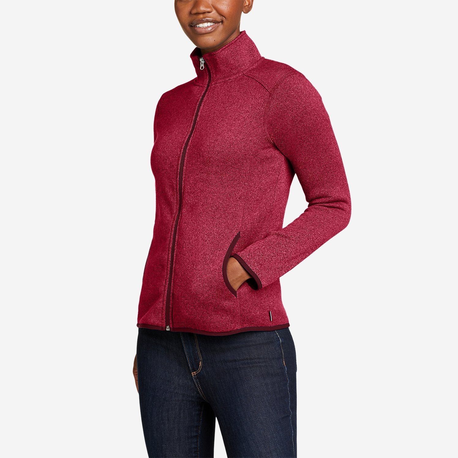 Con su textura similar a la de un suéter en el exterior y su interior suave y cepillado, este modelo con cremallera completa es una opción cálida y elegante para el clima frío.