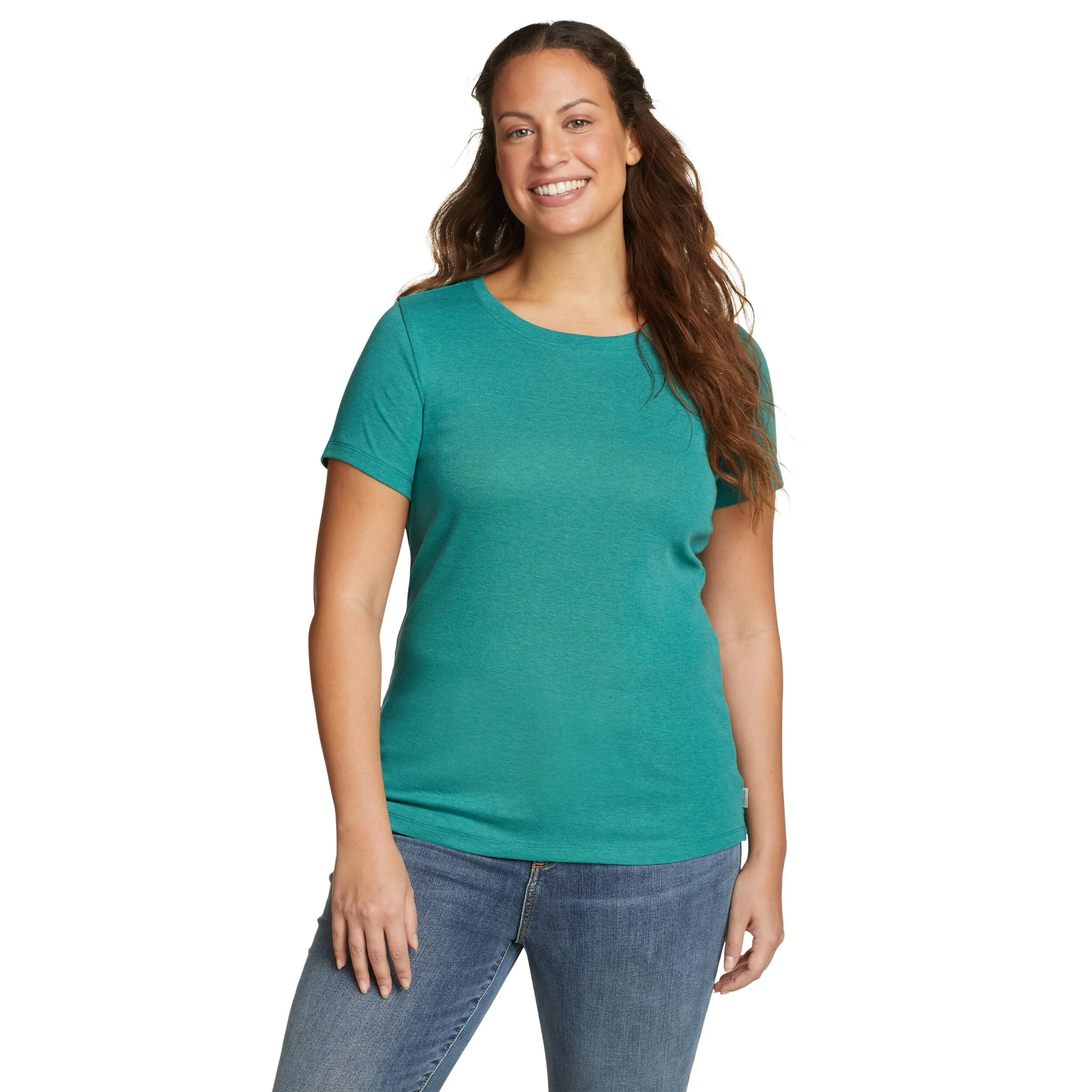 El suéter de manga corta para mujer «Favorite Crew» de Eddie Bauer es una prenda básica y versátil, ideal para el uso diario. Su diseño de cuello redondo y manga corta lo convierte en una opción cómoda y ligera para climas cálidos o como capa base en climas más fríos.