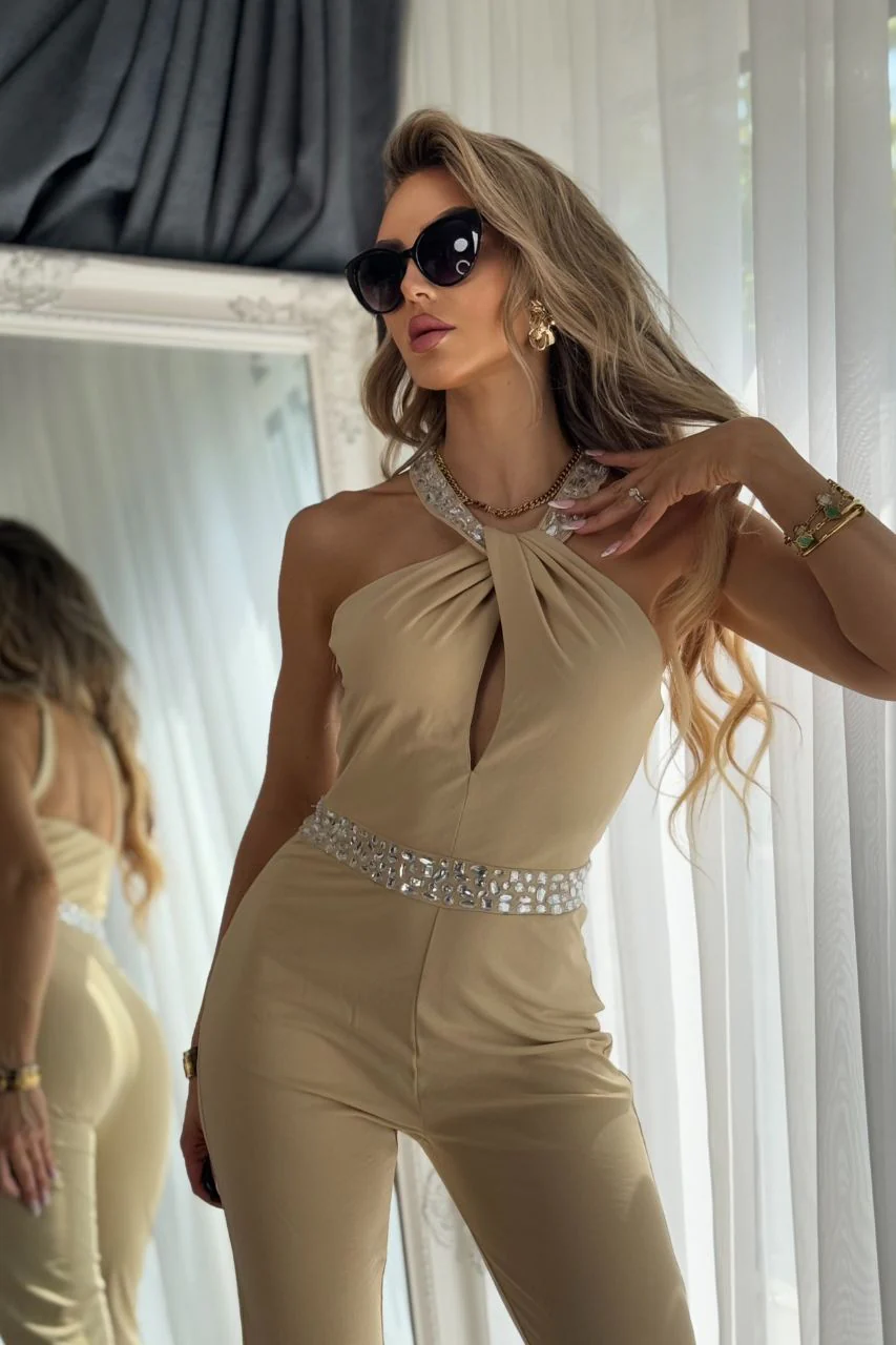 Este enterizo beige es una obra de elegancia y sofisticación. Su diseño sin mangas con escote halter realza la silueta con un aire refinado, mientras que la abertura en el centro del pecho añade un toque de sensualidad sutil. La cintura está adornada con una banda de pedrería plateada, que aporta un brillo delicado y eleva la presencia del conjunto. ✨