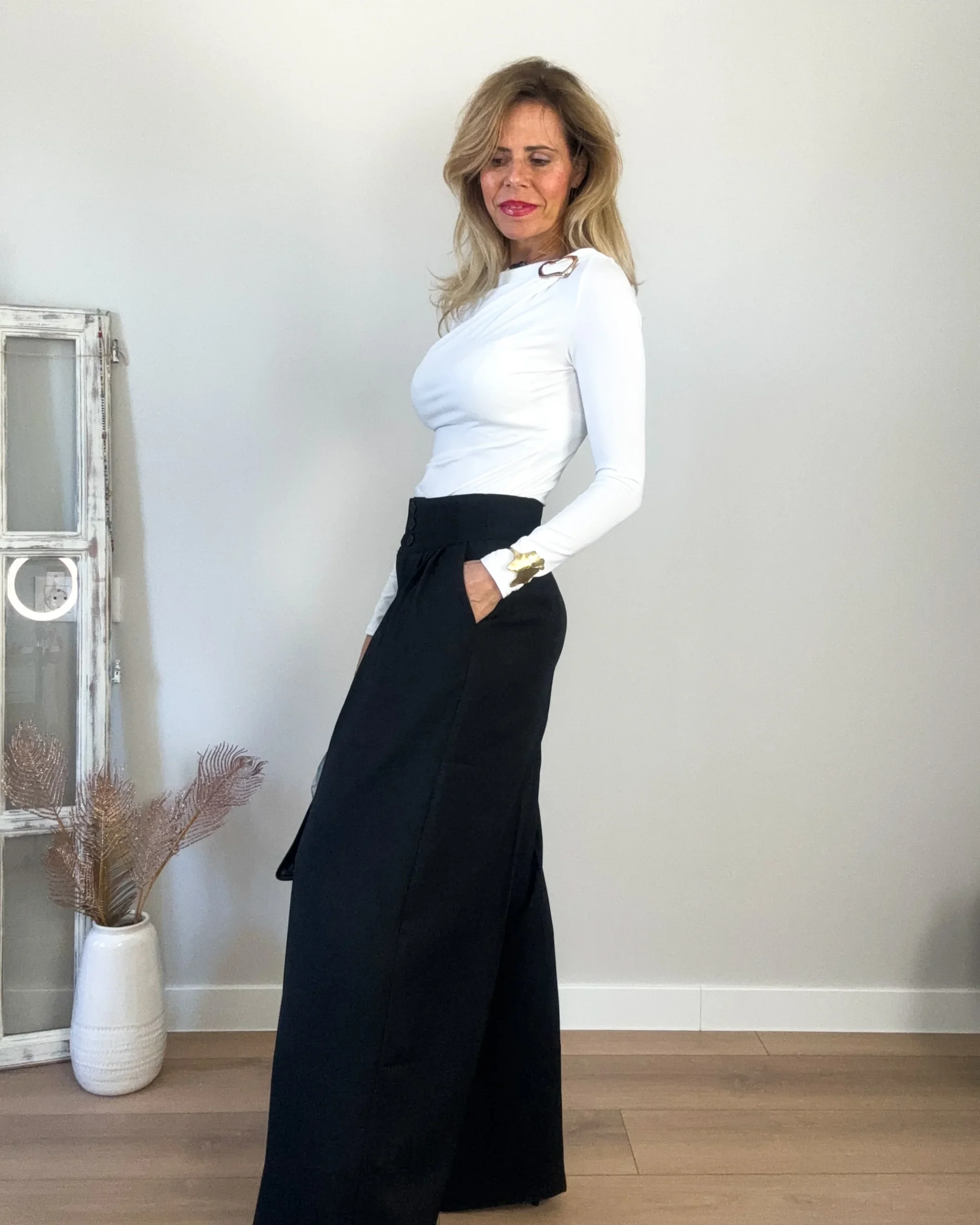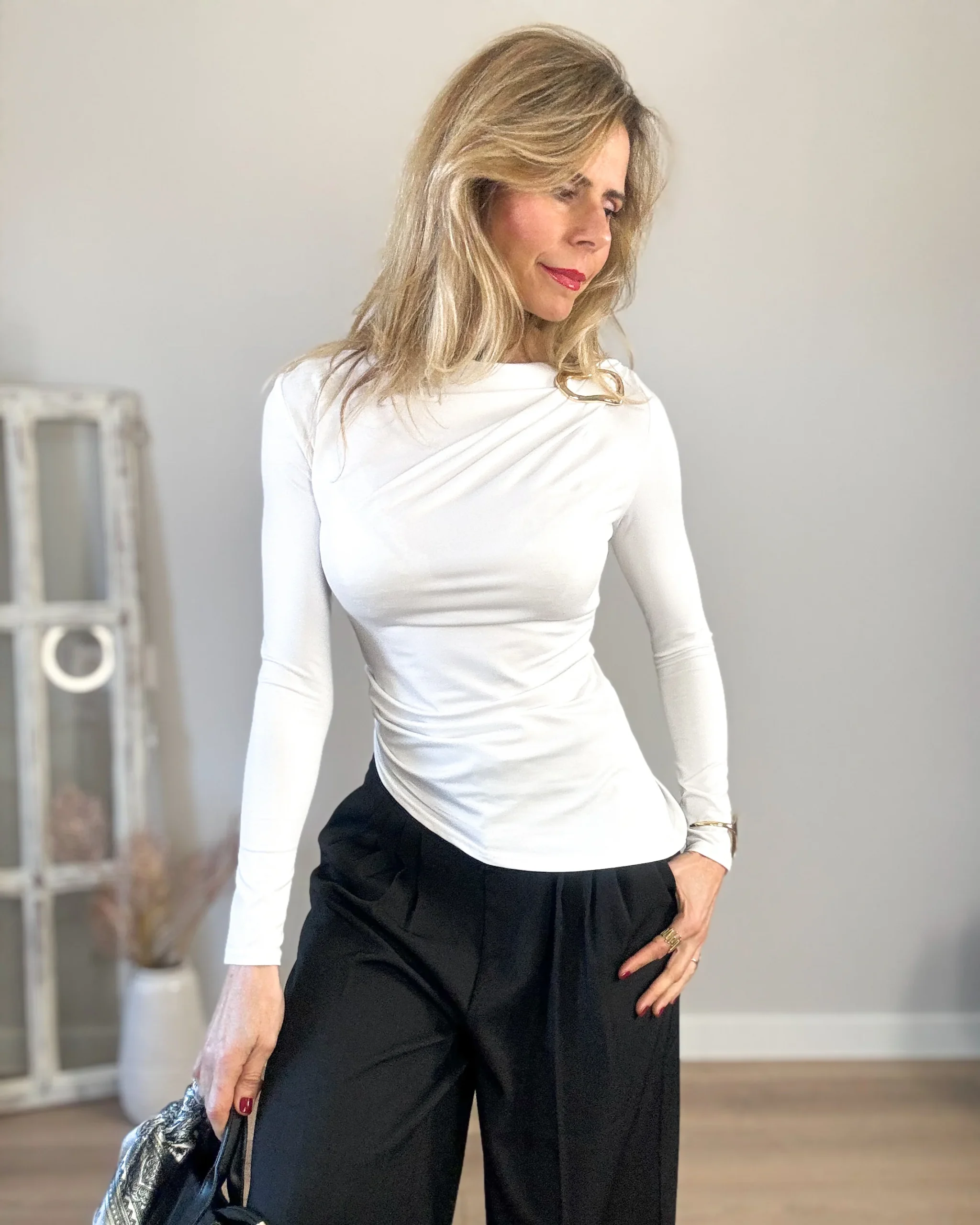 Camiseta blanca tipo licra de manga larga. Decorada en el hombro con anilla dorada. Corte desigual. Punto elástico.