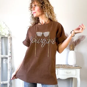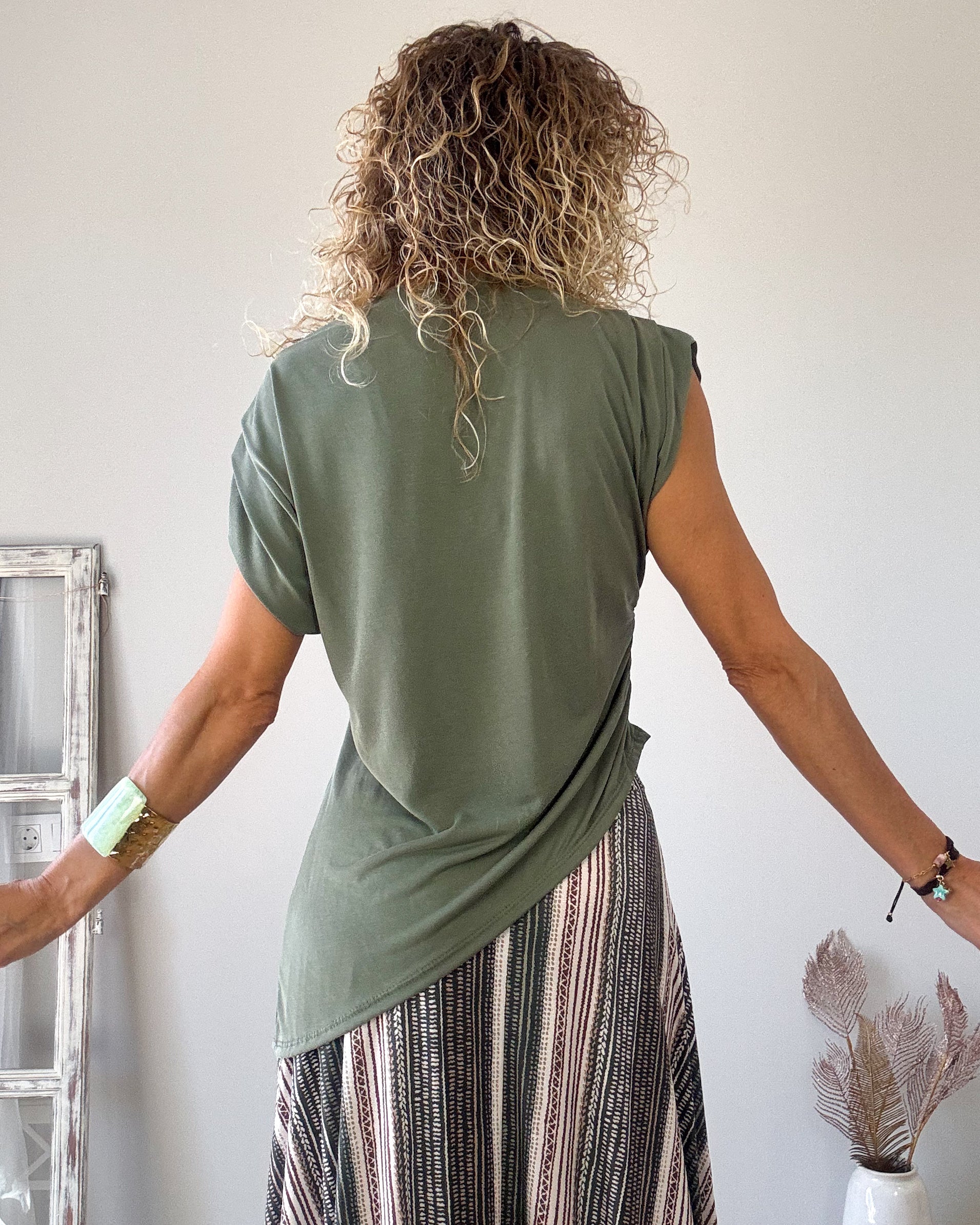 Camiseta verde caqui, escote barco y corte ajustado. Drapeada en los lateral. Manga algo fruncida y desigual. Punto elástico.
