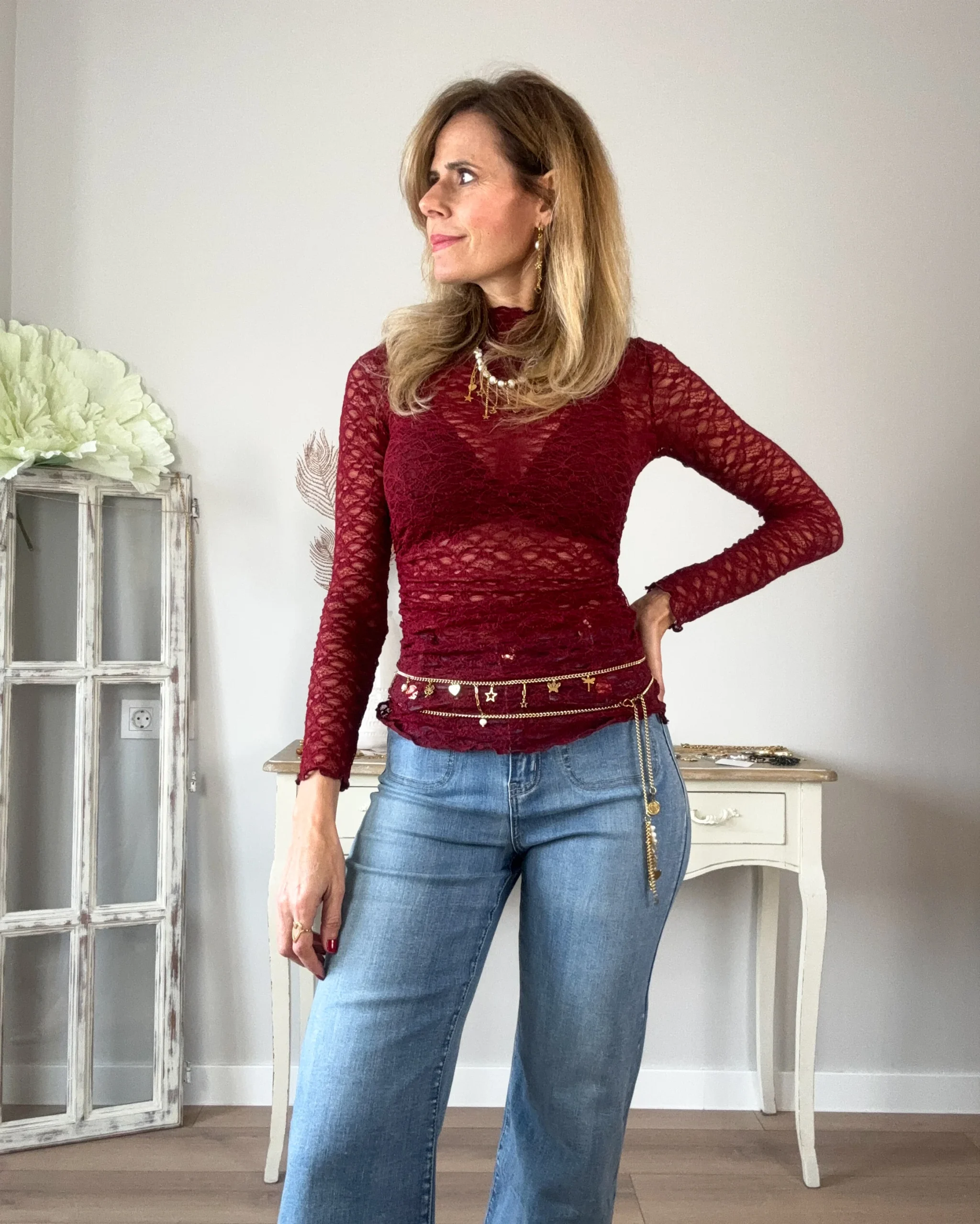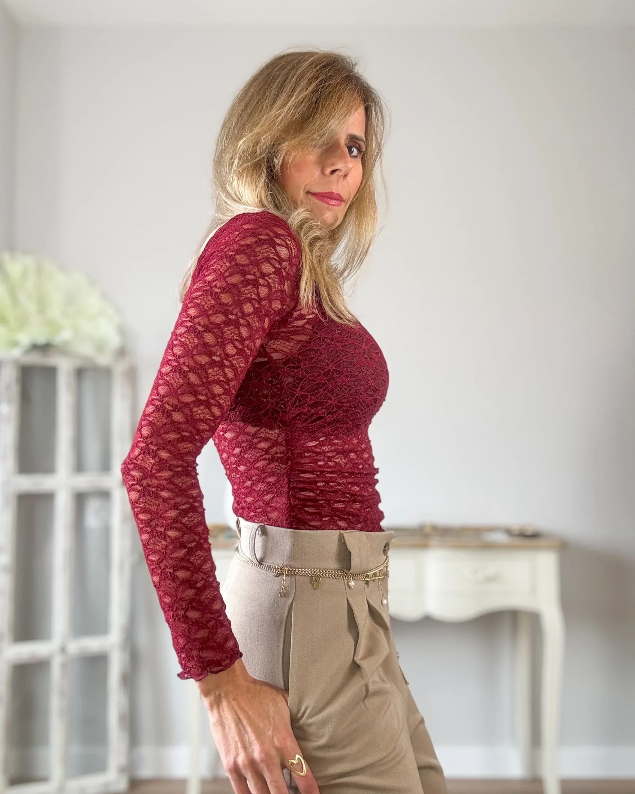 Camiseta granate ajustada tipo encaje. Corte ajustado y fruncido en laterales de la cintura. Una preciosidad.