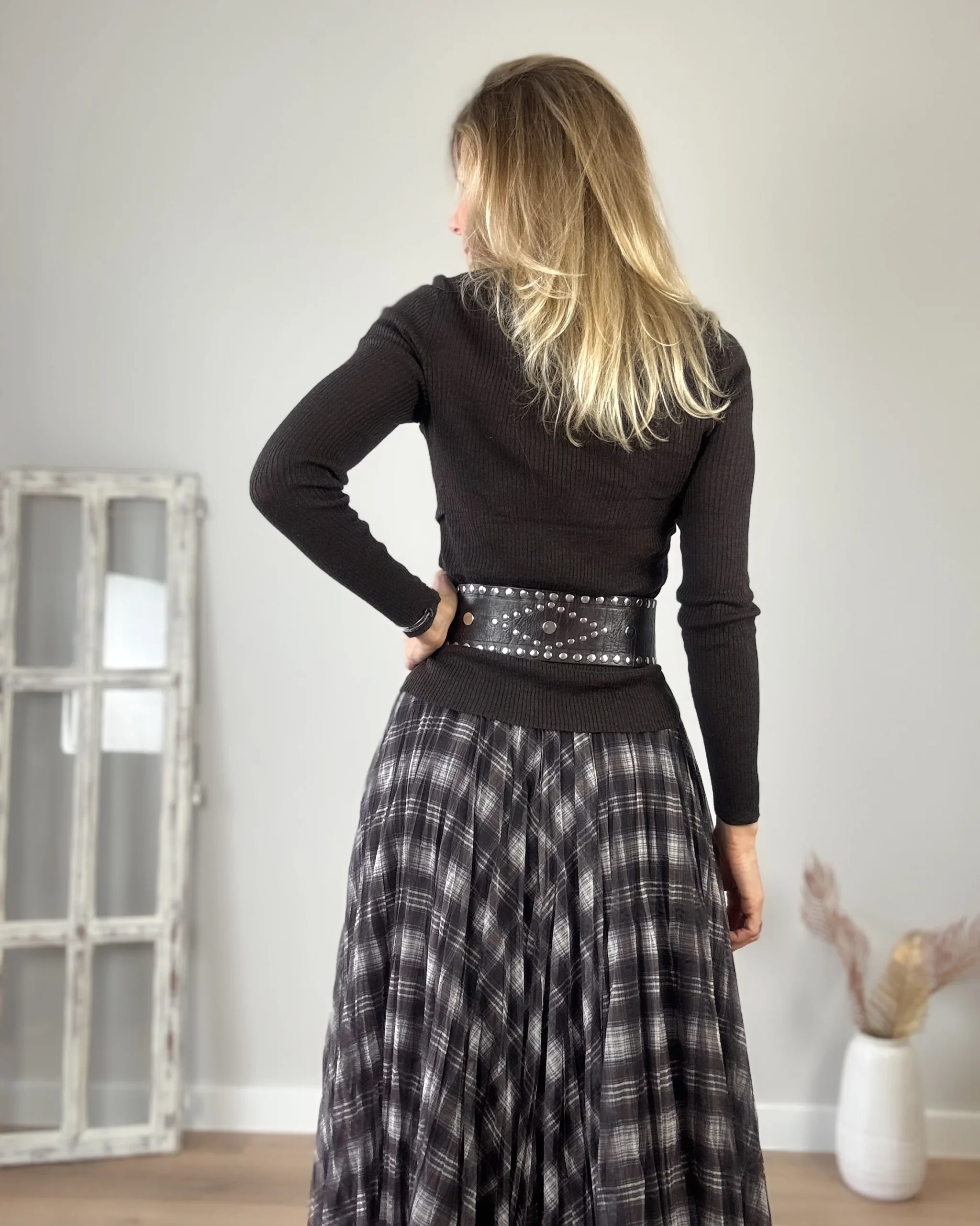 Camiseta marrón drapeada en laterales. Cuello redondo, manga larga y tejido muy agradable.