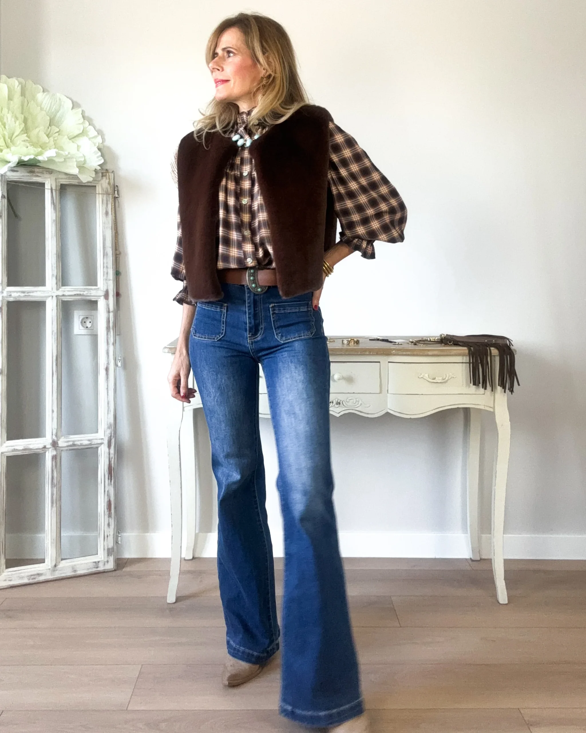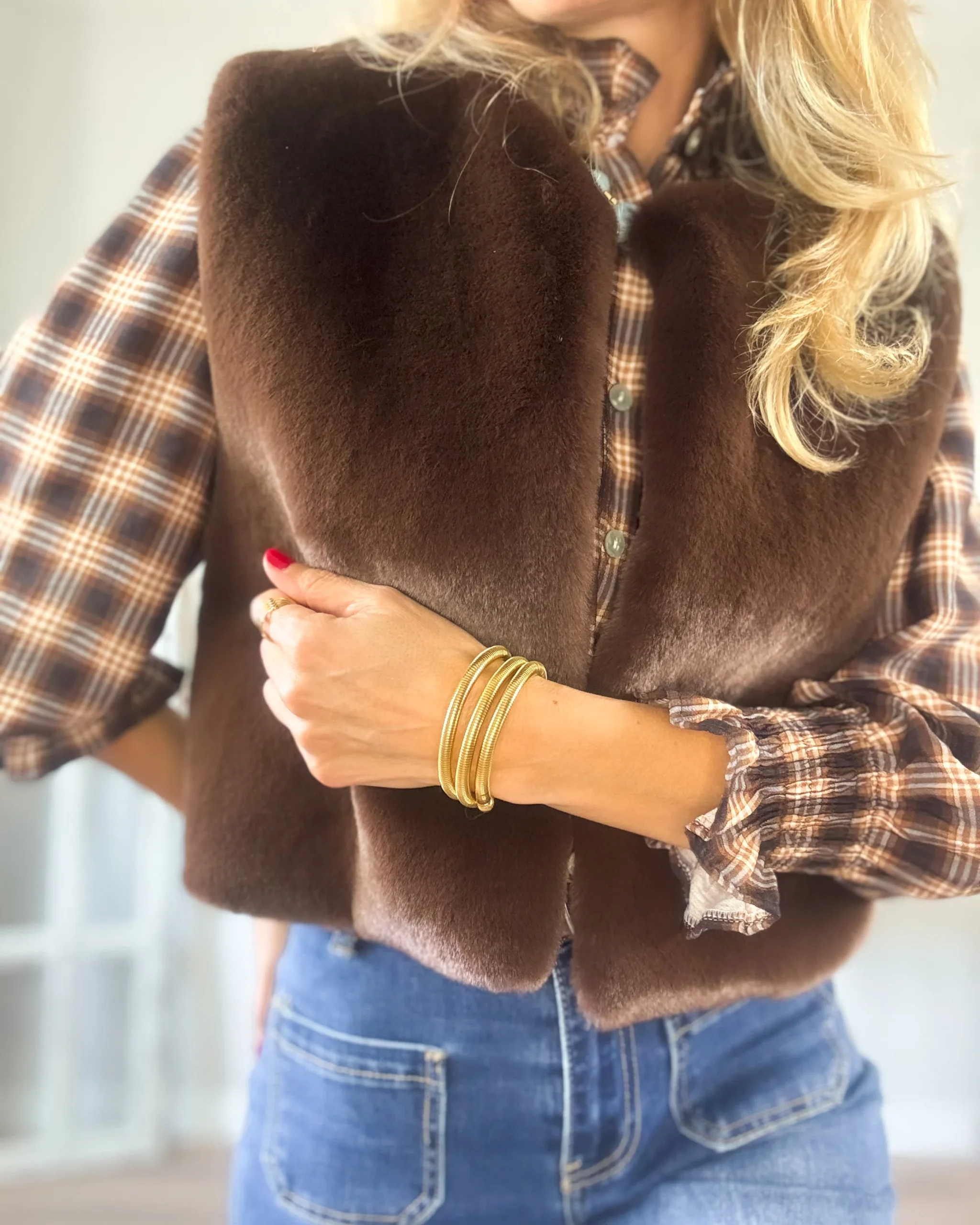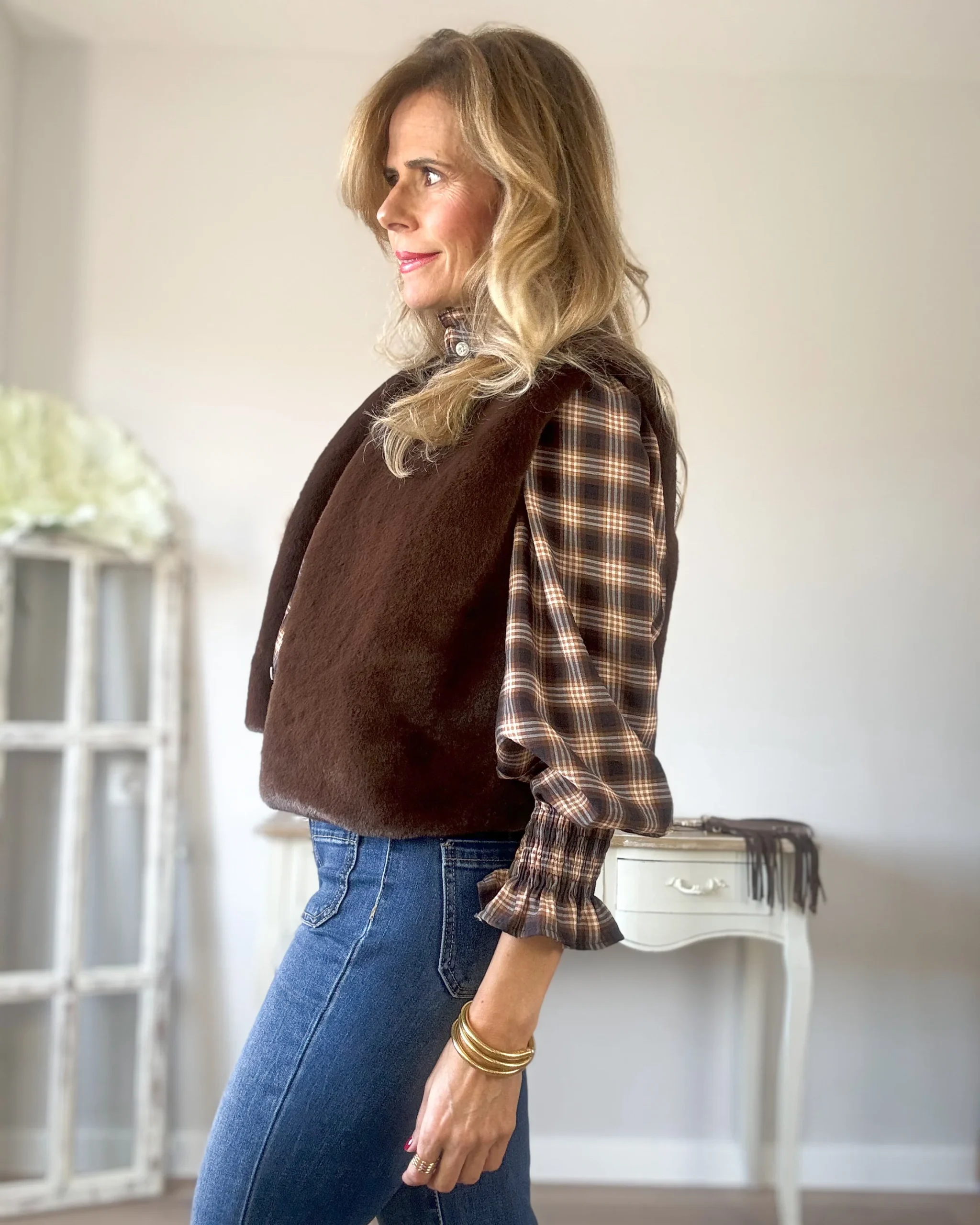 Chaleco de pelo marrón chocolate. Cuello redondo. Corte recto. Forro interior marrón. Un complemento perfecto.