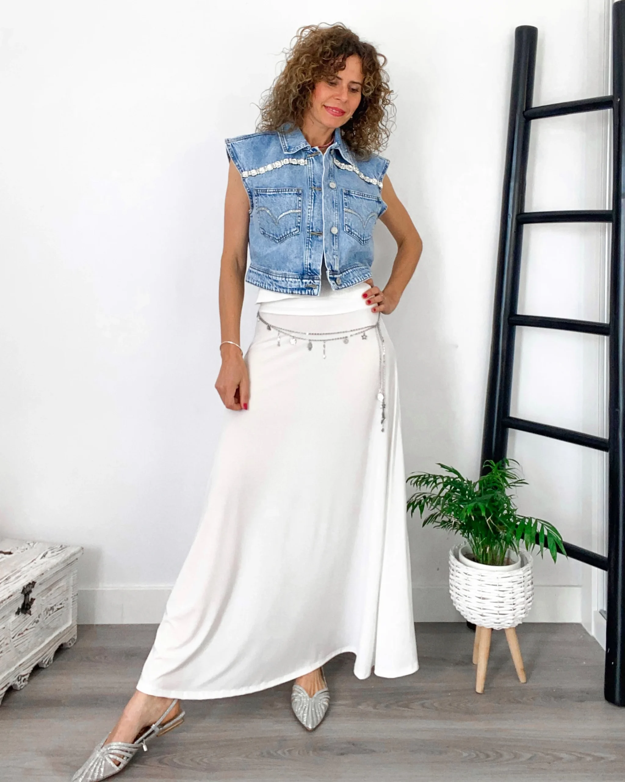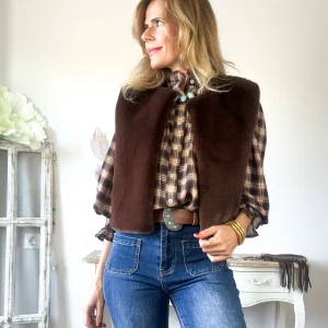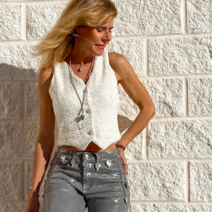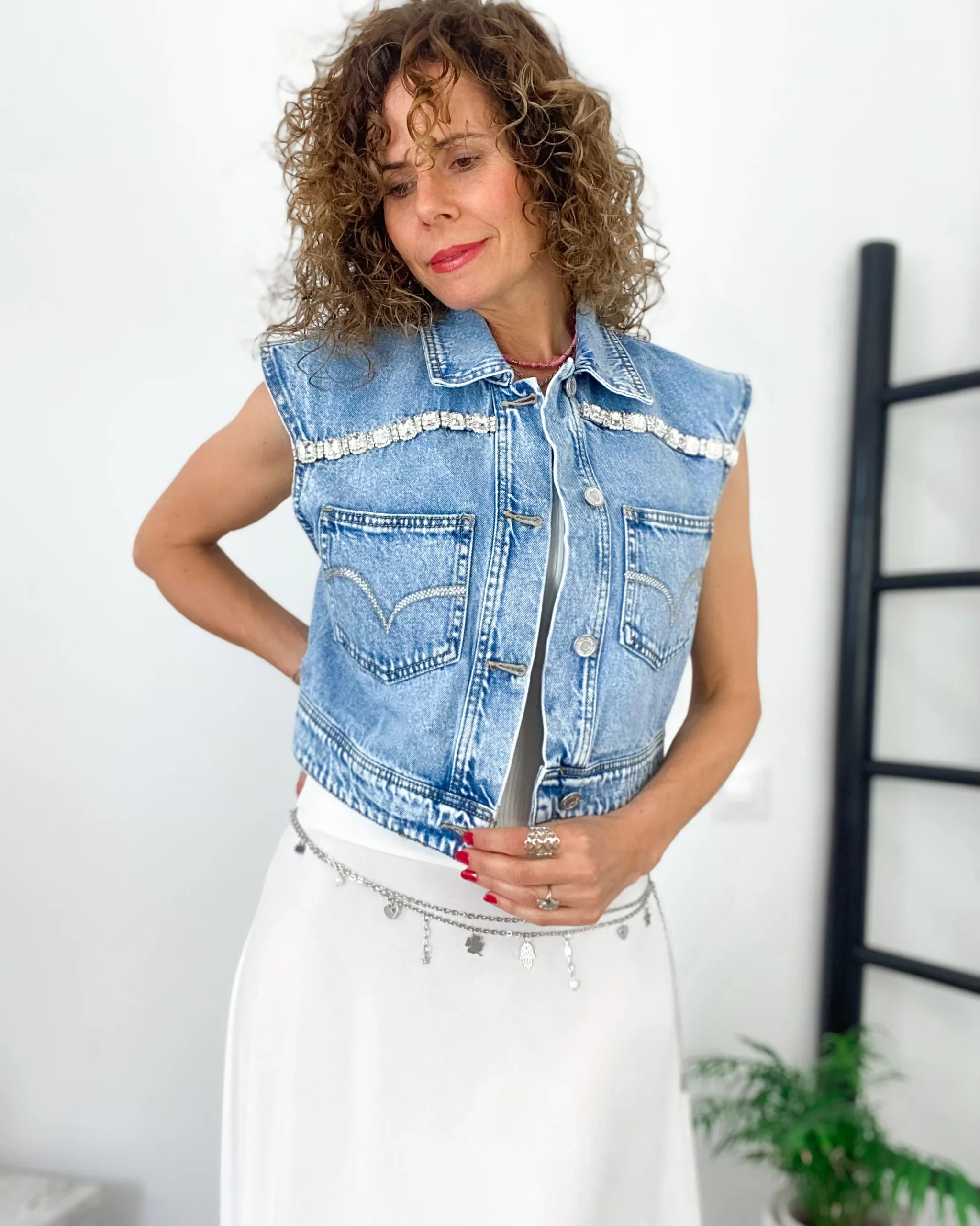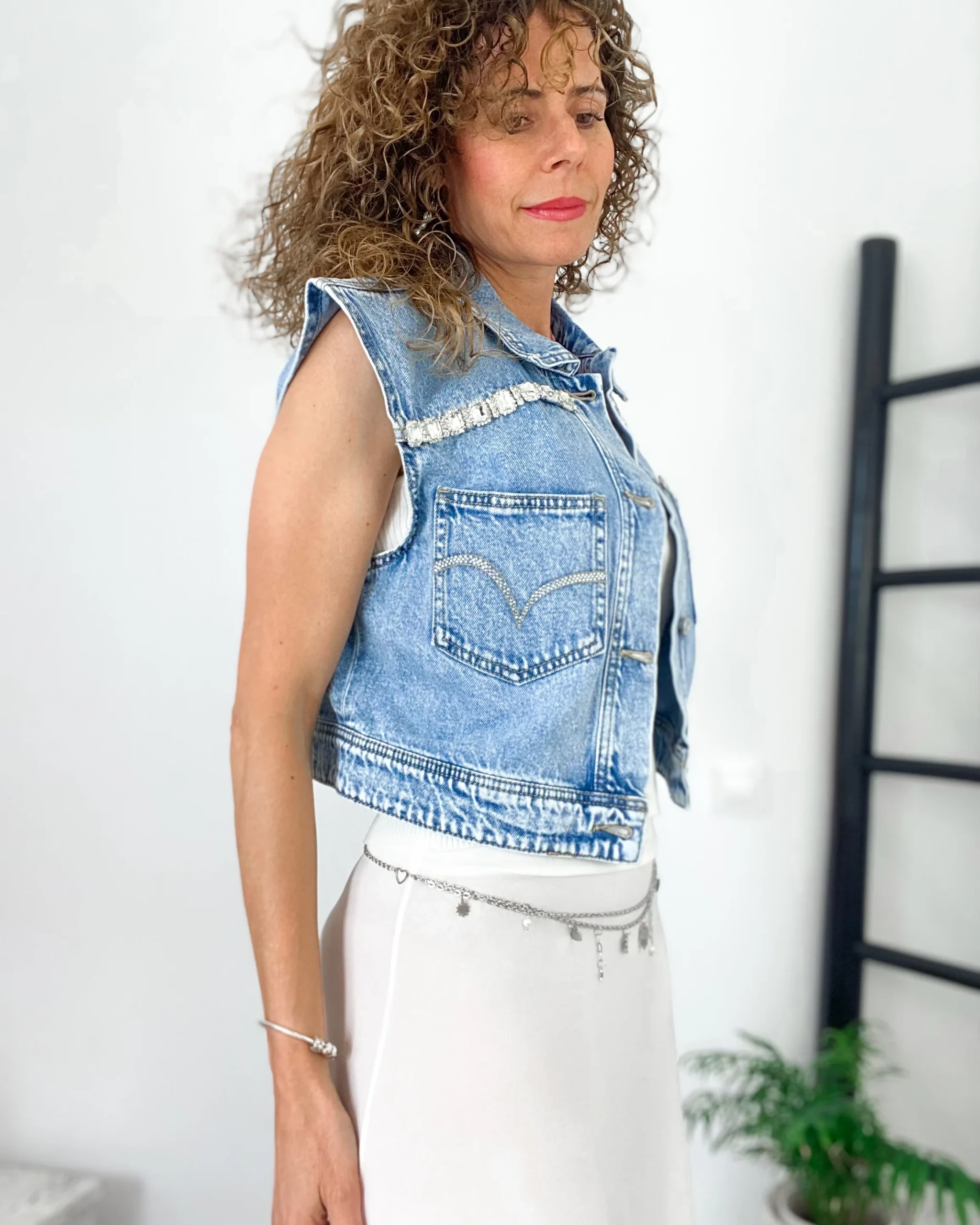 Chaleco vaquera denim en color desgastado. Corte entallado y corto.