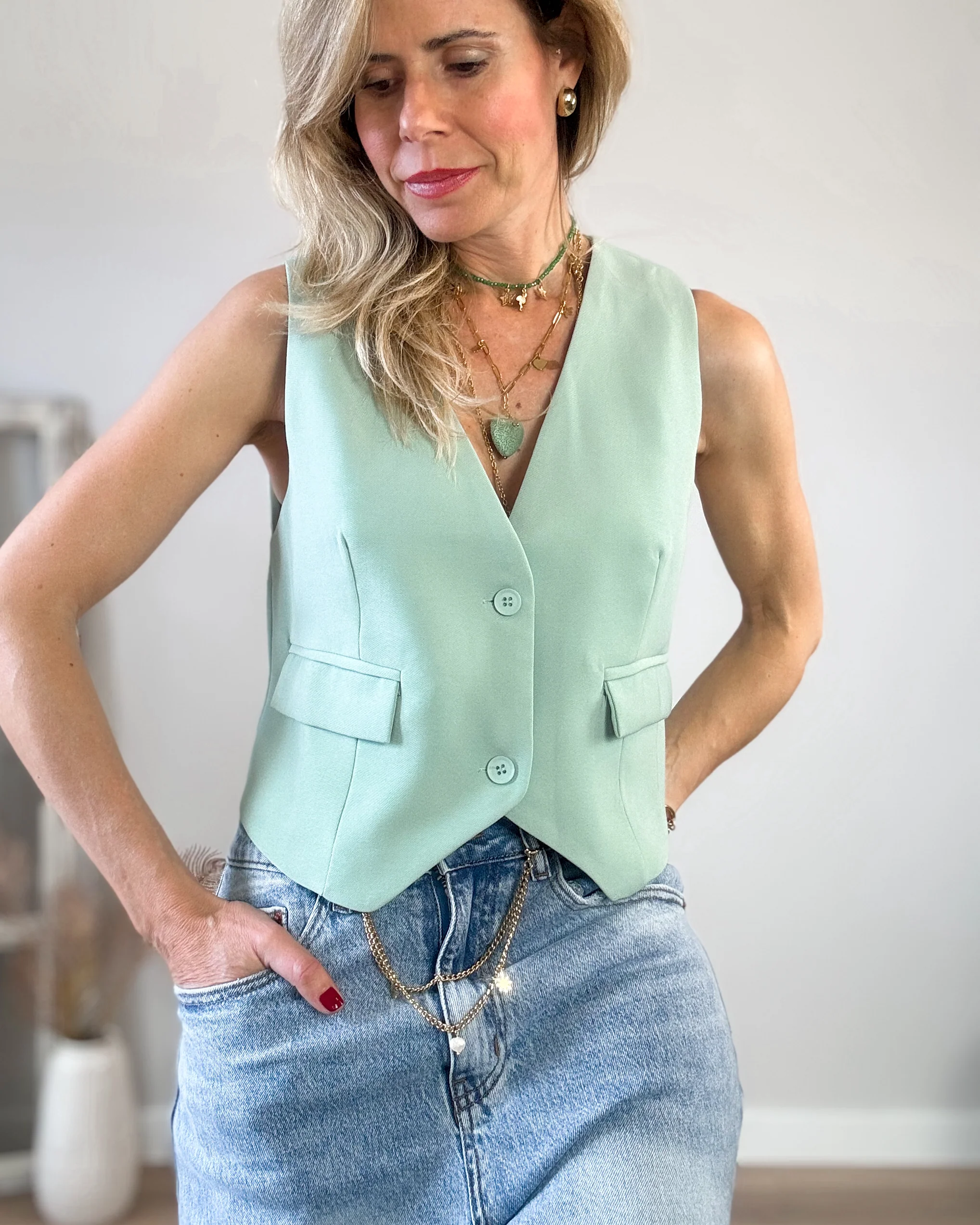 Chaleco verde menta entallado y forrado. Corte elegante y color suave. Una prenda preciosa para combinar con colores claros y blancos.