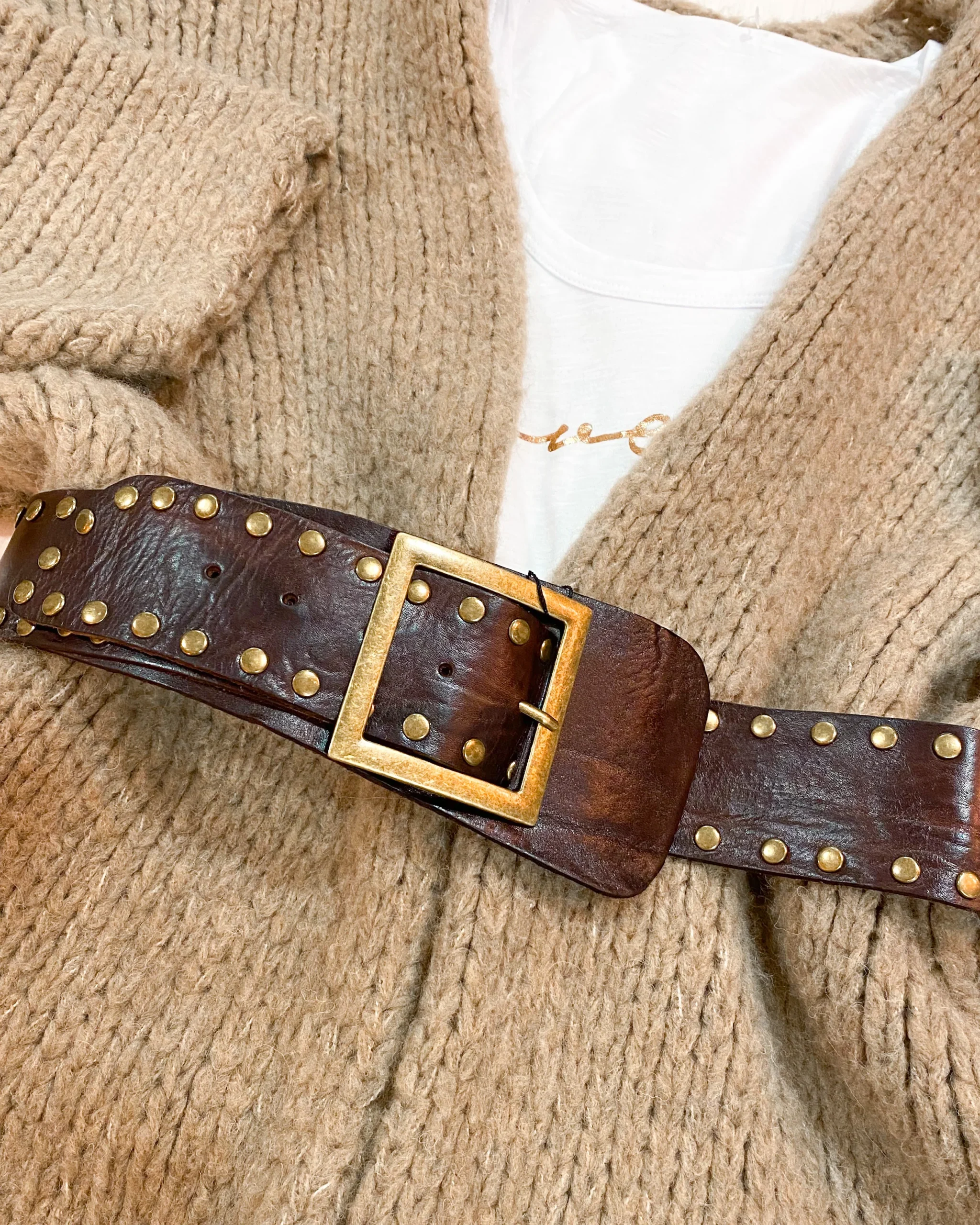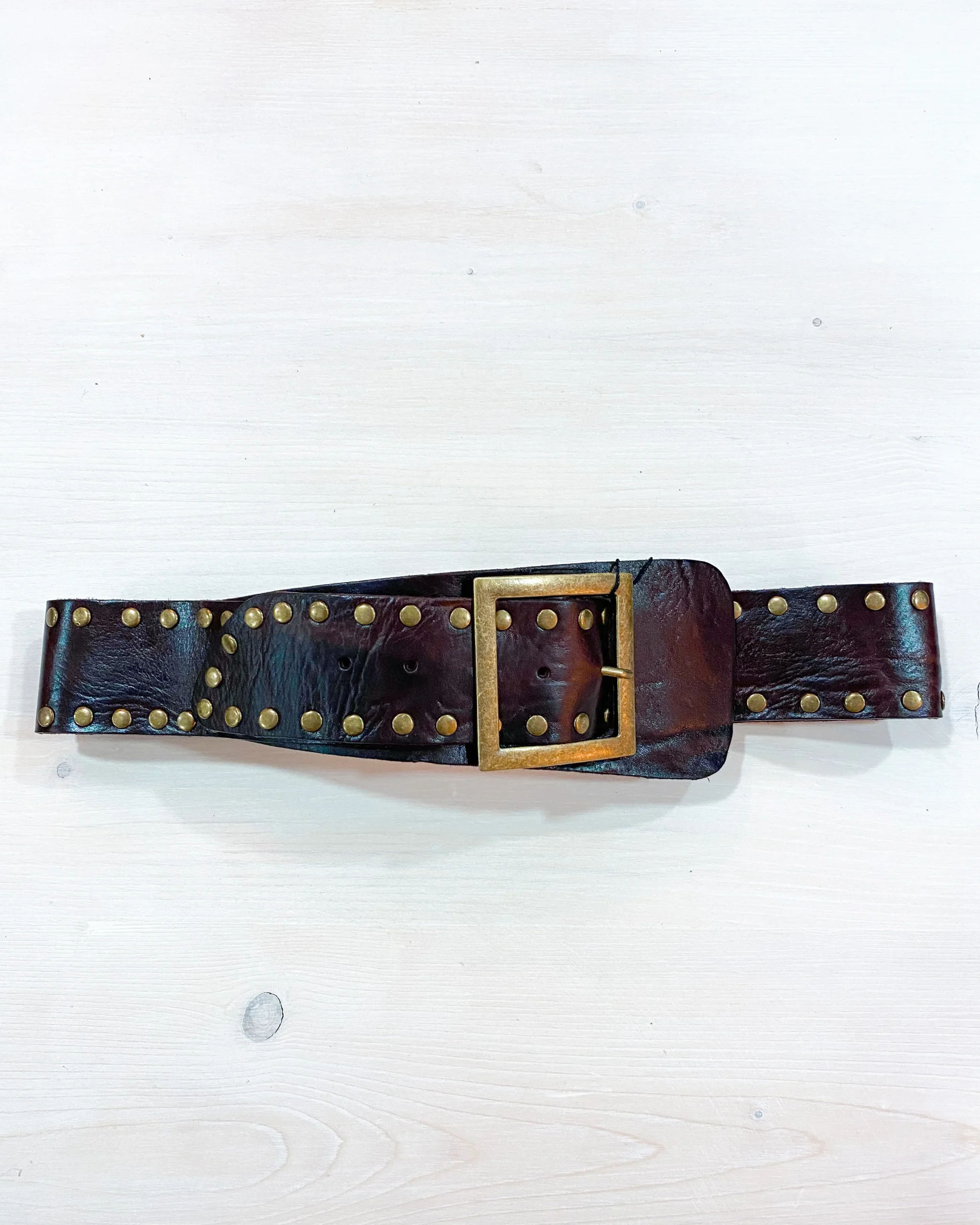 Cinturón ancho de piel en color marrón chocolate. Tachuelas en color dorado. Corte ancho.
