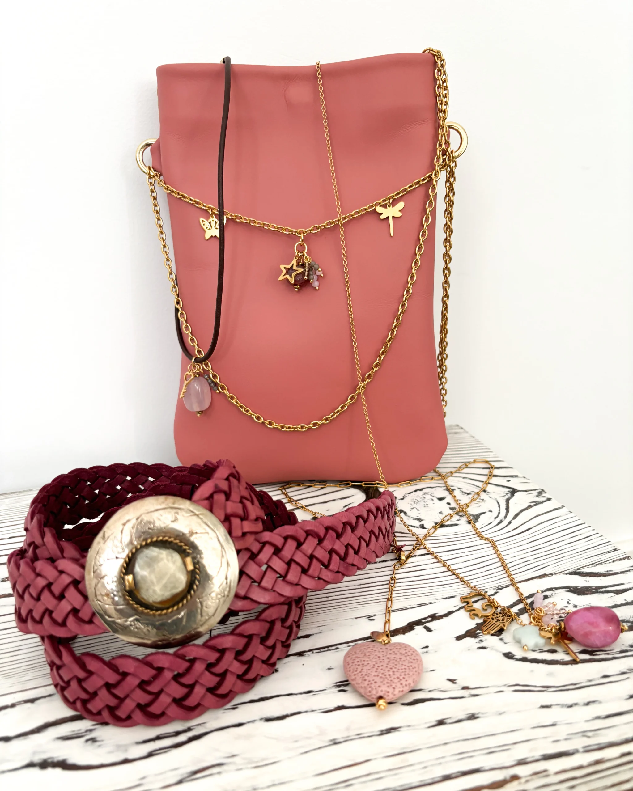 Cinturón fino de piel trenzado en color rosa palo. piedra central de color blanca en forma redonda. Corte ancho.