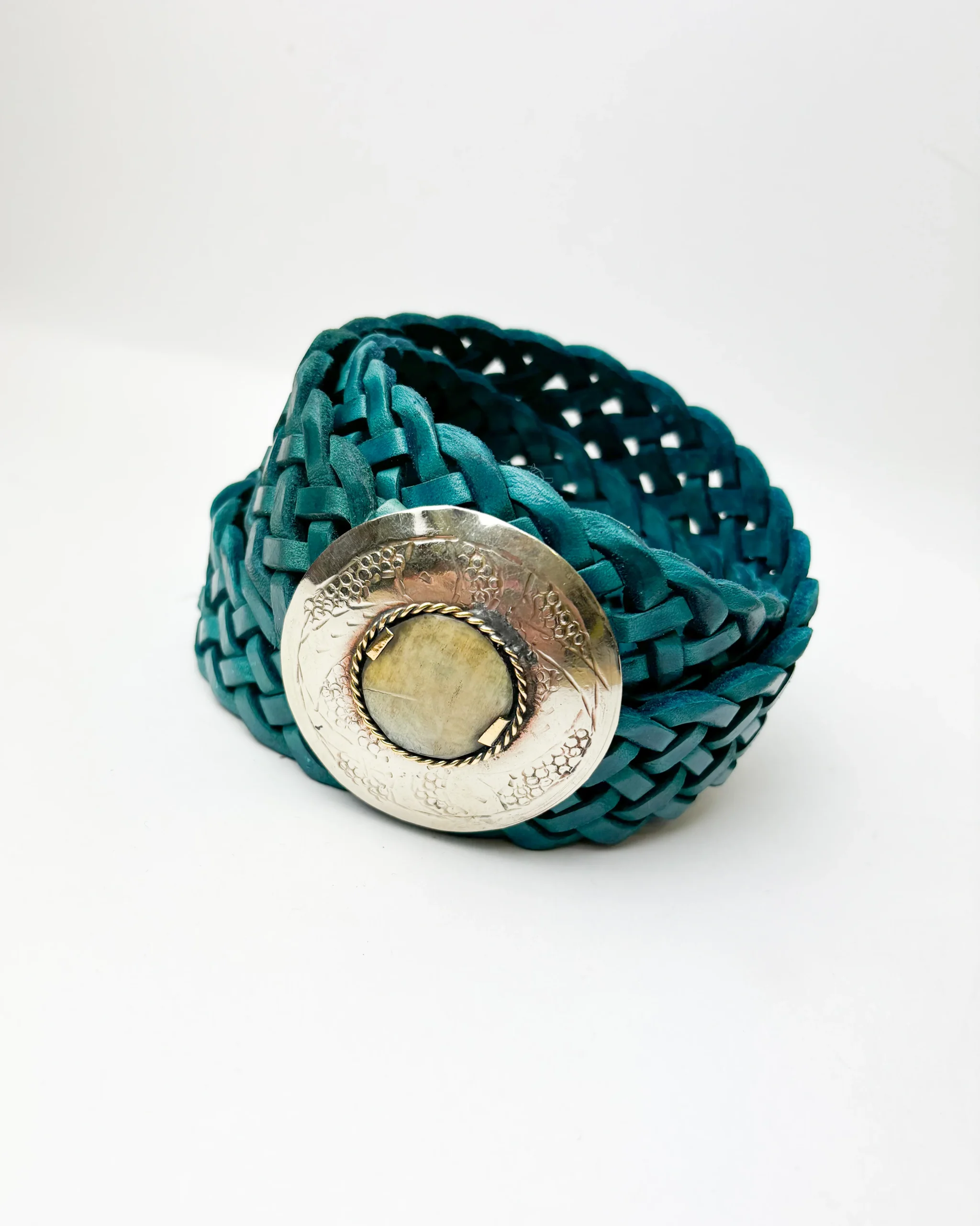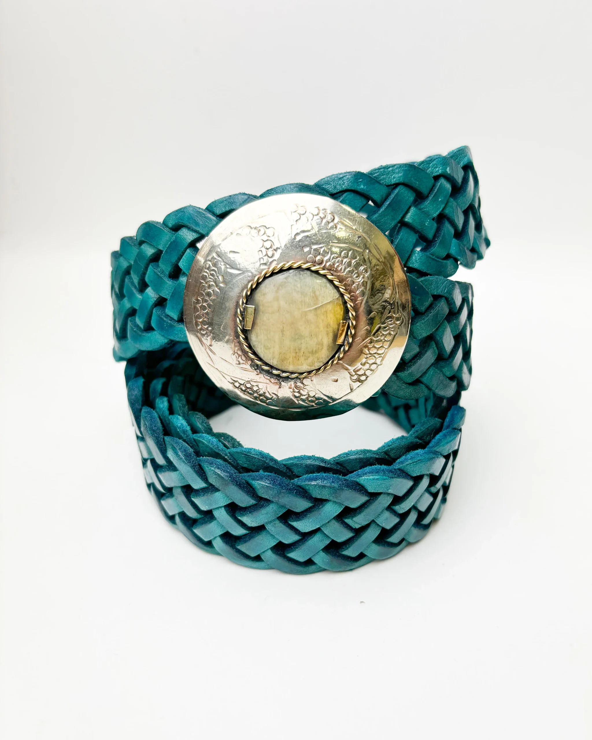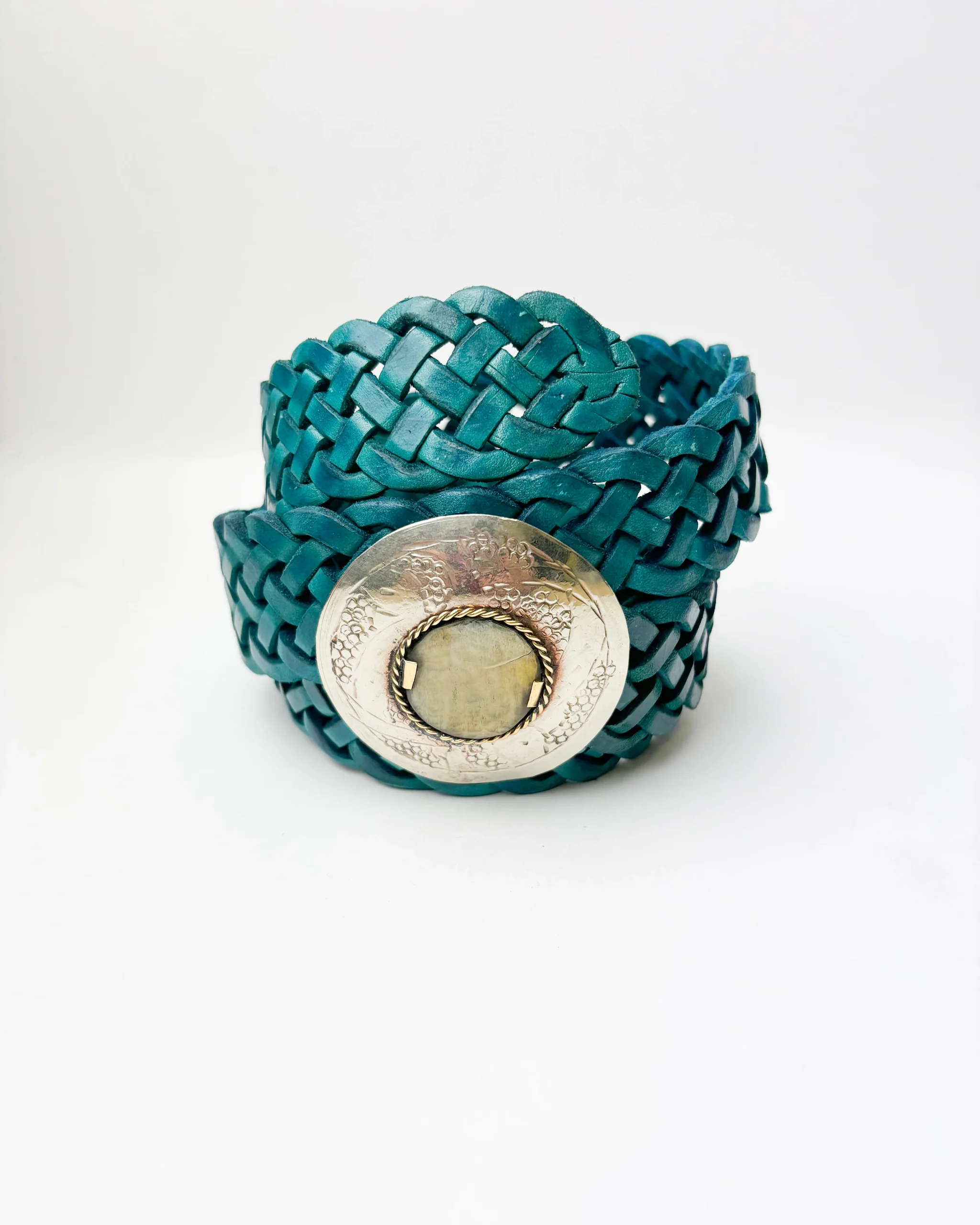 Cinturón fino de piel trenzado en color azul. Piedra central blanca en forma redondeada. Corte ancho.