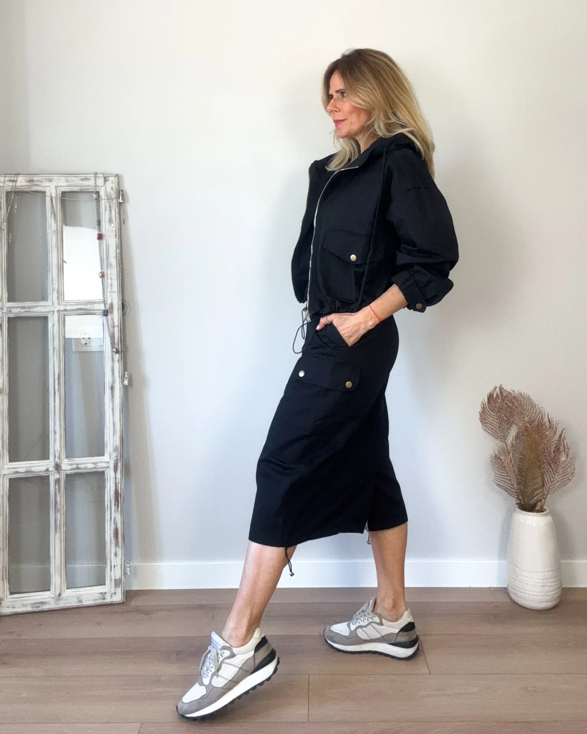 Conjunto cargo de falda y cazadora color negra. Falda con goma en la cinturilla, corchete y cremallera, bolsillos laterales y corte recto y amplio. Cazadora con bolsillos, capucha y cordón para ajustar.