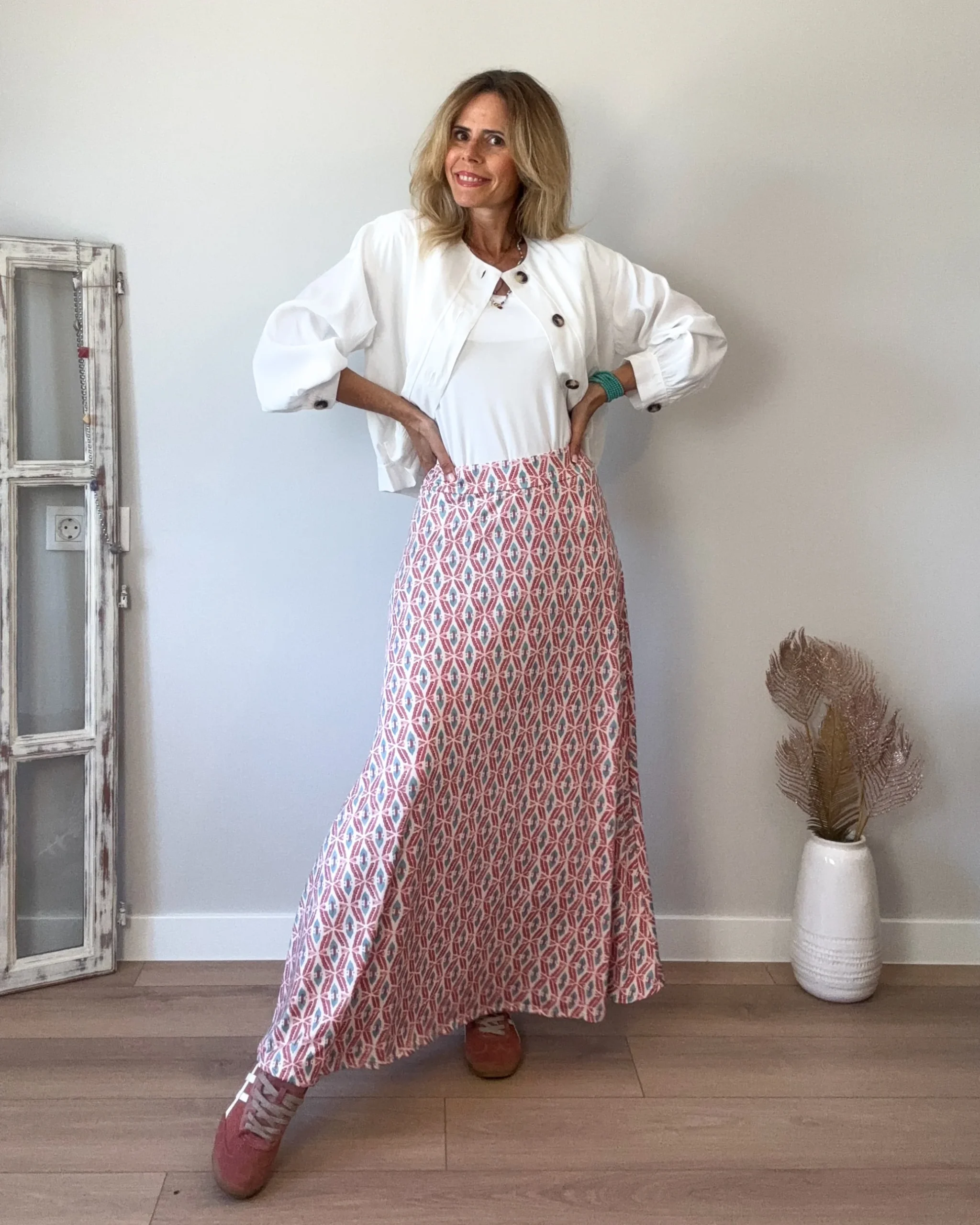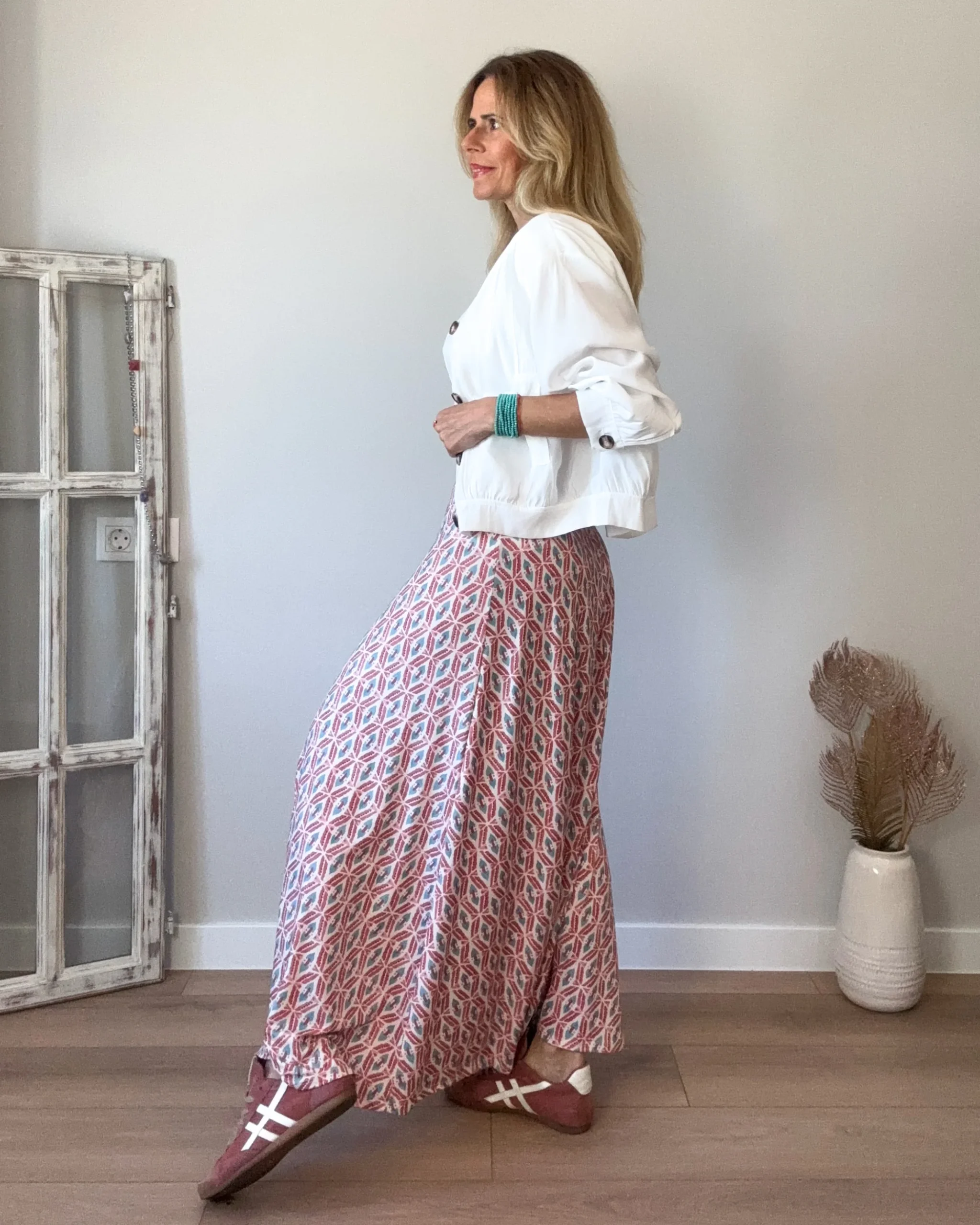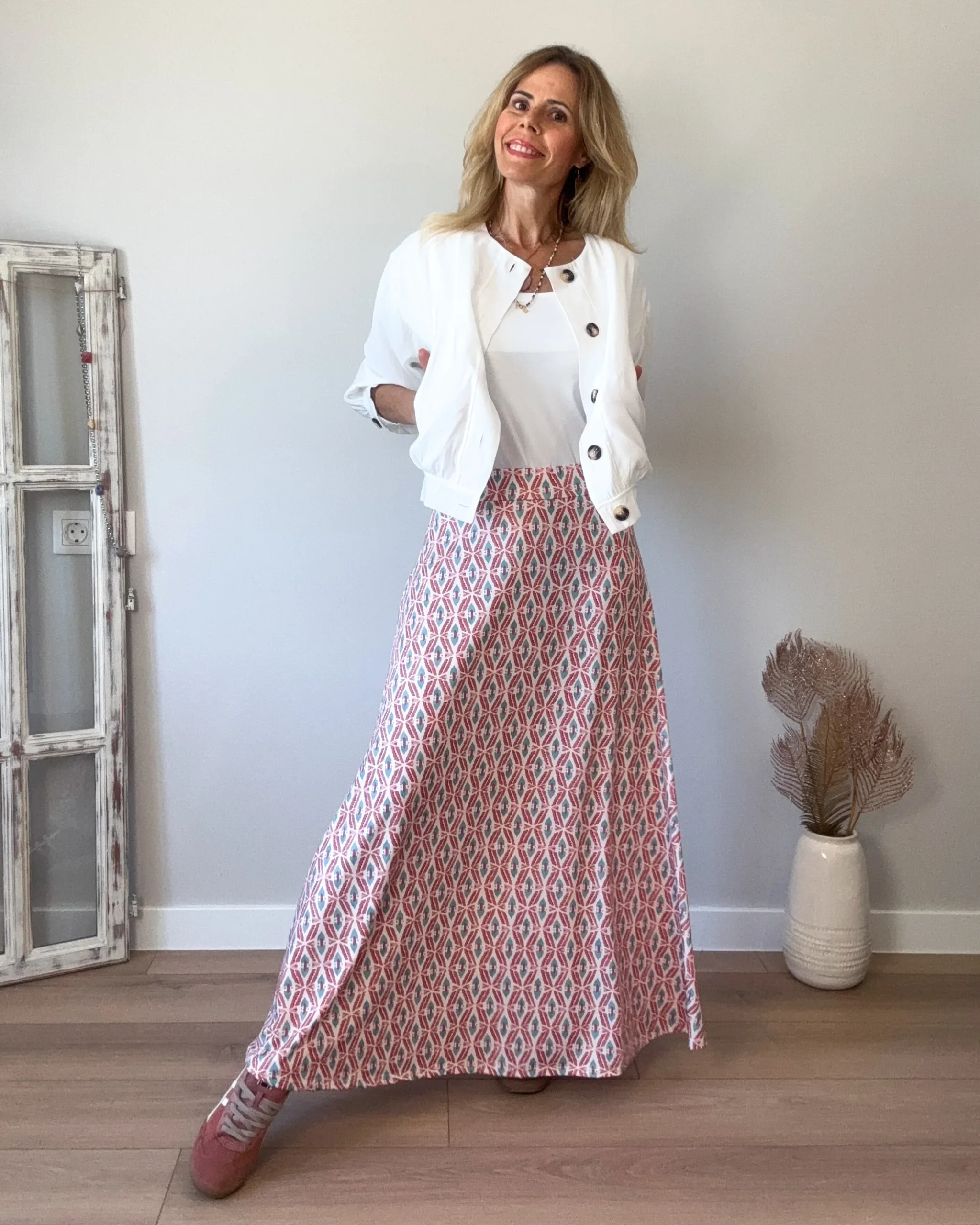 Falda larga tonos rosas y turquesa de punto frío con una preciosa caída y estampado geométrico. Una falda preciosa de tejido muy bonito.