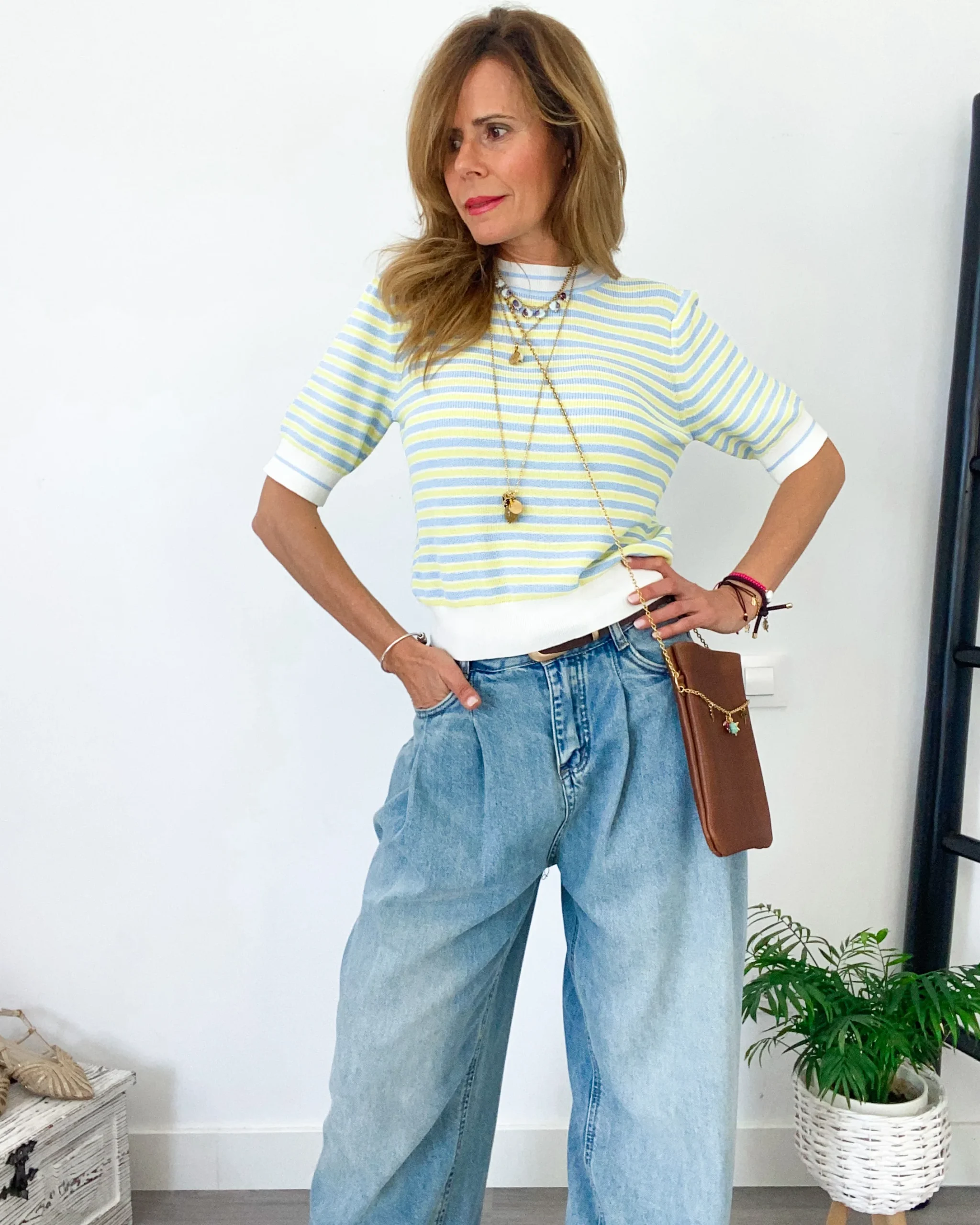 Jeans azul claro de corte amplio y pinzas. Pierna ancha y tiro alto. Tejido muy blando y cómodo.
