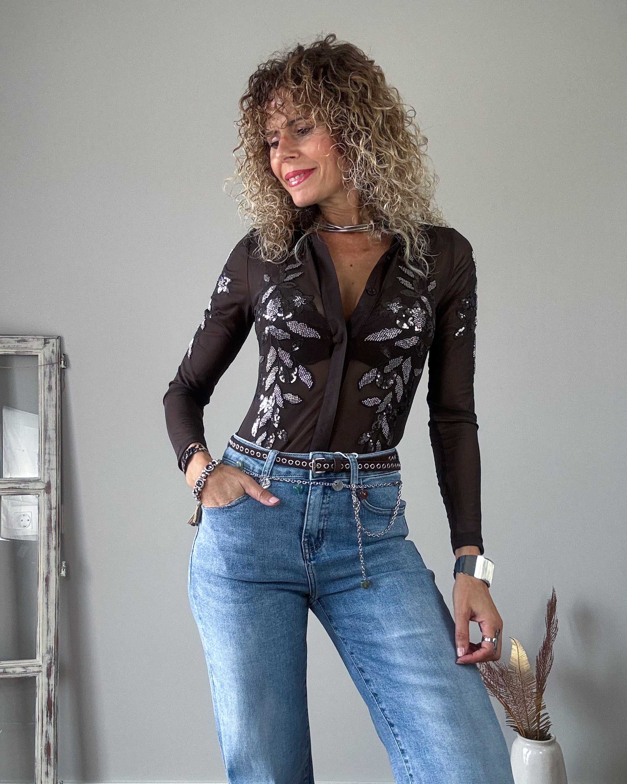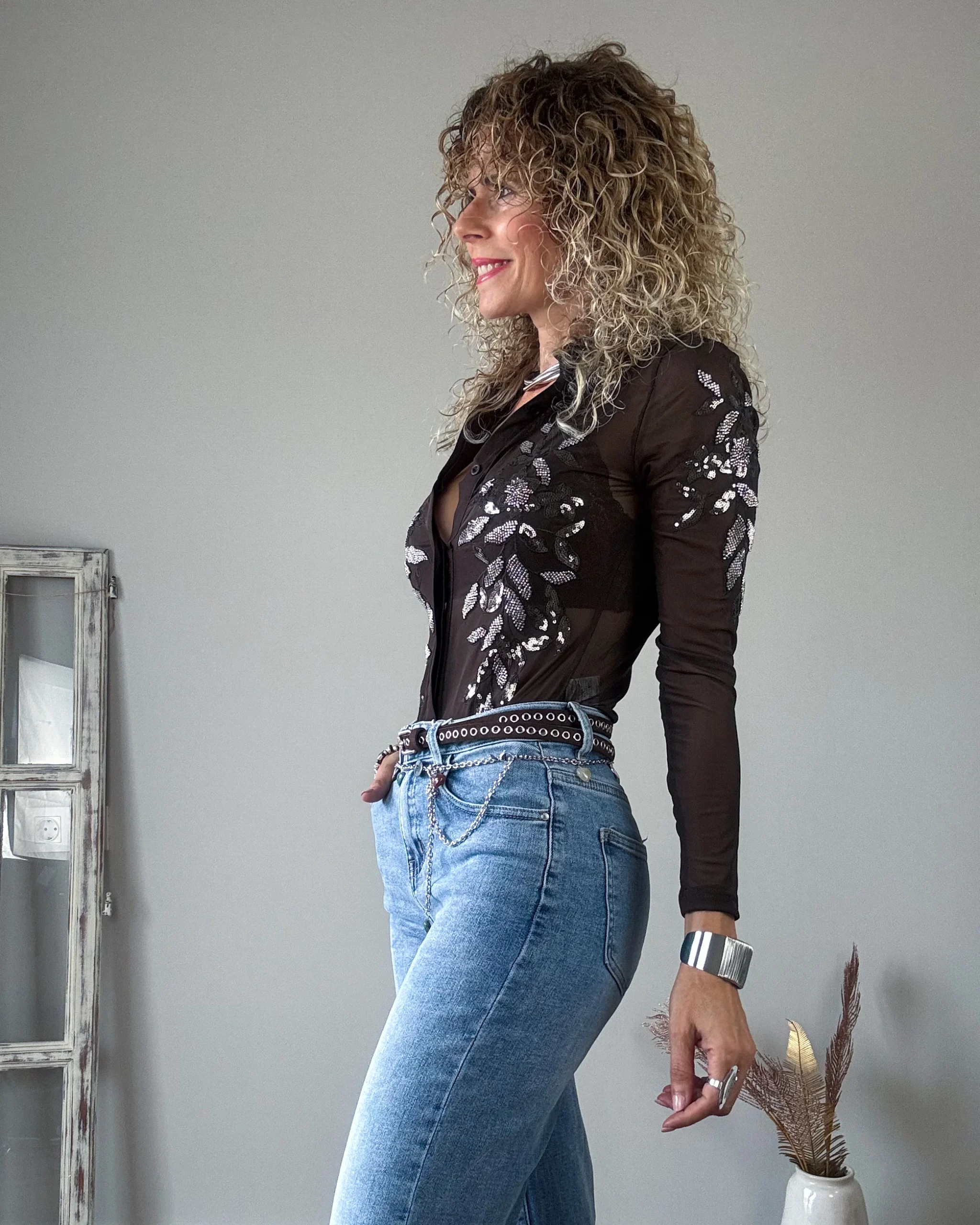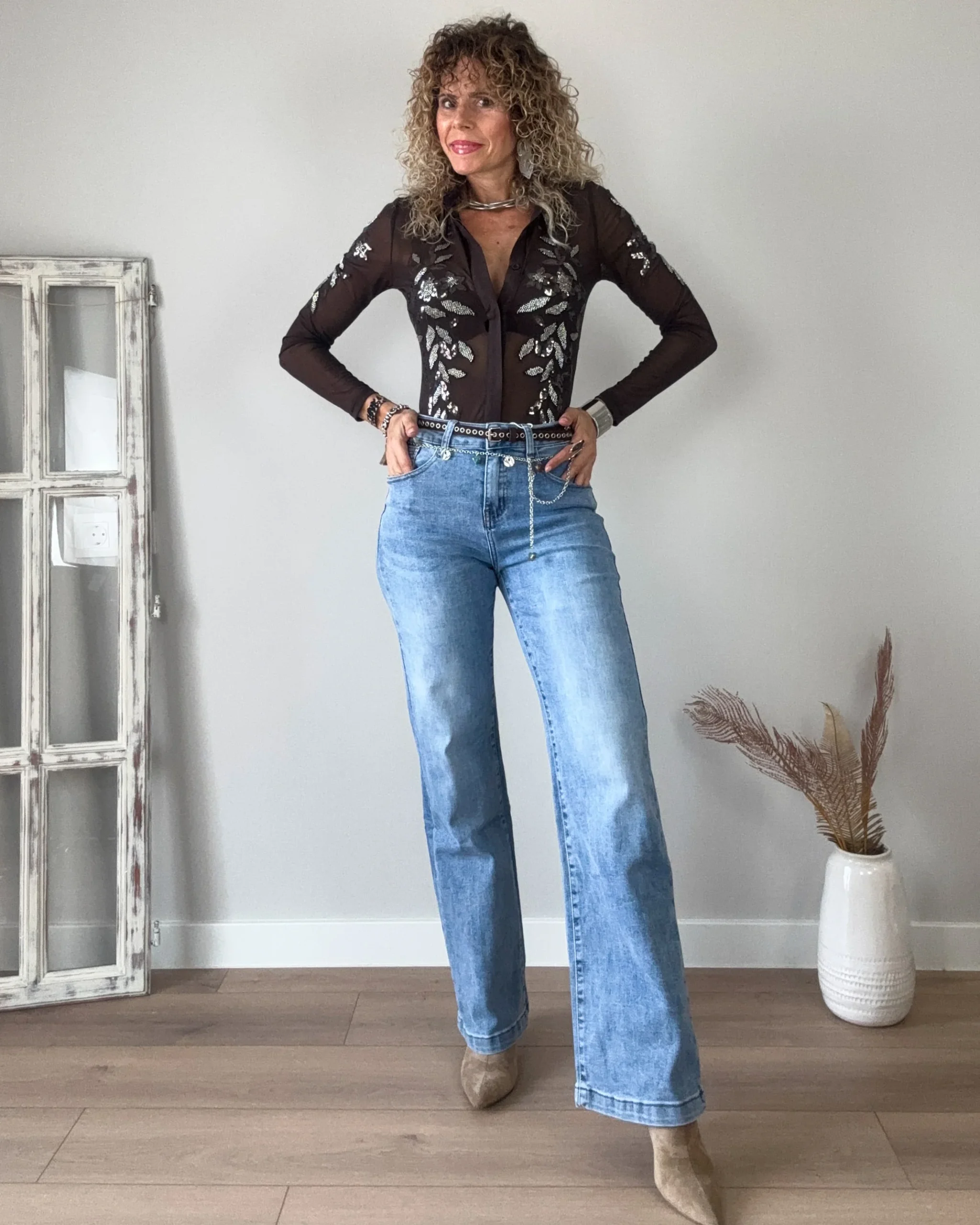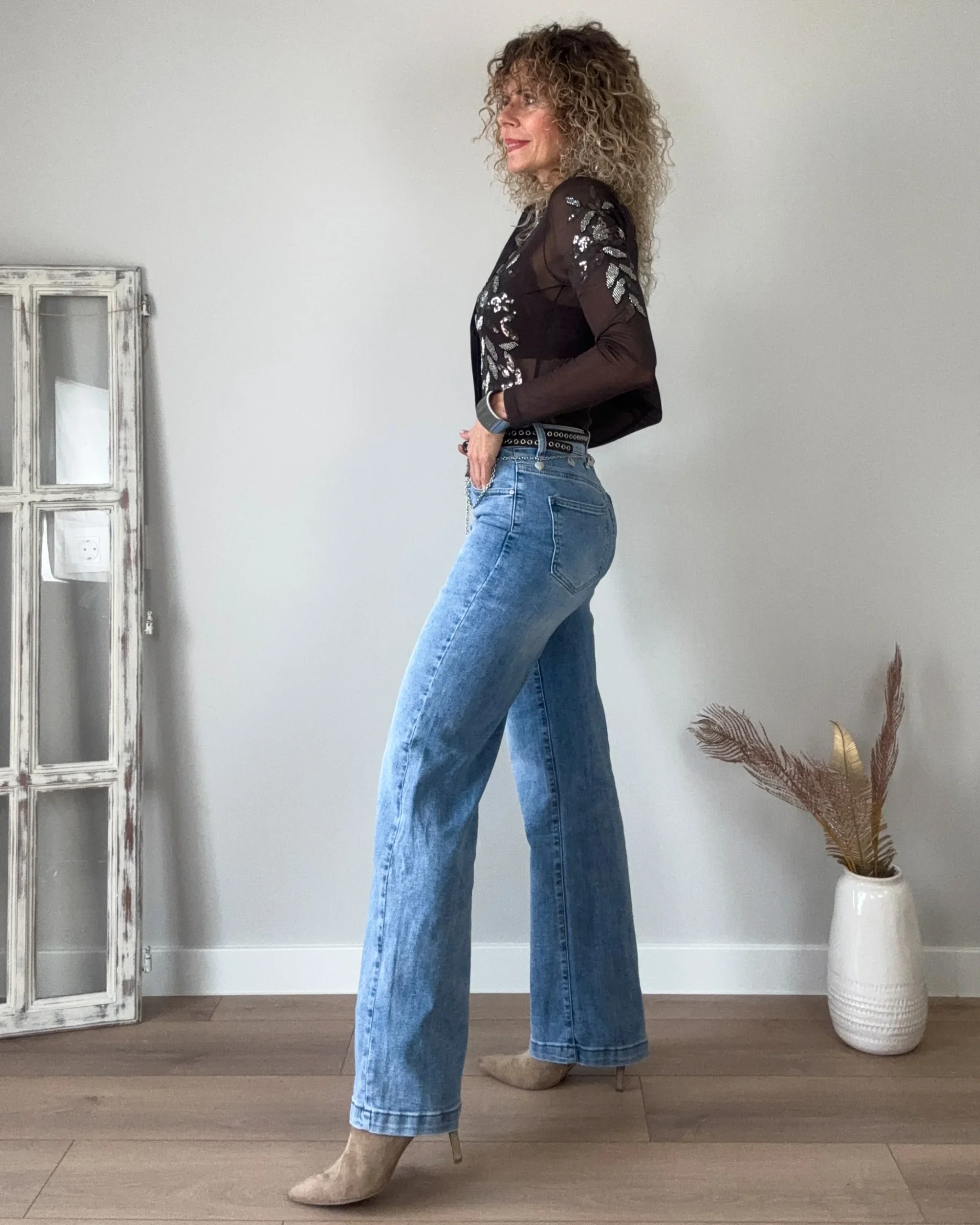 Jeans azul desgastado de corte recto. Un pantalón de tejido muy blando y mucha caída. Un modelo muy chulo.