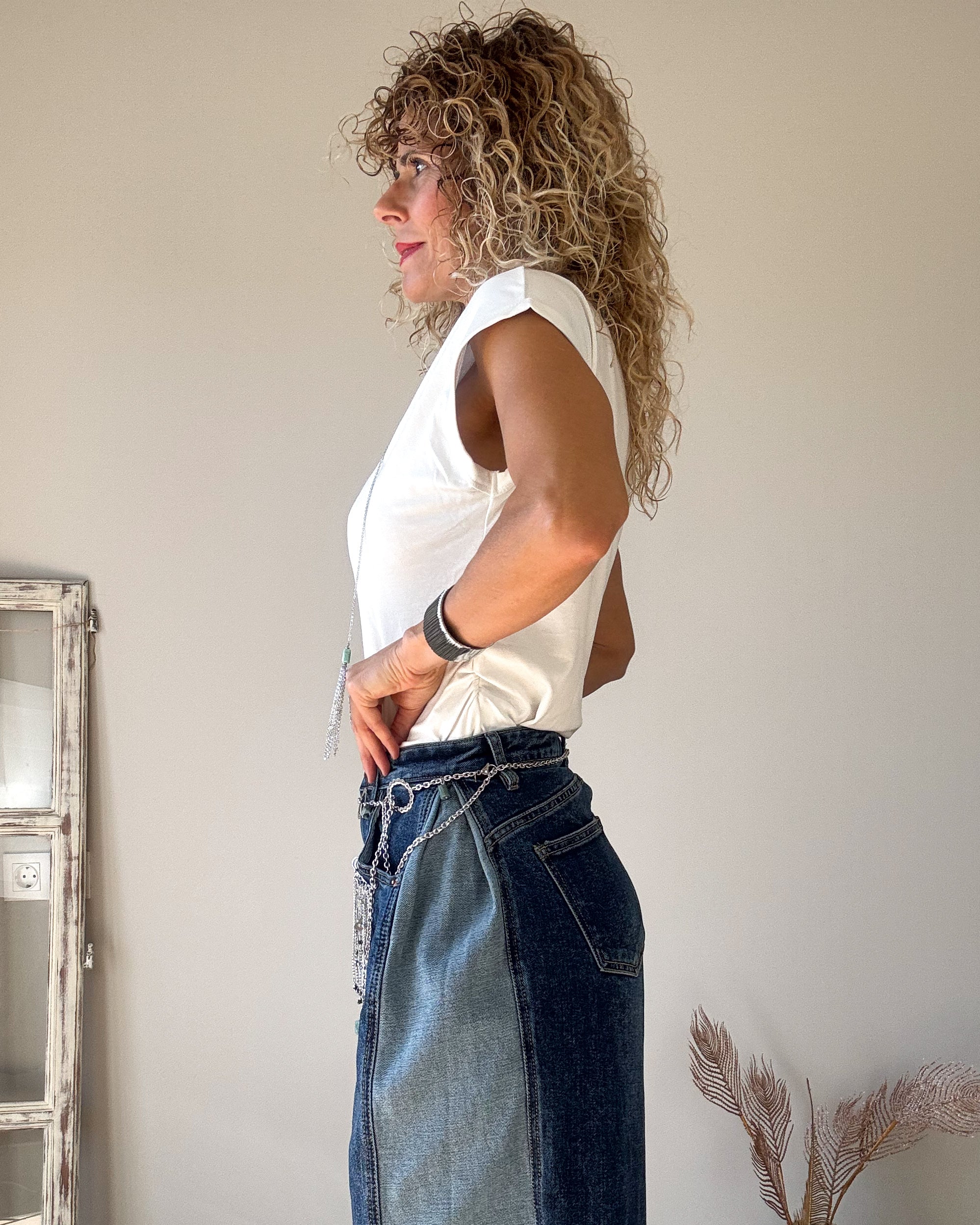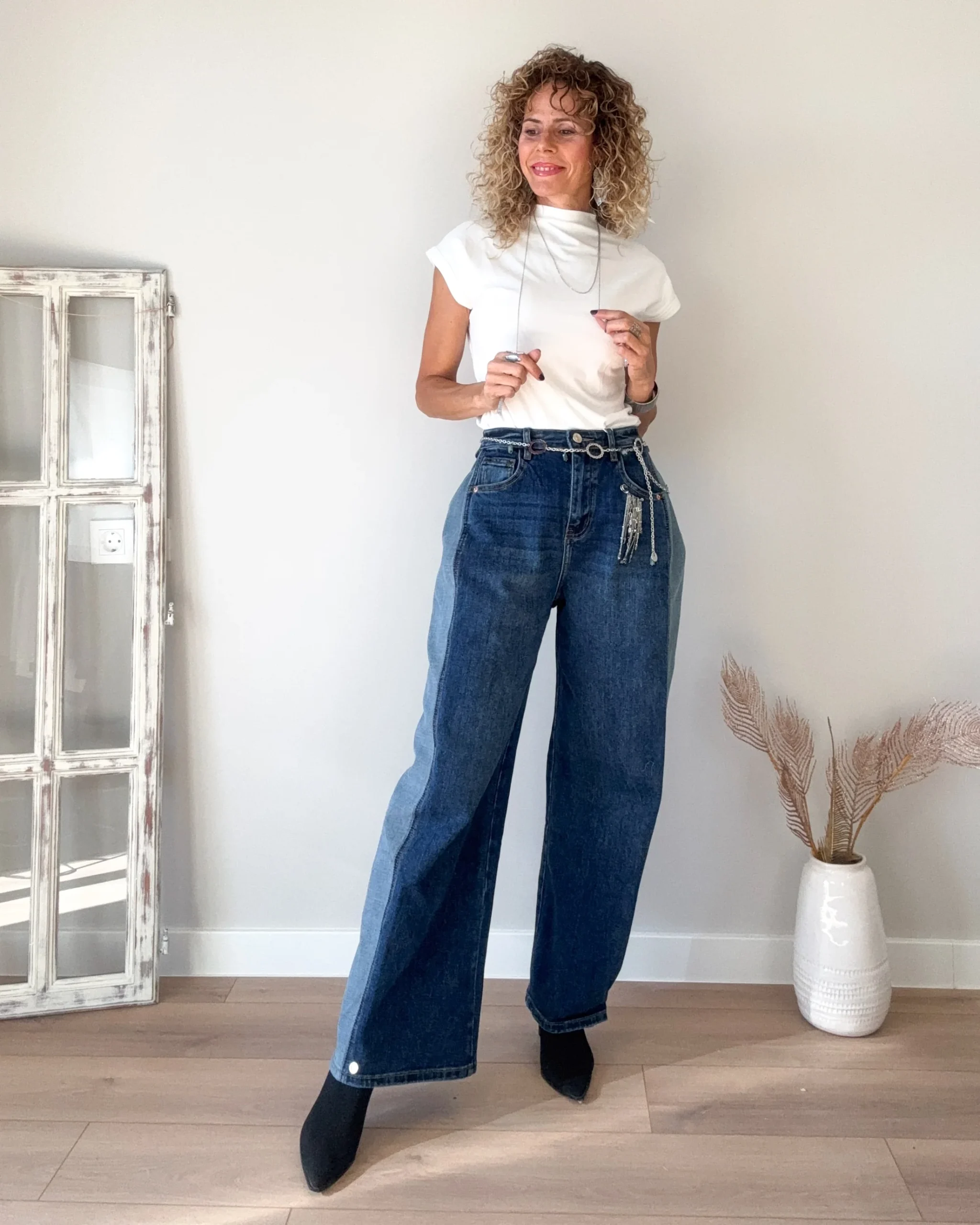 Jeans balloon azul de corte amplio. Combinado con doble vaquero más claro en el lateral, haciendo una pinza. Corchetes en el tobillo. Tejido elástico. Tiro medio.