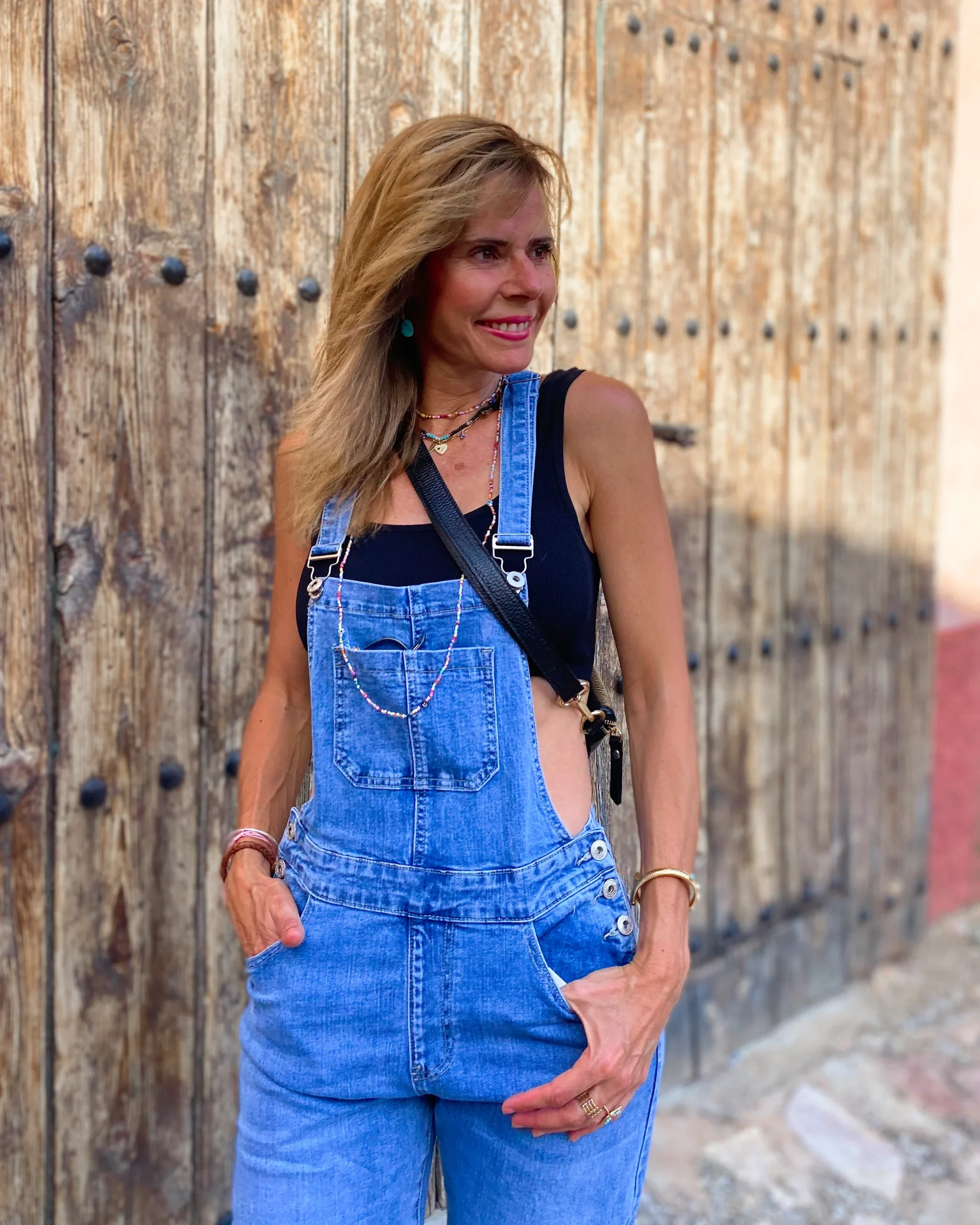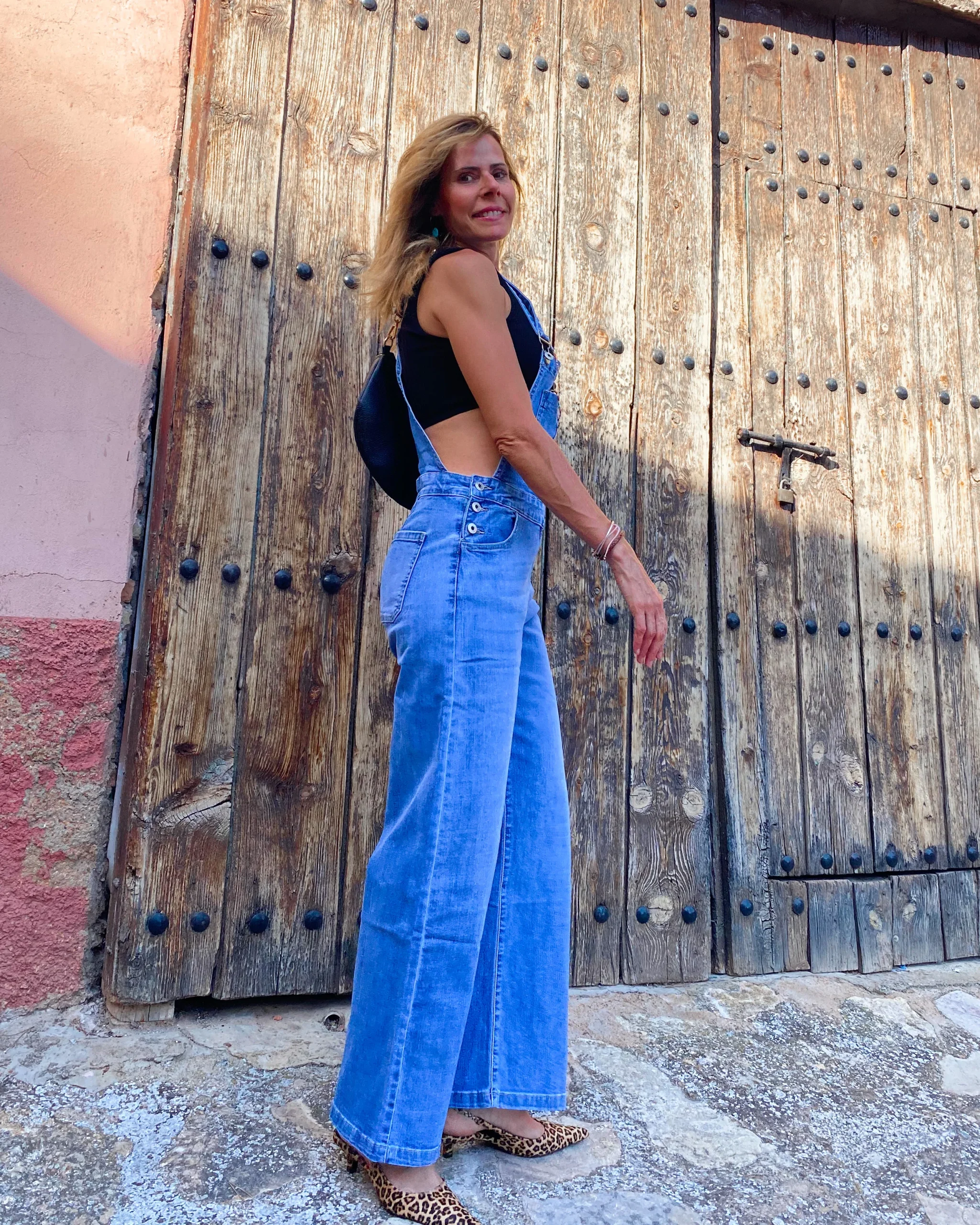 Mono peto vaquero azul desgastado de pierna ancha. Bolsillos laterales y traseros.