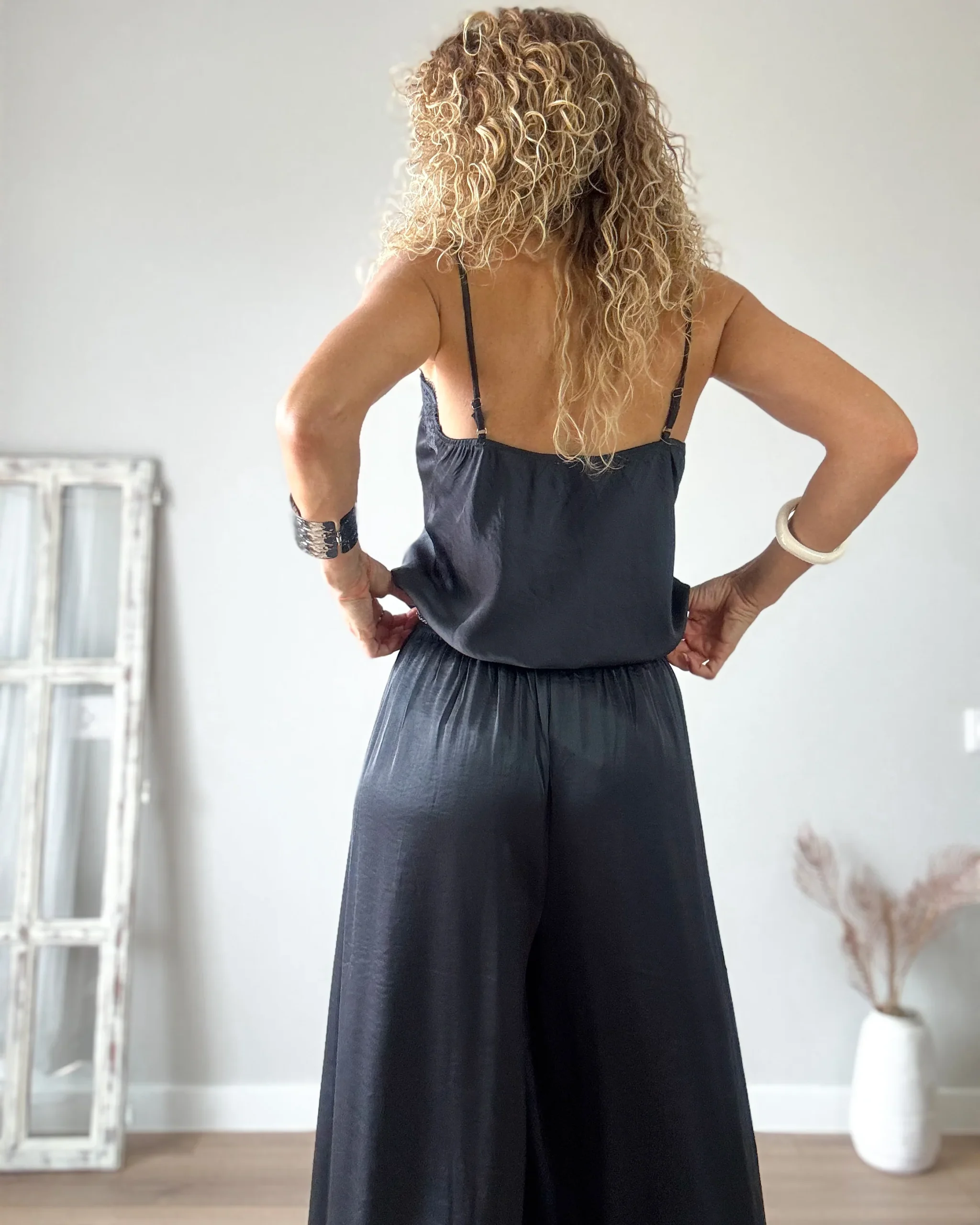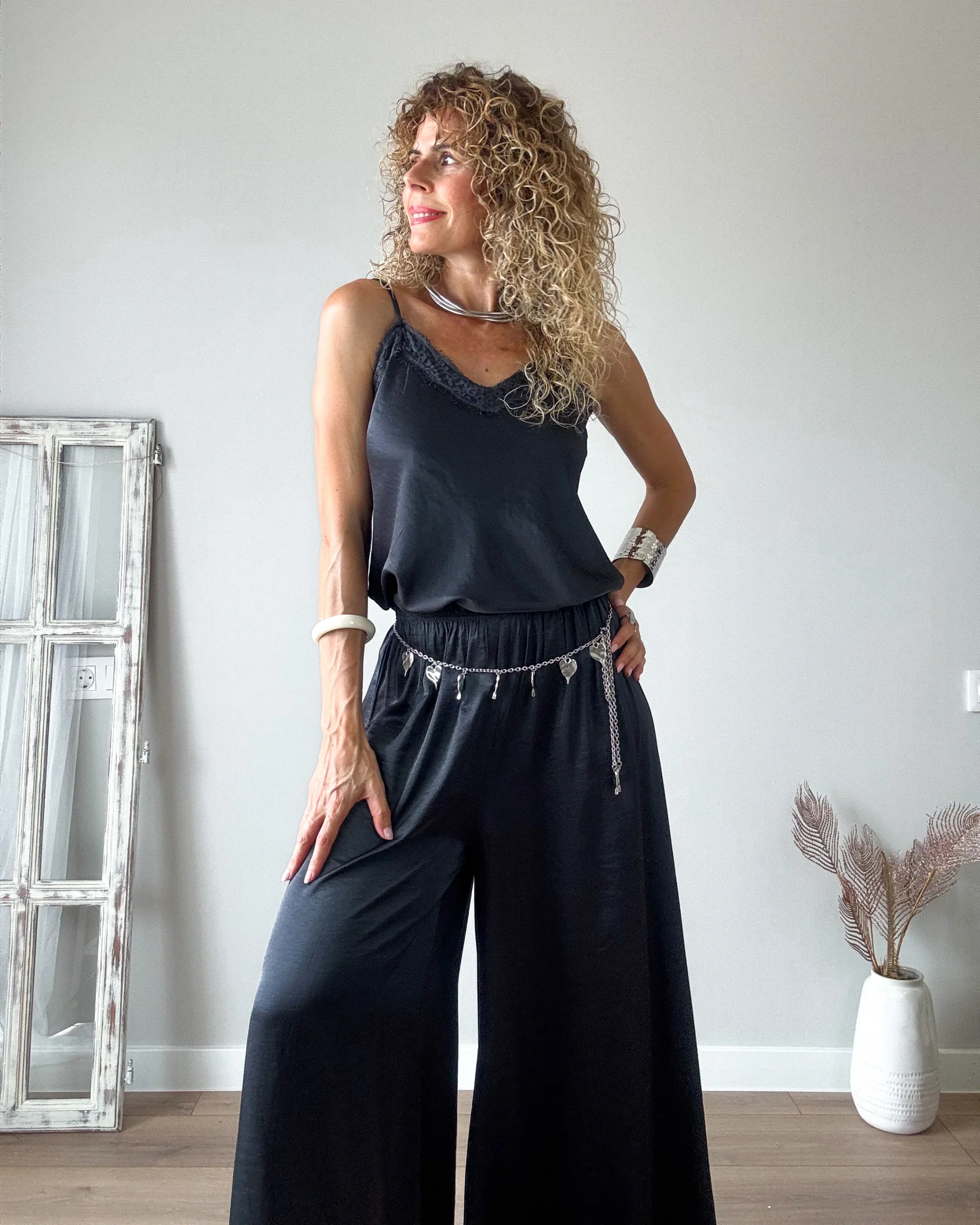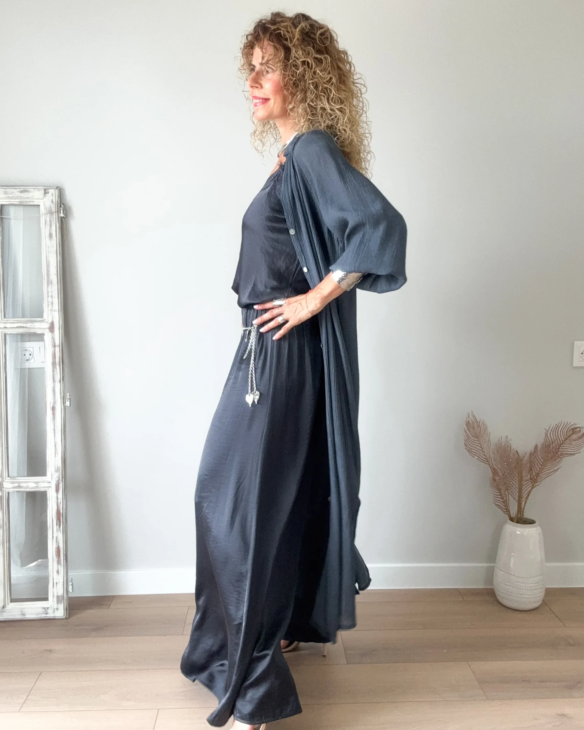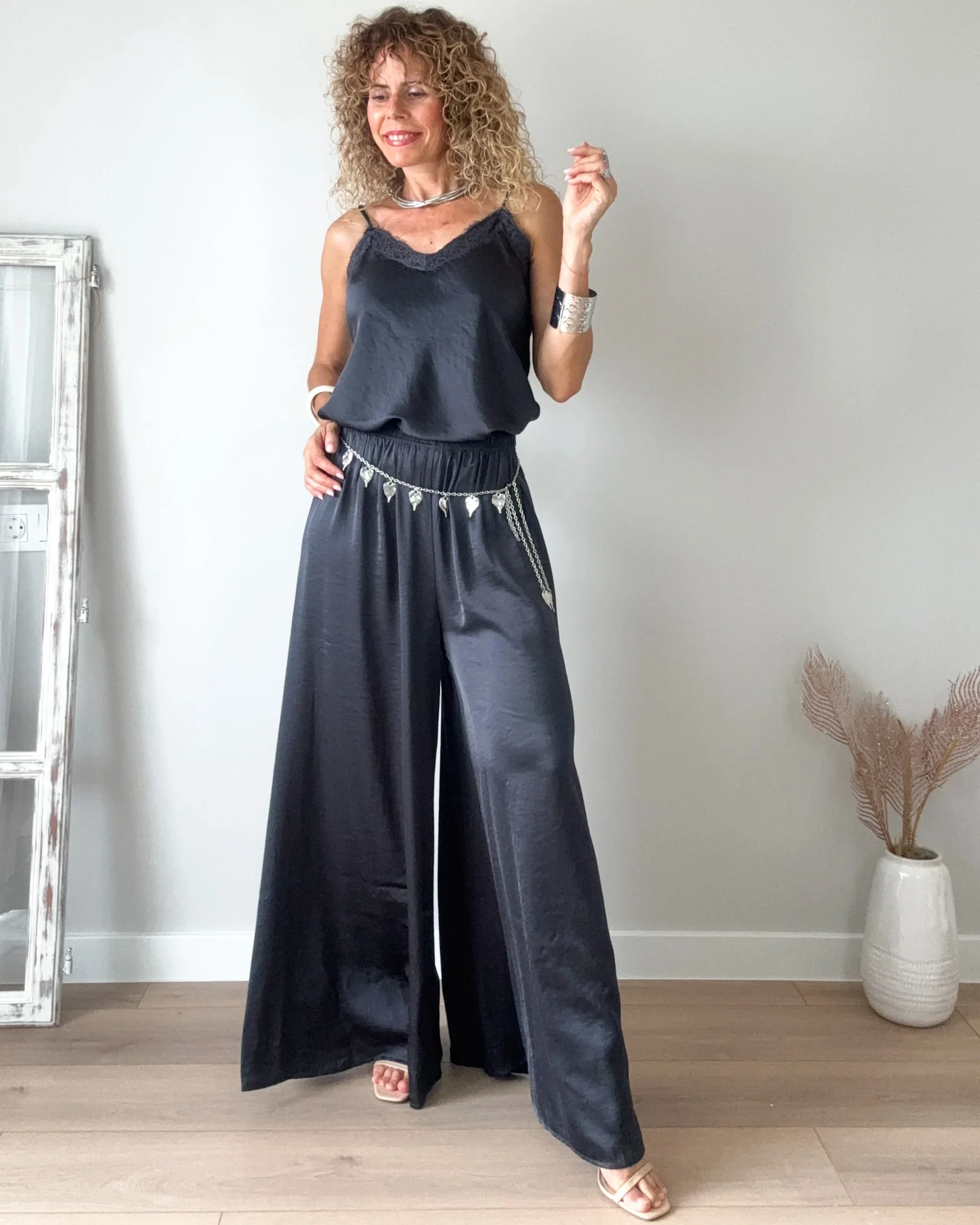 Pantalón amplio gris antracita de tejido satinado. Muy fresquito con cinturilla de goma y muy cómodo.
