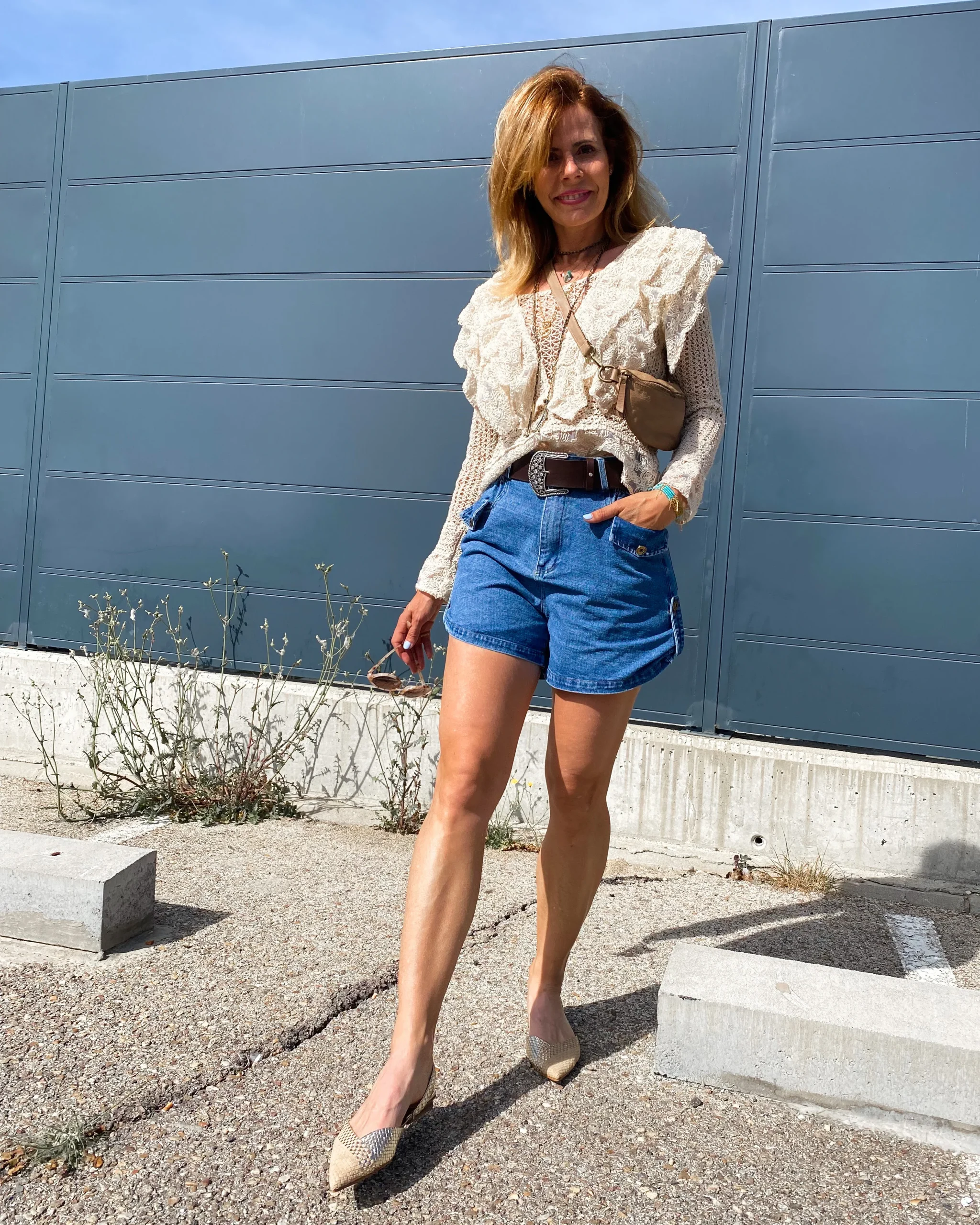 Jeans corto de tiro alto en vaquero. Bolsillos laterales y botones laterales. Cremallera en la parte delantera y goma en los bolsillos.