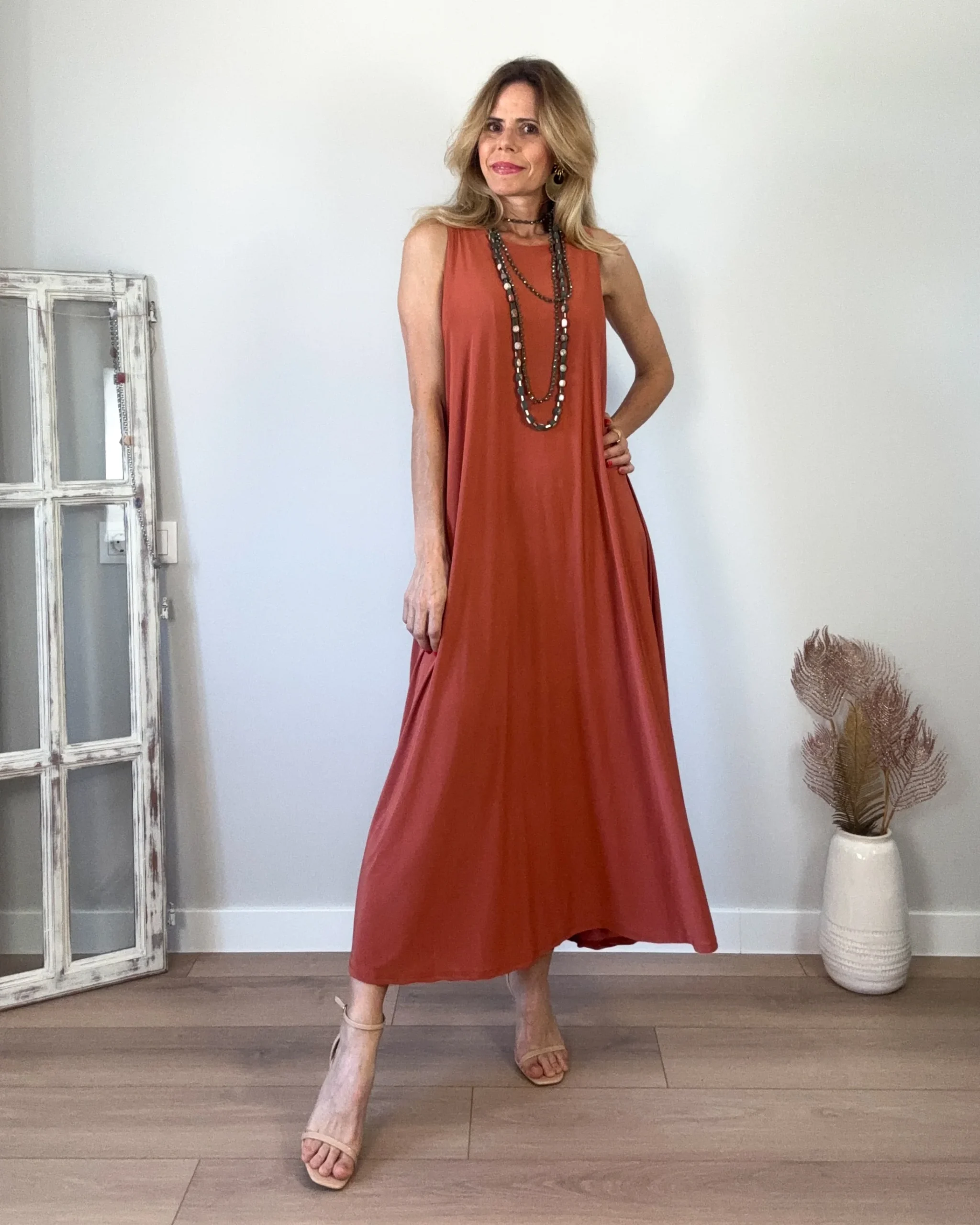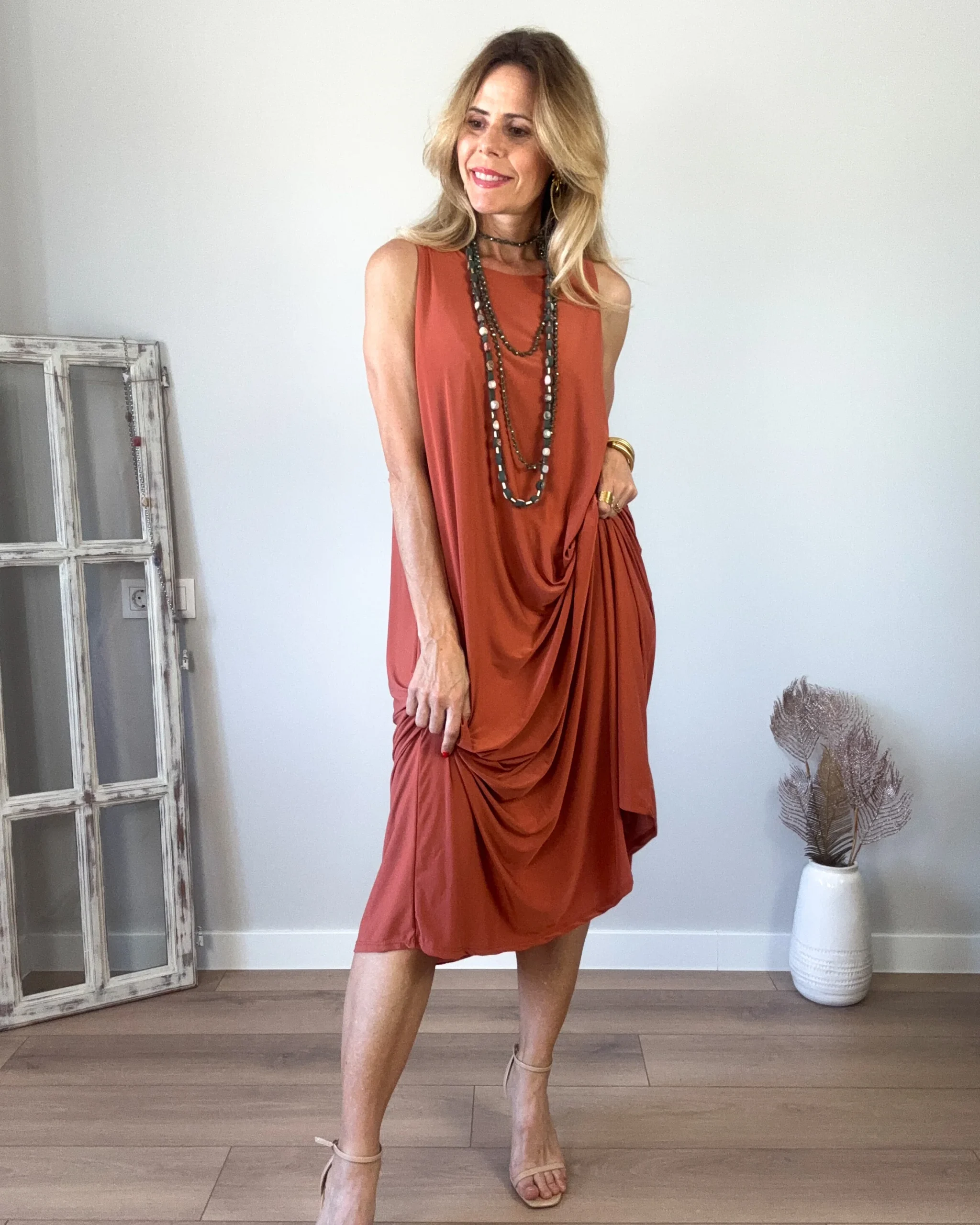 Vestido de punto frío largo color caldero. Tirante ancho muy cómodo y con espectacular caída.