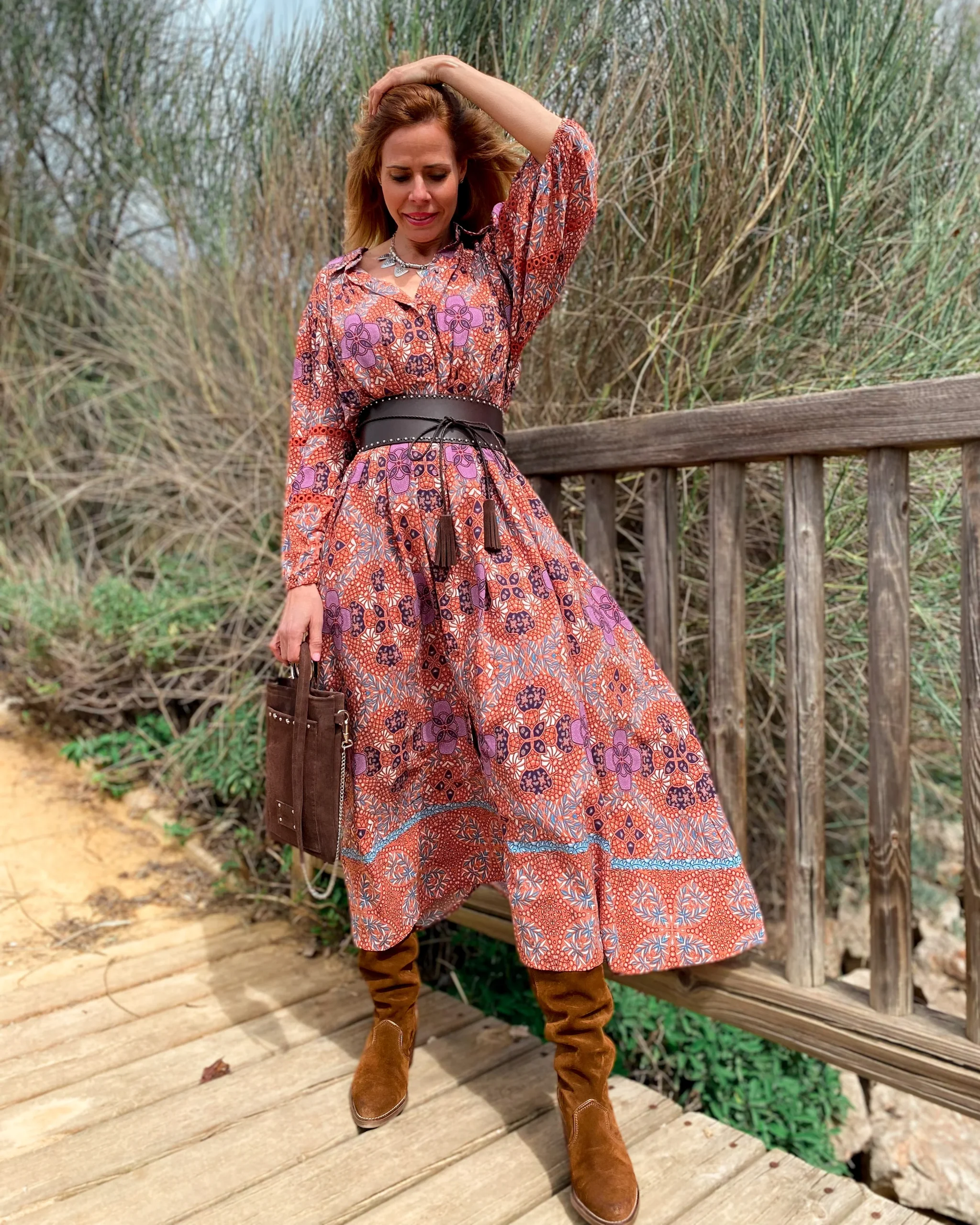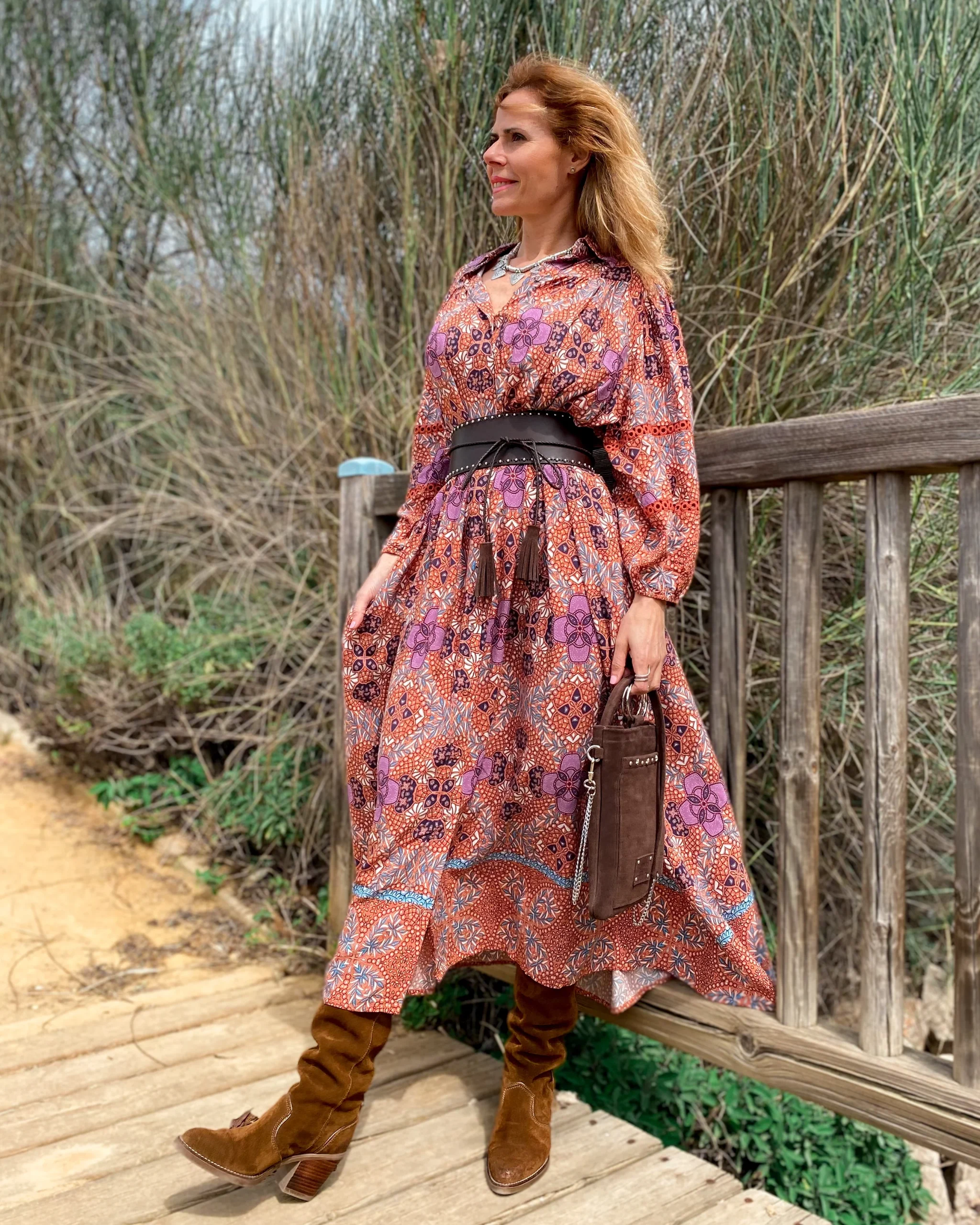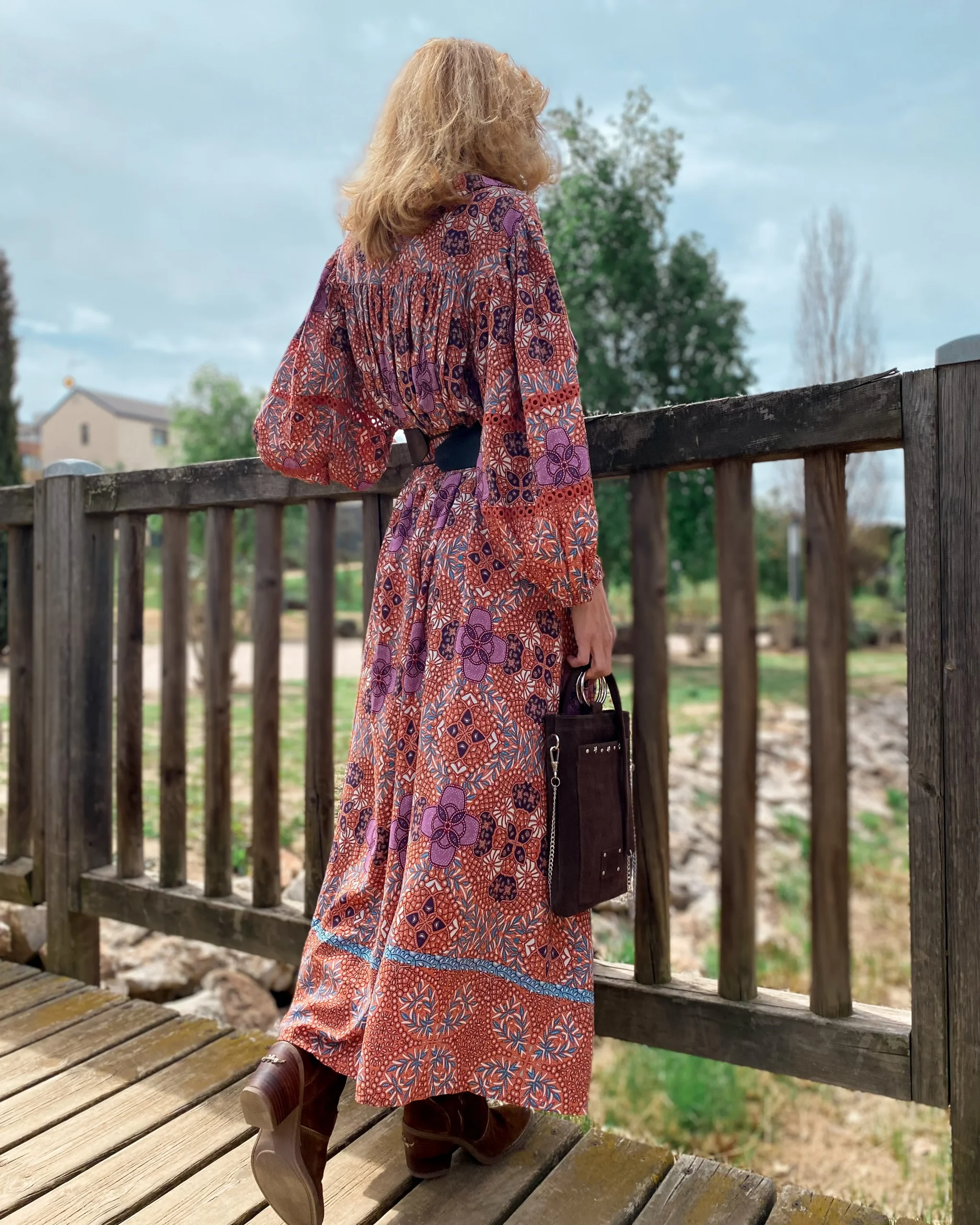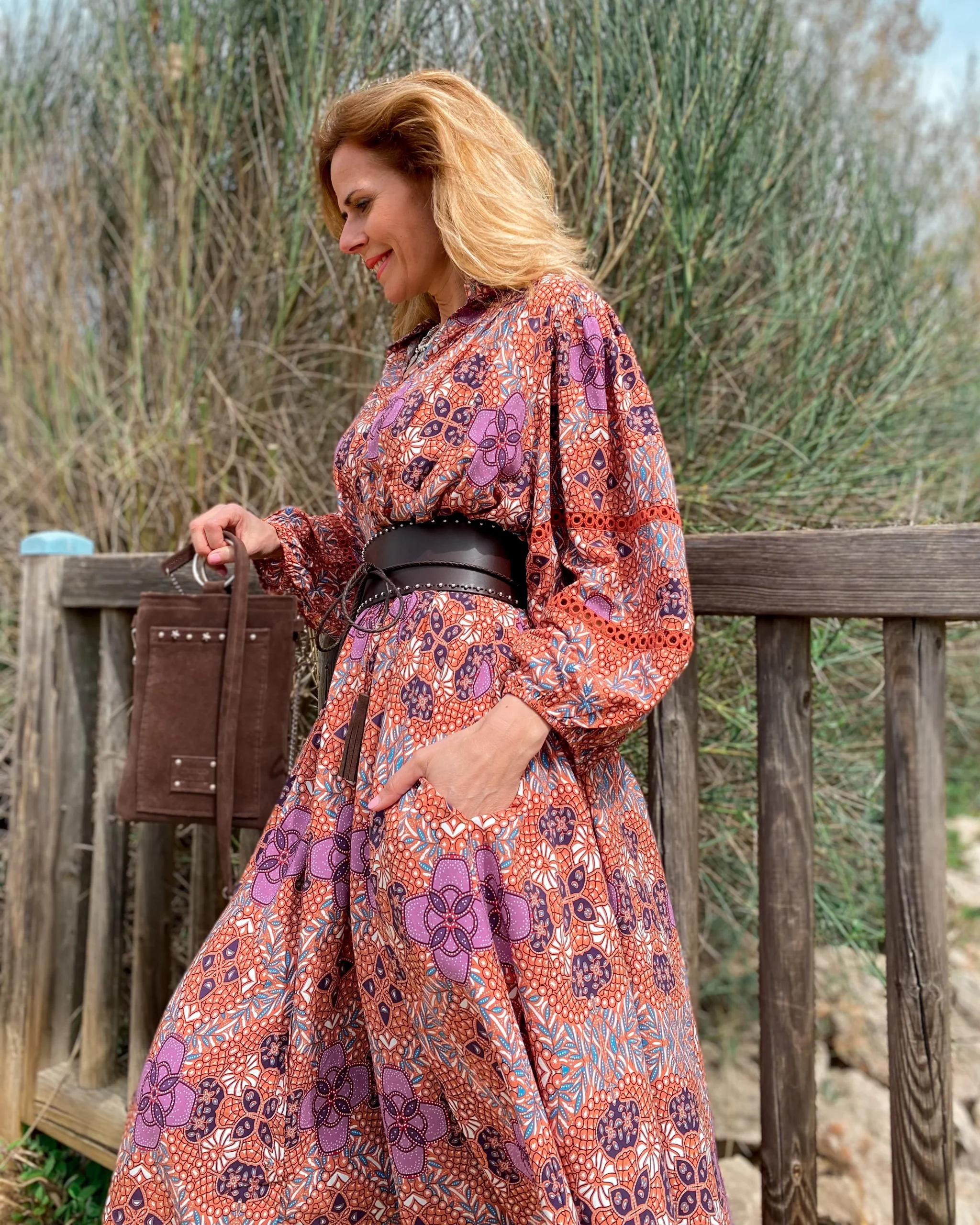 Vestido largo en tonos rojizos y tostados. Manga larga preciosa que aporta mucho volumen acabada con puño de goma. Cinturón de la misma tela. Bolsillos laterales y detalles de pasamanería.