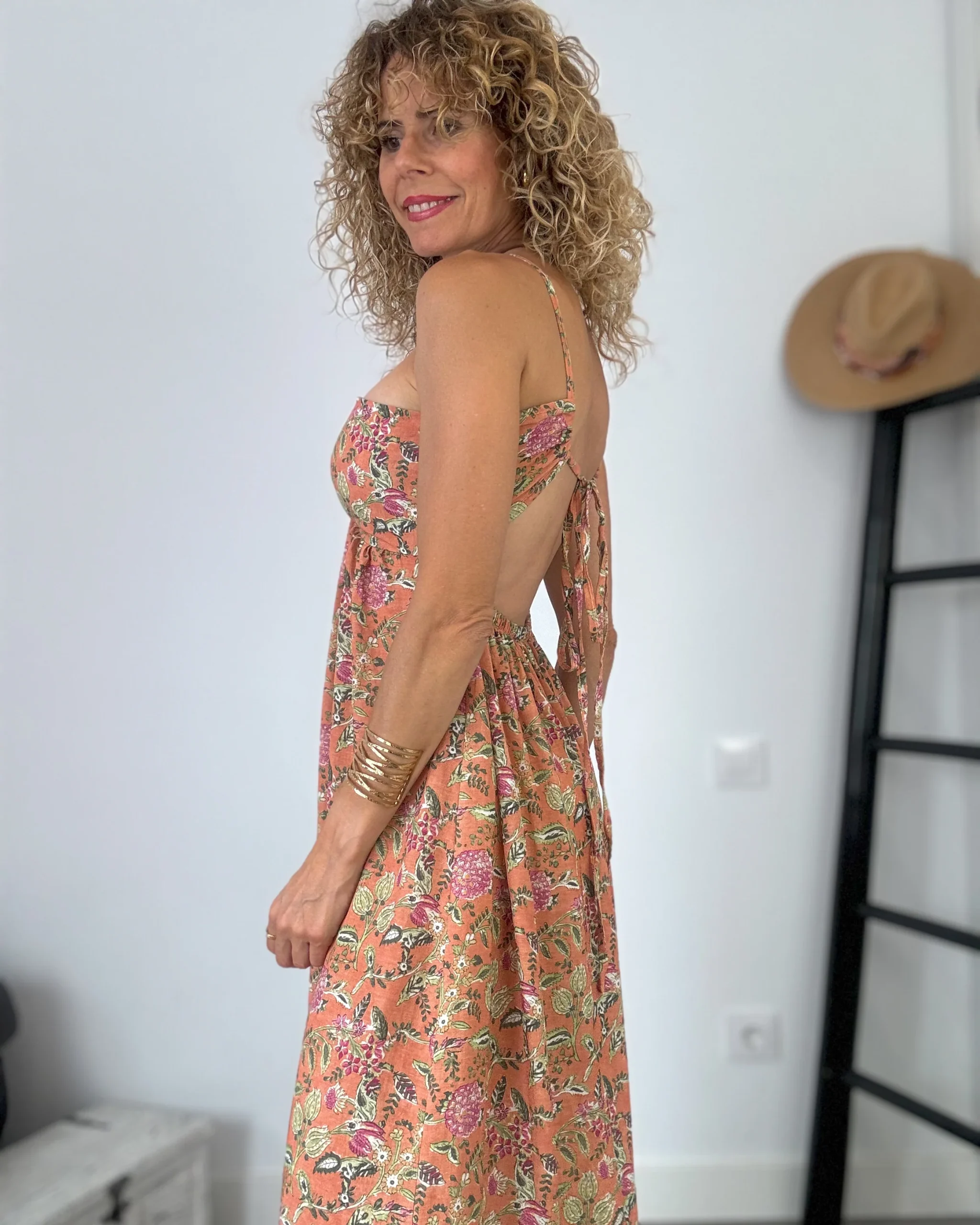 Vestido largo color anaranjado de tirante fino anidado en la espalda. Escote fruncido y marcado.
