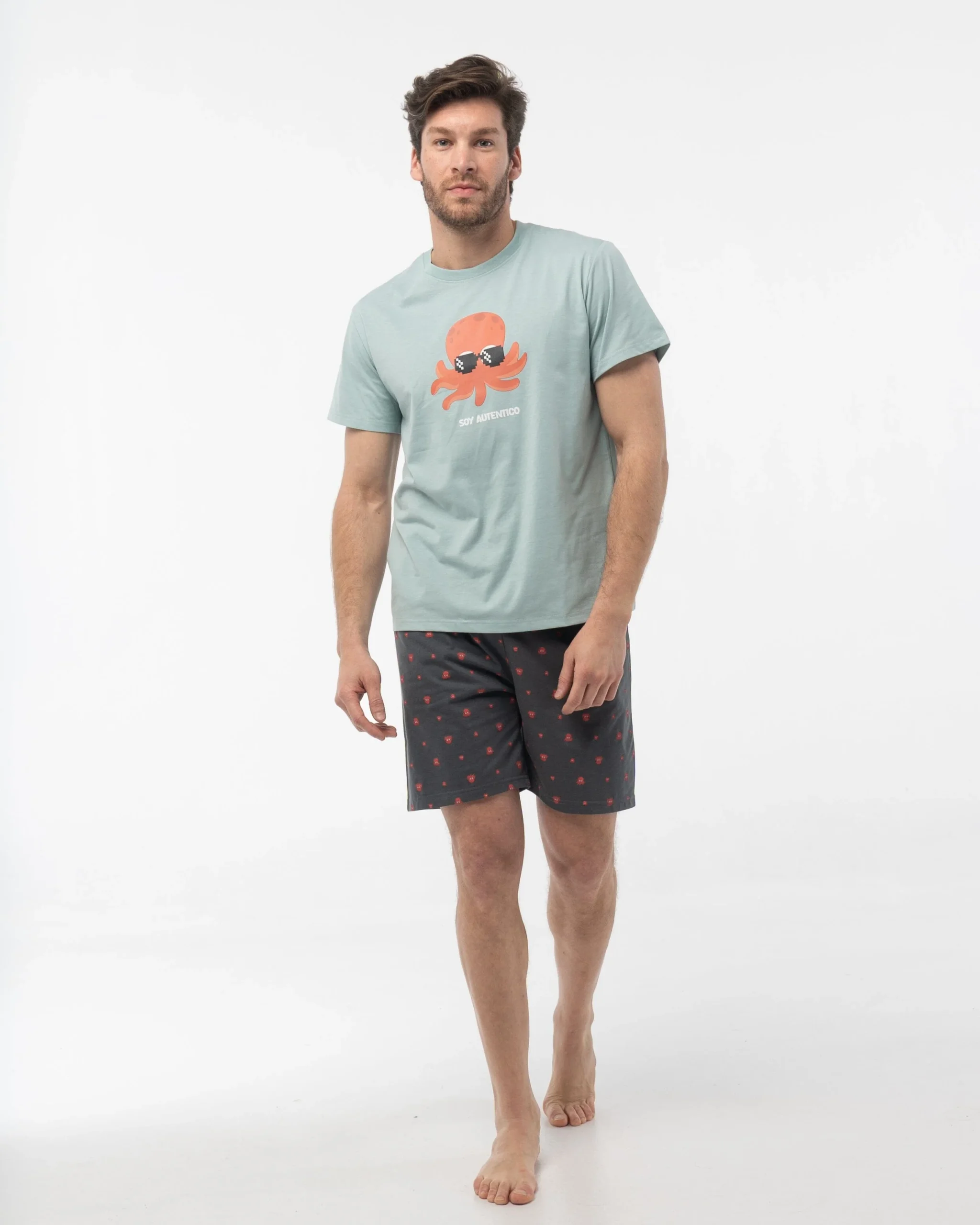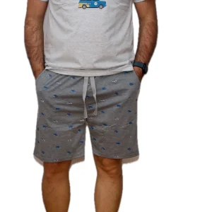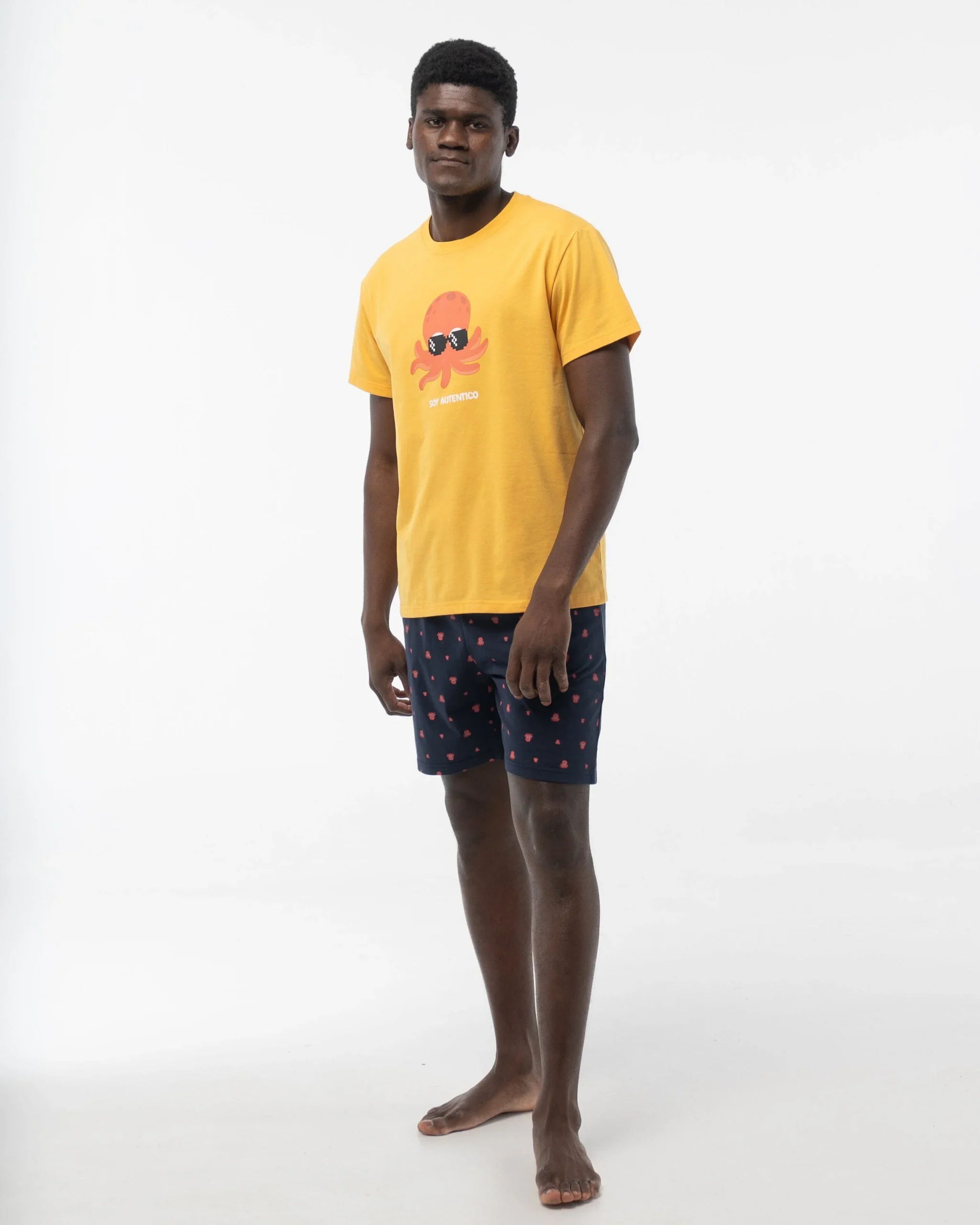 La camiseta de manga corta presenta un divertido estampado, mientras que el pantalón corto, con prácticos bolsillos y cintura ajustable con cordón, te ofrece un ajuste perfecto y la libertad de movimiento que necesitas para dormir a pierna suelta. El algodón en su composición garantiza una excelente transpirabilidad, manteniéndote fresco incluso en las noches más calurosas.