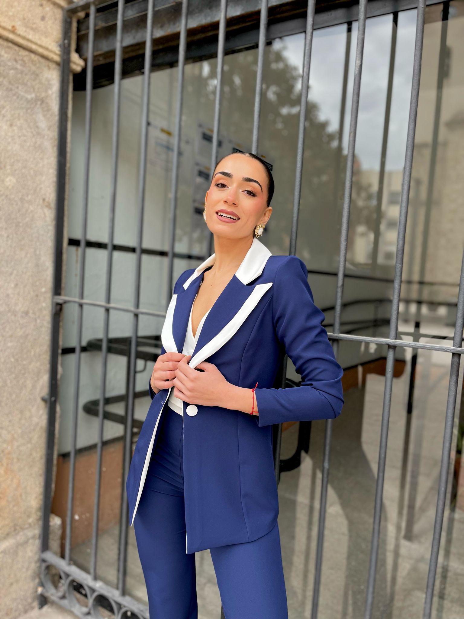 Americana con un patrón impecable, ribeteada en solapas y botón forrado en blanco, que incluye un «falso» chaleco incorporado en la chaqueta en tono blanco que le aporta un toque de elegancia y sofisticación.