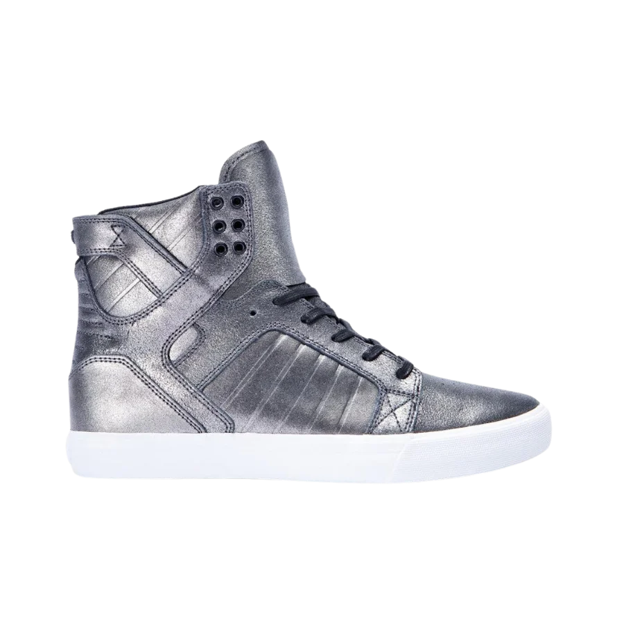 Las zapatillas SUPRA Skytop Kids cuentan con un elegante esquema de color peltre, blanco y negro que complementa la moda infantil, asegurando que se vean a la moda mientras disfrutan de un calzado cómodo.