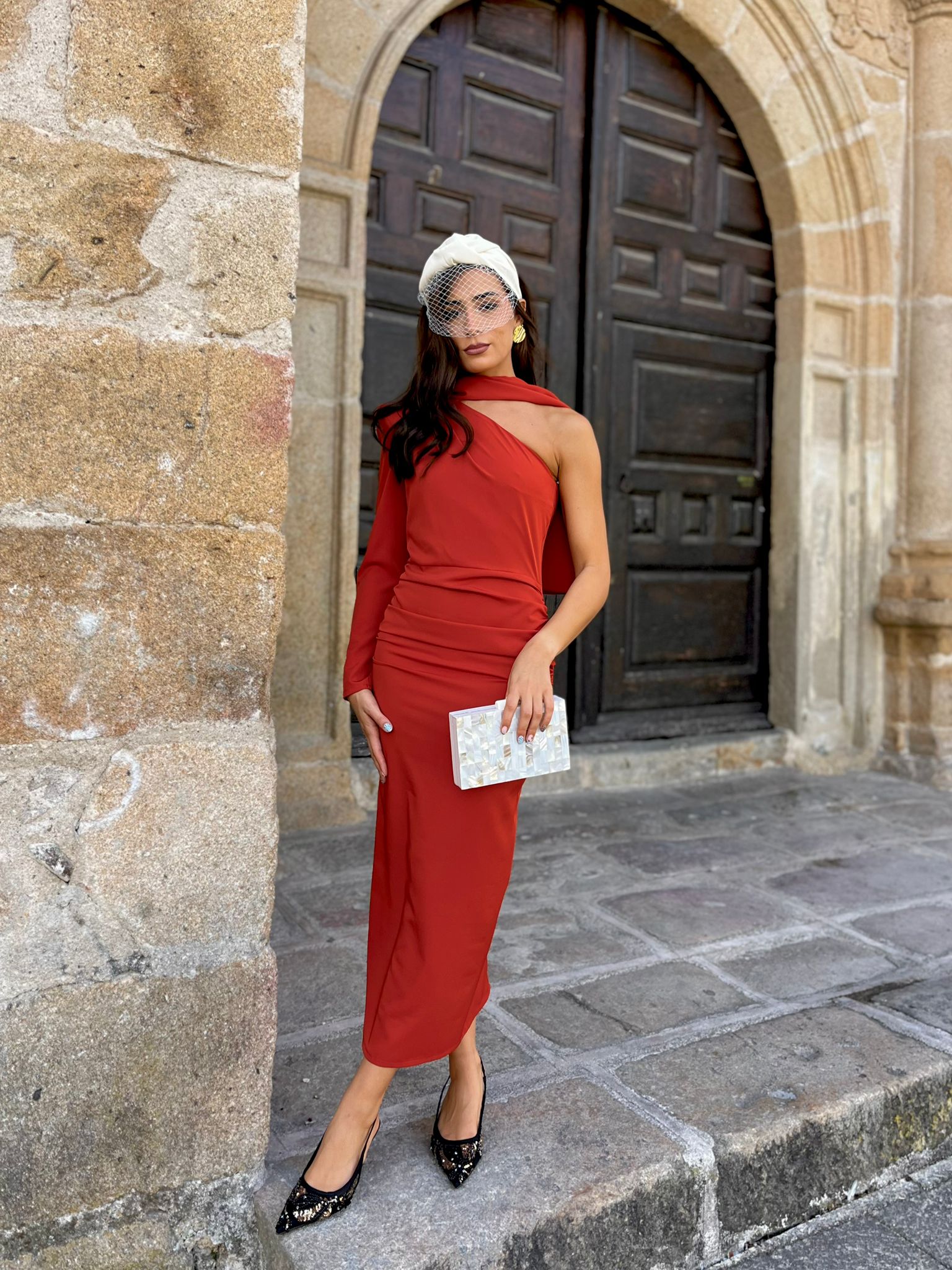 Lo hemos combinado con complementos en hueso ,cofre nácar gresite, pendiente moneda dorado y diadema Leticia Beige.