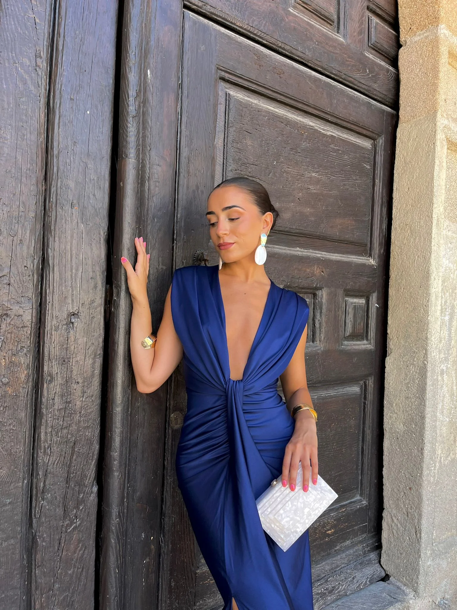 Vestido en punto de seda satinado en largo midi, hombreras y maxi-escote.