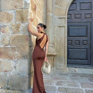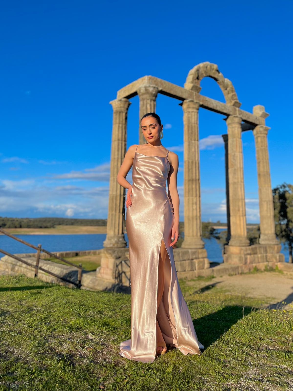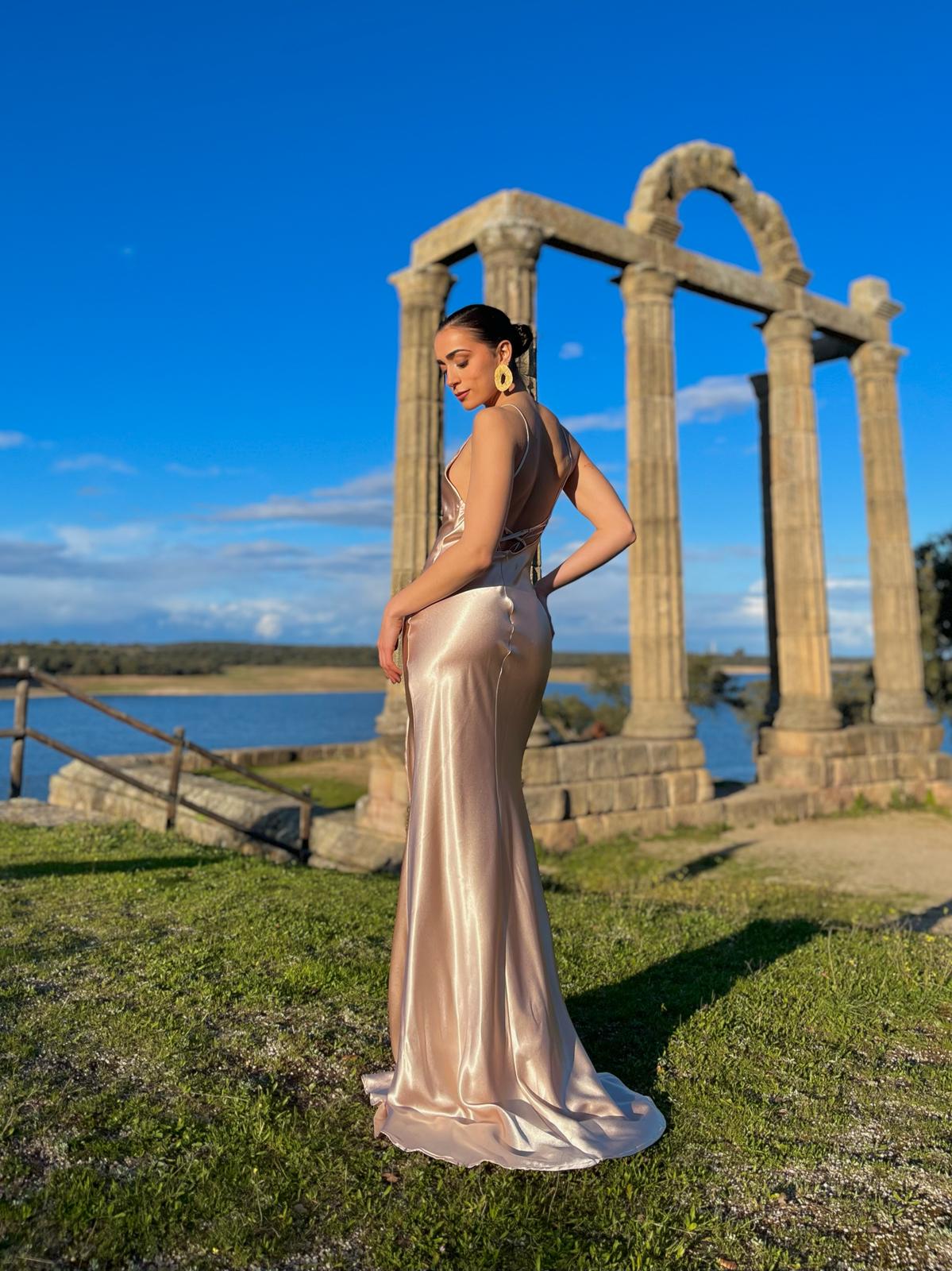 Largo con cola y tirante fino, con escotazo en espada y tirantes regulables cruzados.