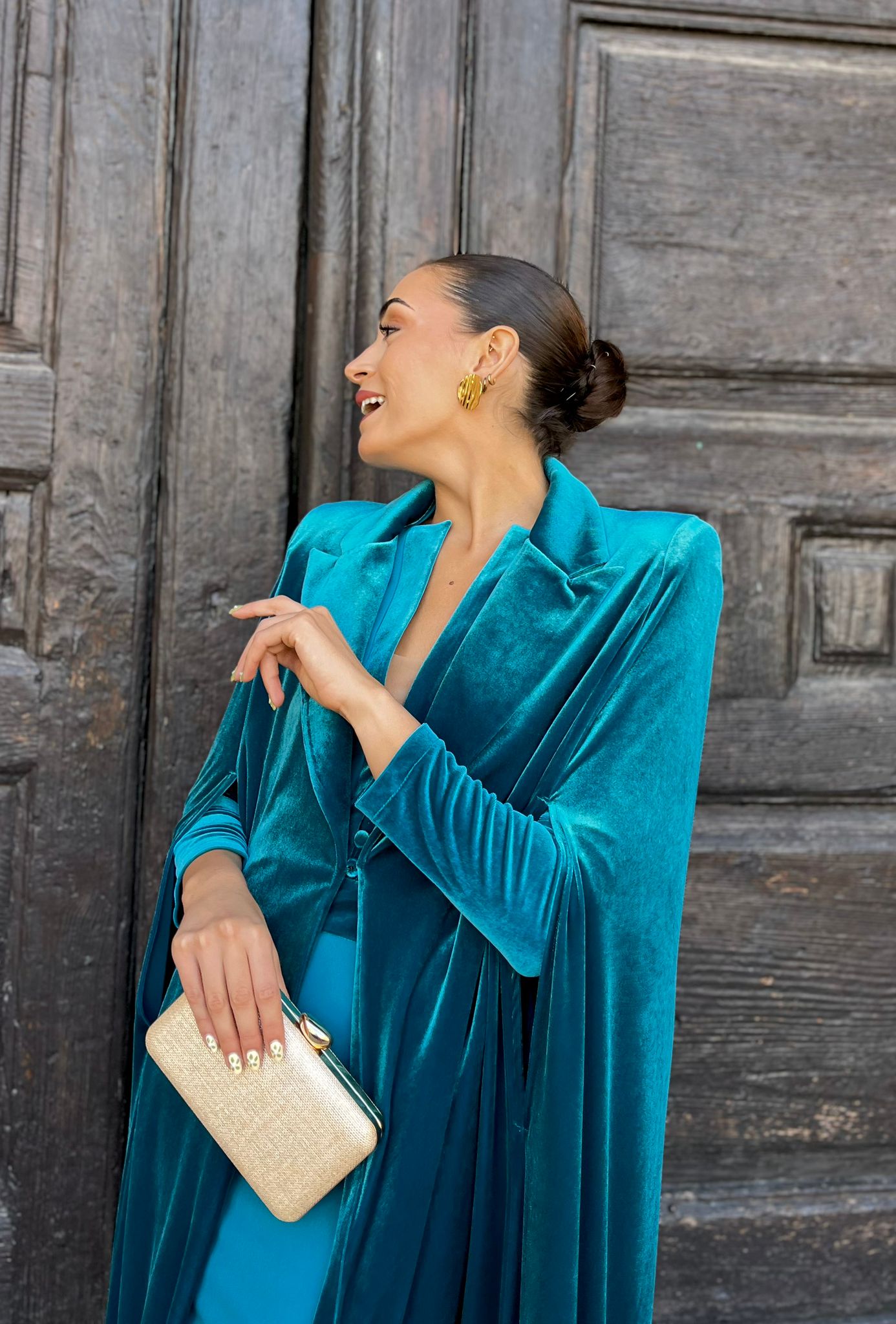 Manga larga en terciopelo, botones forrados y apliques de terciopelo sobre el crepé del vestido, creando un contraste muy bonito para invitadas de invierno.