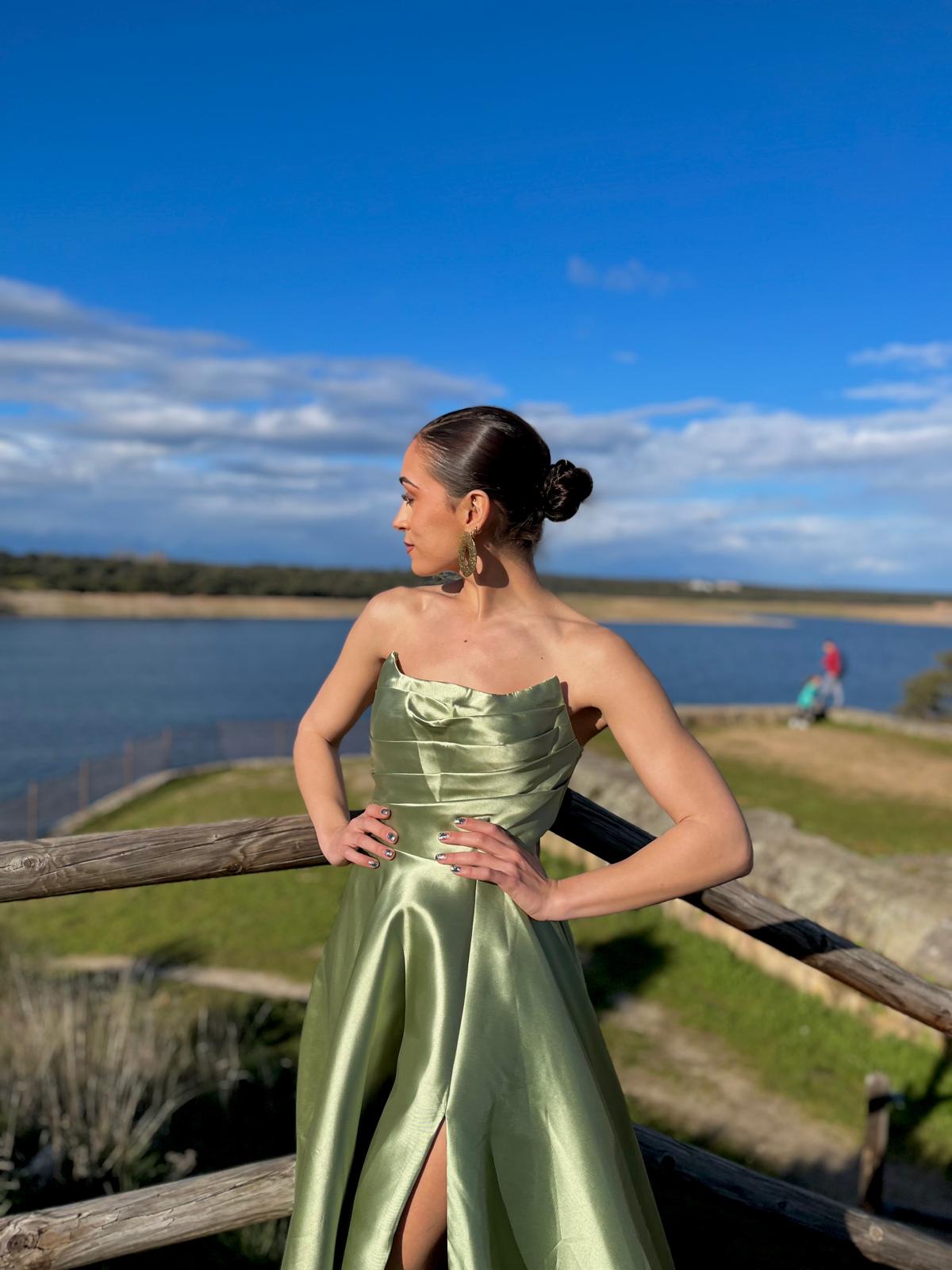 Palabra de honor con pliegues en la zona delantera y falda de amplio vuelo, metros y metros de tela confieren un vuelo espectacular a este modelo.