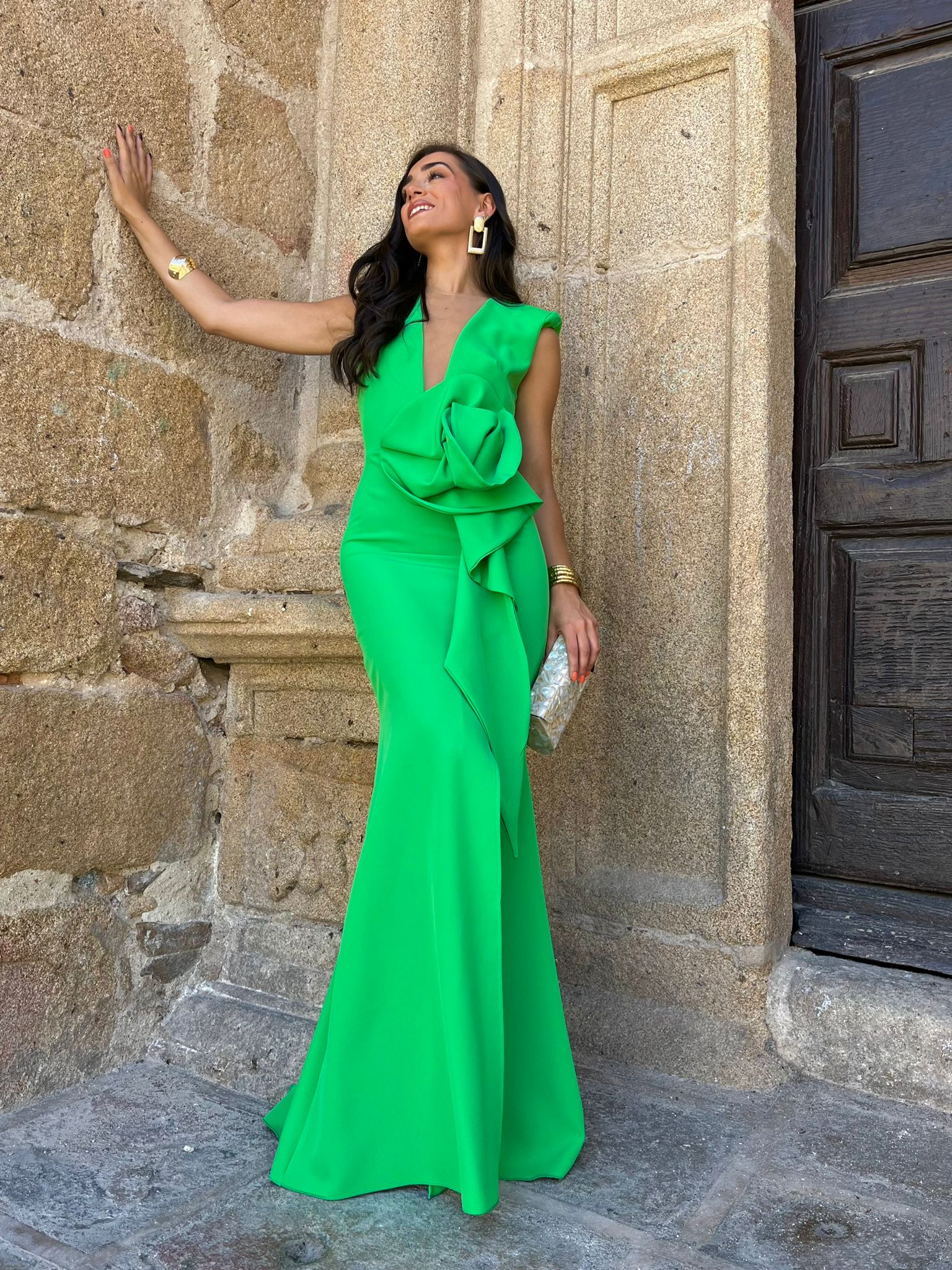 Elegante y femenino, en corte sirena con ligera cola y maxi flor delantera, una de las tendencias de la temporada y que crea un vestido muy favorecedor.