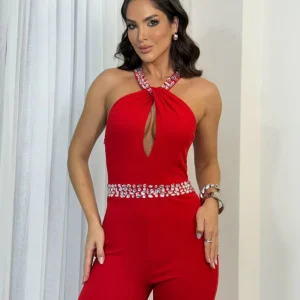 K3721 Xiomara Mono Largo Rojo con escote y detalles plateados